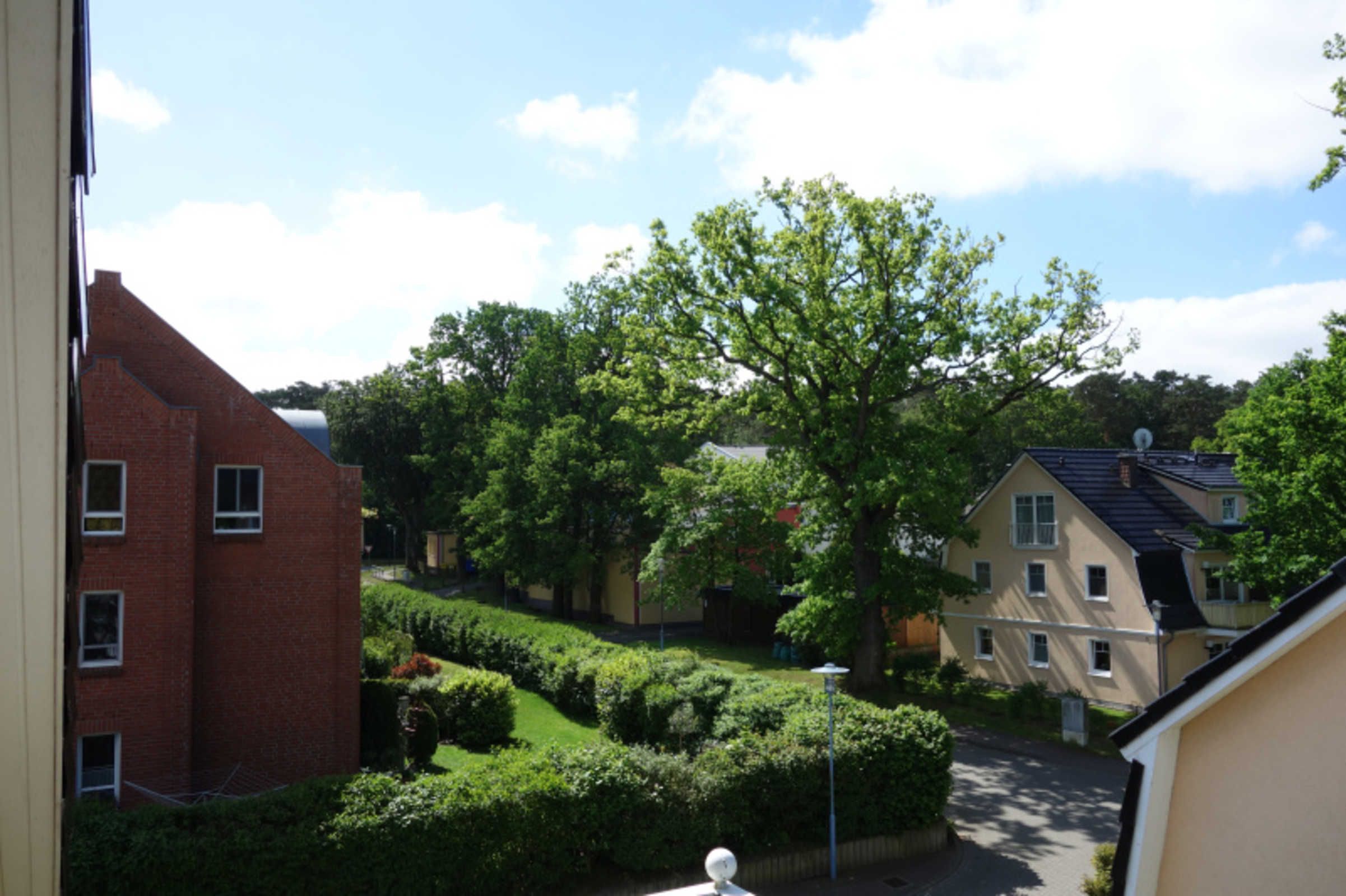 Von dem Balkon können Sie seitlich mit etwas Fantasie zwischen den Baumwipfeln bis vor an die Dünen schauen.