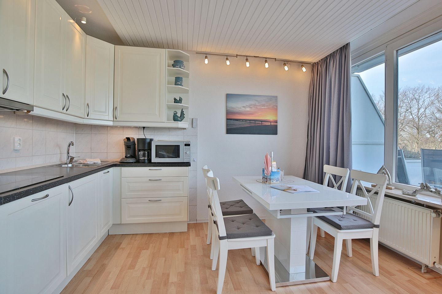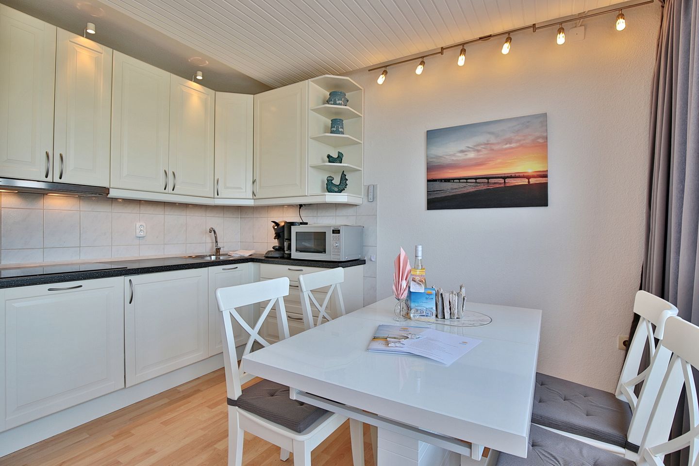 Von der gemütlichen Couchgarnitur kann man entspannt fernsehen oder aber auch nach einem Tag am Strand ausruhen. Eine Stereoanlage und eine I-Pod Dockingstation sorgen für Unterhaltung. Der angrenzende Esstisch im Küchenbereich bietet Platz für 4 Personen. Die moderne großzügige Küchenzeile lässt keine Wünsche offen. Sie bietet ein Ceranfeld mit 4 Kochfeldern, eine Mikrowelle, eine Spülmaschine, einen Kühlschrank mit Gefrierfach sowie eine Kaffeemaschine, eine Espressomaschine und einen Wasserkocher.