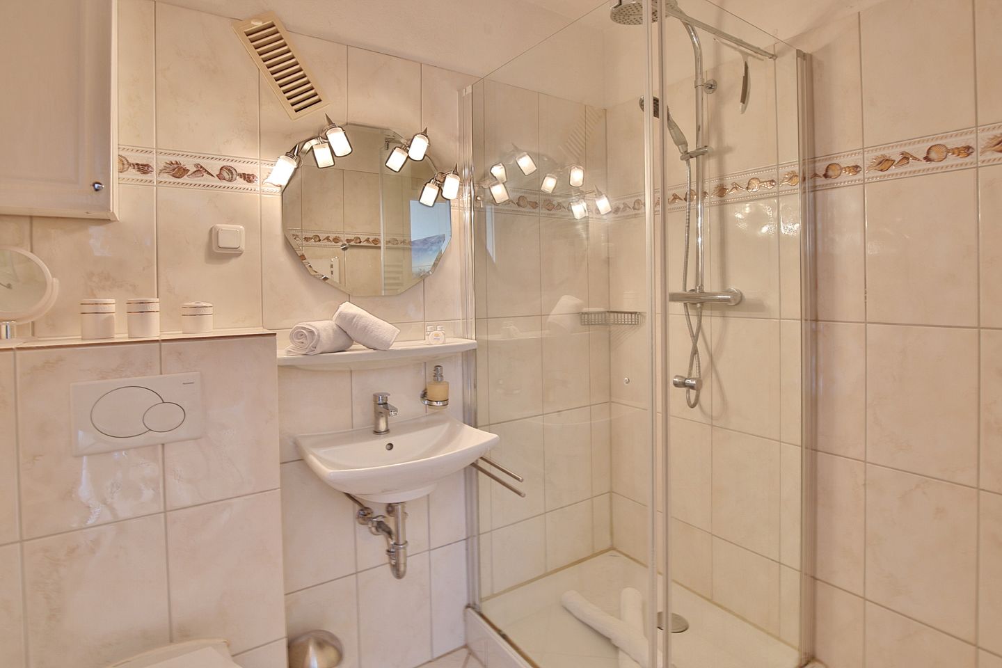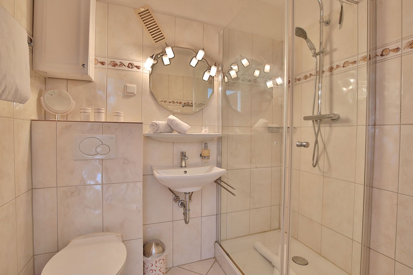 Im Badezimmer mit Dusche, Waschbecken und WC steht dem Gast auch ein Kosmetikspiegel sowie ein Fön zur Verfügung.
