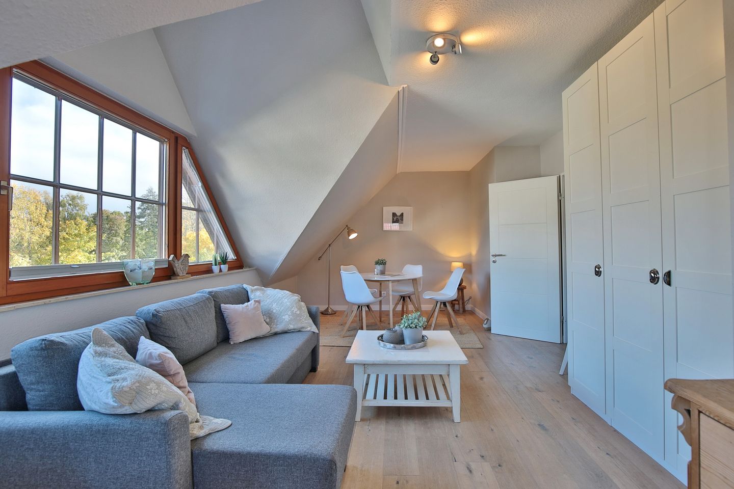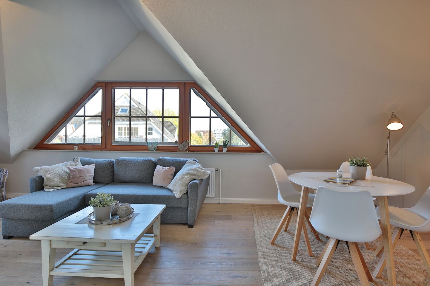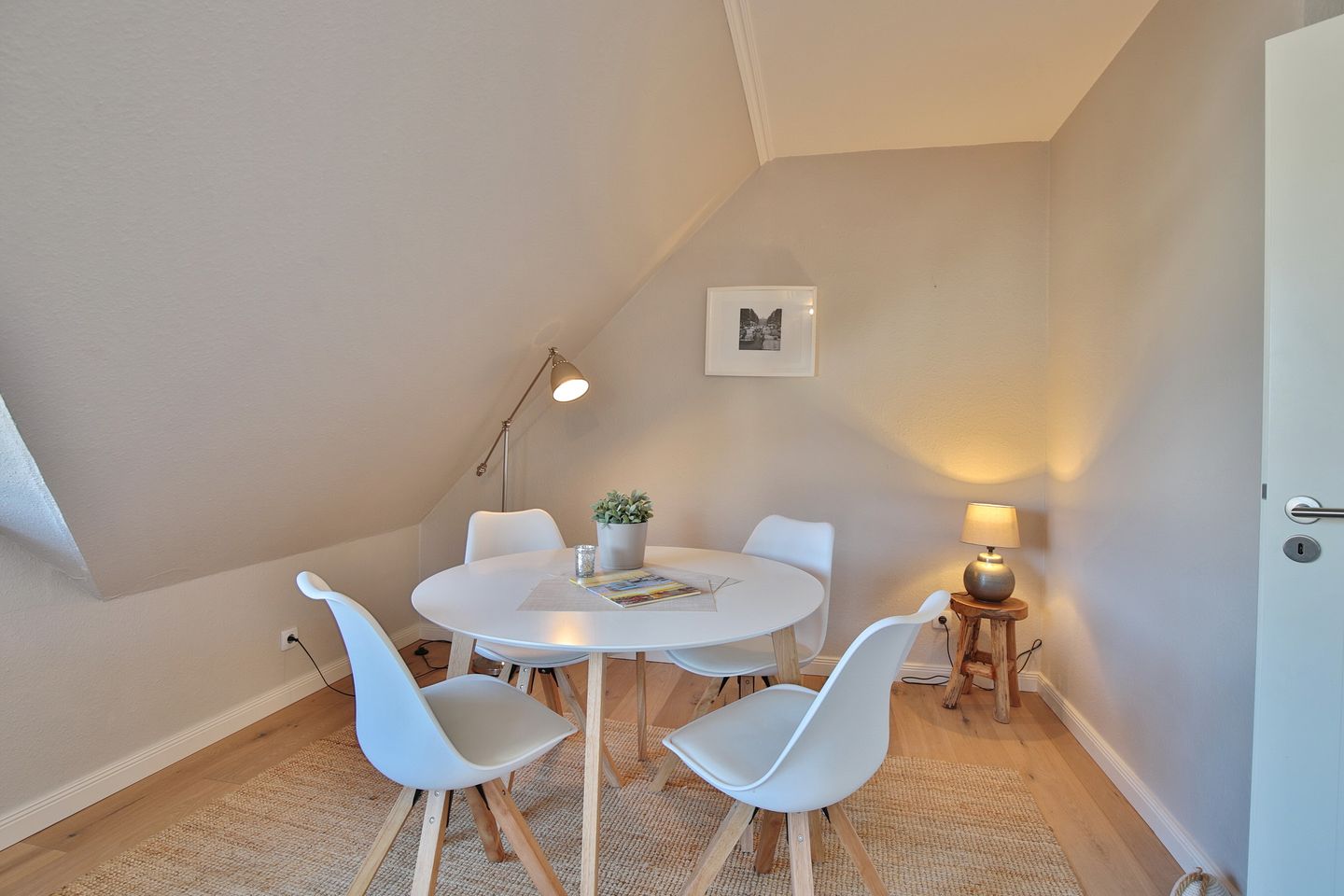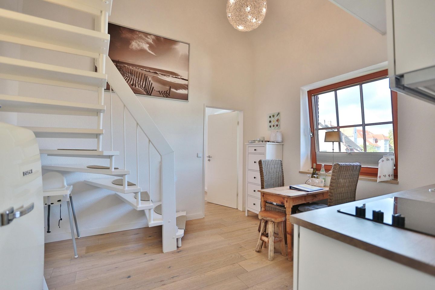 Die komfortable Ferienwohnung mit 65 qm² bietet Platz für bis zu 4 Personen und erstreckt sich über zwei Ebenen (Maisonette). Der Design-Holzfußboden verleiht der Wohnung eine warme und einladende Atmosphäre.