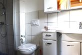 Im hell gefliesten Duschbad ist ein Spiegelschrank mit genügend Stauraum. Die Dusche ist barrierefrei.