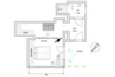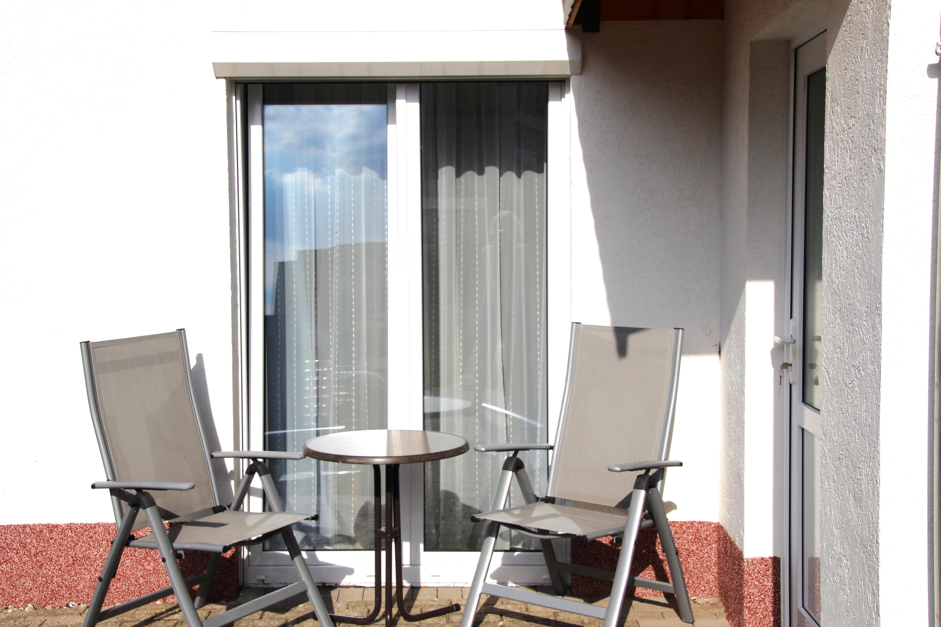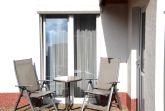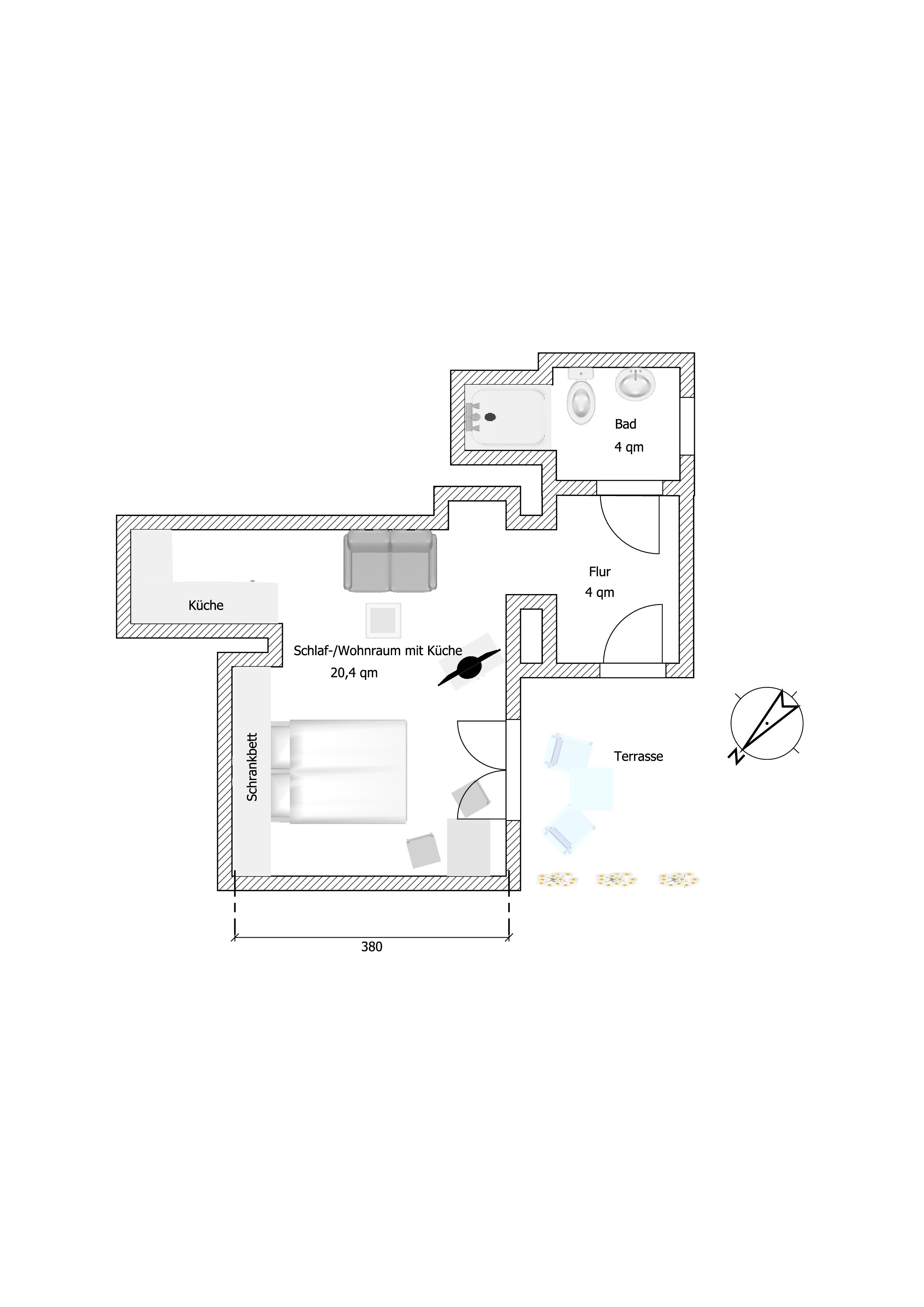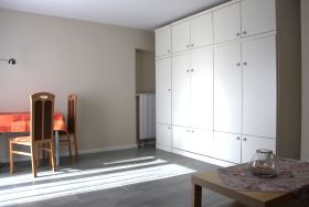 Das Apartment ist ca. 32 qm groß und gefliest. Im Wohn-/Schlafraum befinden sich ein Schrankbett und ein 2er-Sofa mit Beistelltisch sowie ein Esstisch und ein 32 Zoll TV sowie Radio. Die Küchenzeile ist mit einem 4-Platten-Ceranfeld, einem Kühlschrank mit Gefrierfach, Mikrowelle, Kaffeemaschine, Toaster und Wasserkocher ausgestattet. Geschirr, Töpfe, Pfanne und Gläser gehören auch dazu.