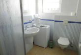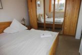 Im Schlafzimmer steht ein Doppelbett und ein Kleiderschrank. Im gefliesten Bad sind eine Dusche und ein WC sowie eine Waschmaschine.