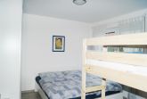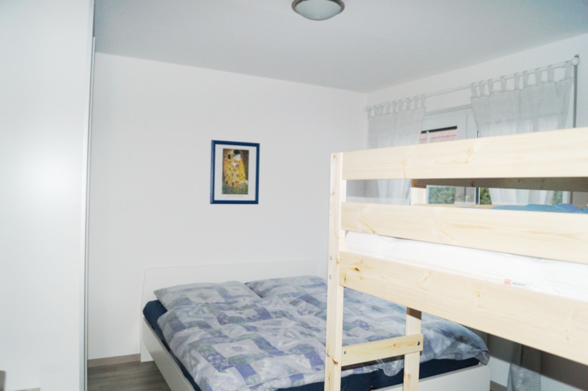 Im Schlafzimmer steht ein Doppelbett, ein Etagenbett und ein Kleiderschrank.