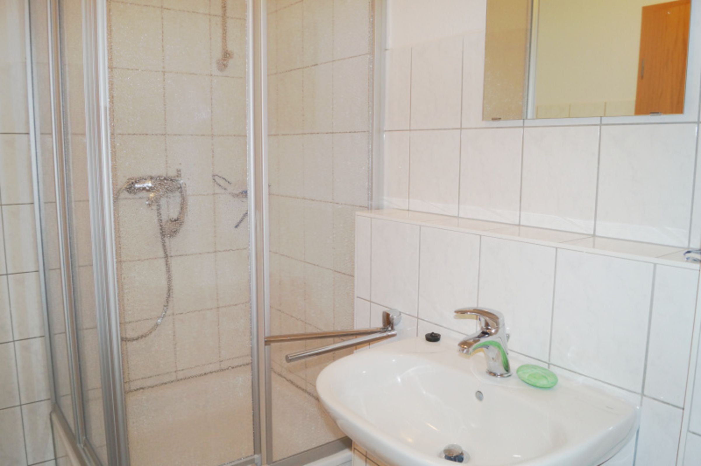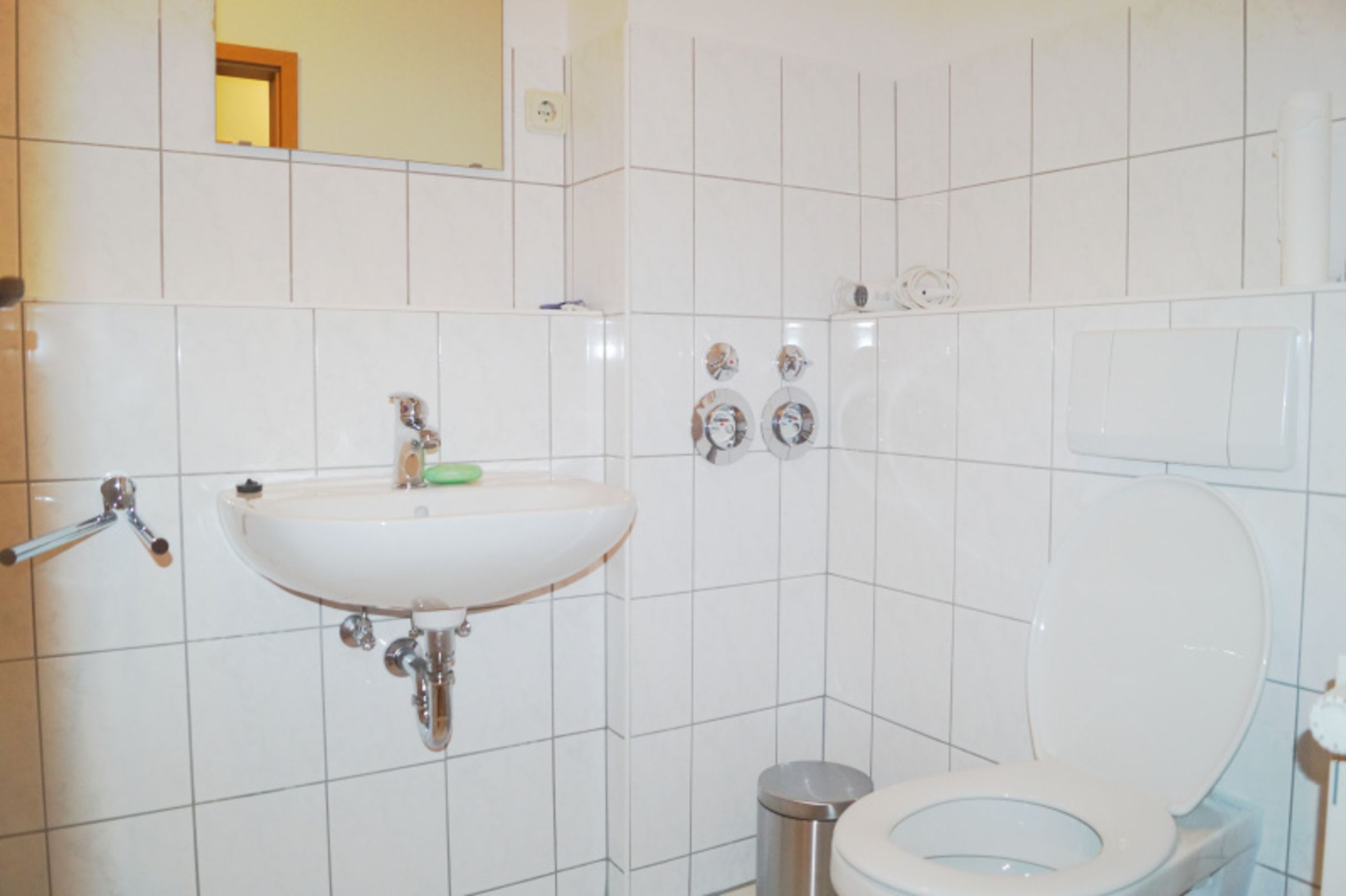 Im gefliesten Bad befinden sich eine Dusche und ein WC.