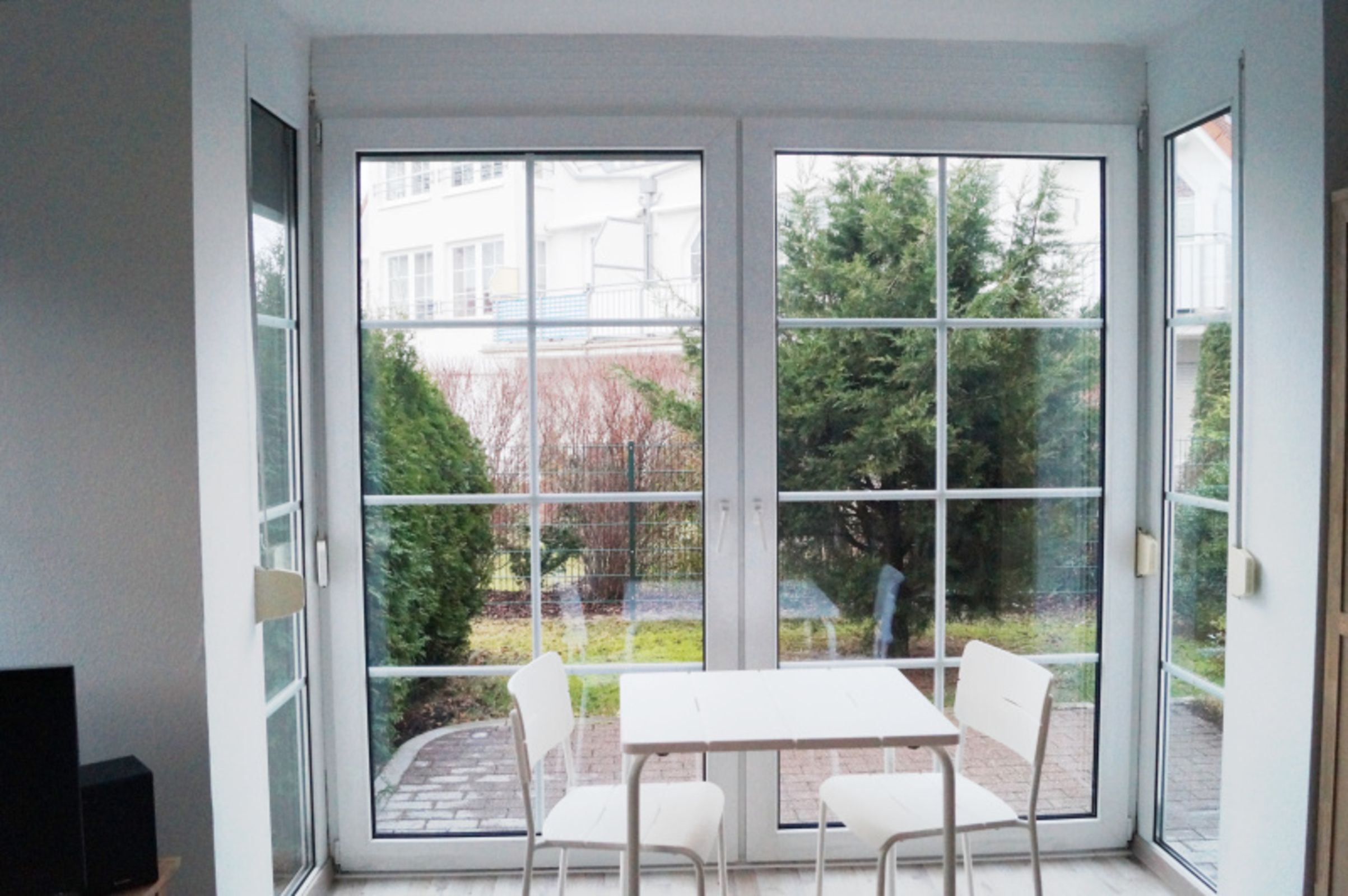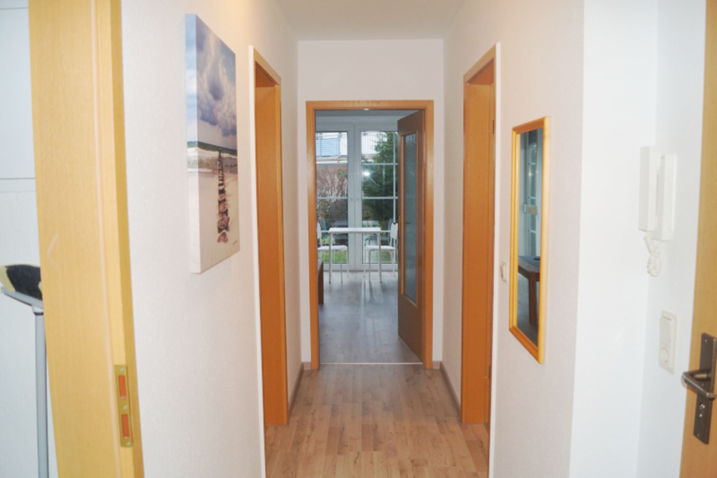 Ihre Ferienwohnung befindet sich im Erdgeschoss und verfügt über eine Terrasse mit Blick auf das Nachbargrundstück vom Kiebitzweg.