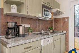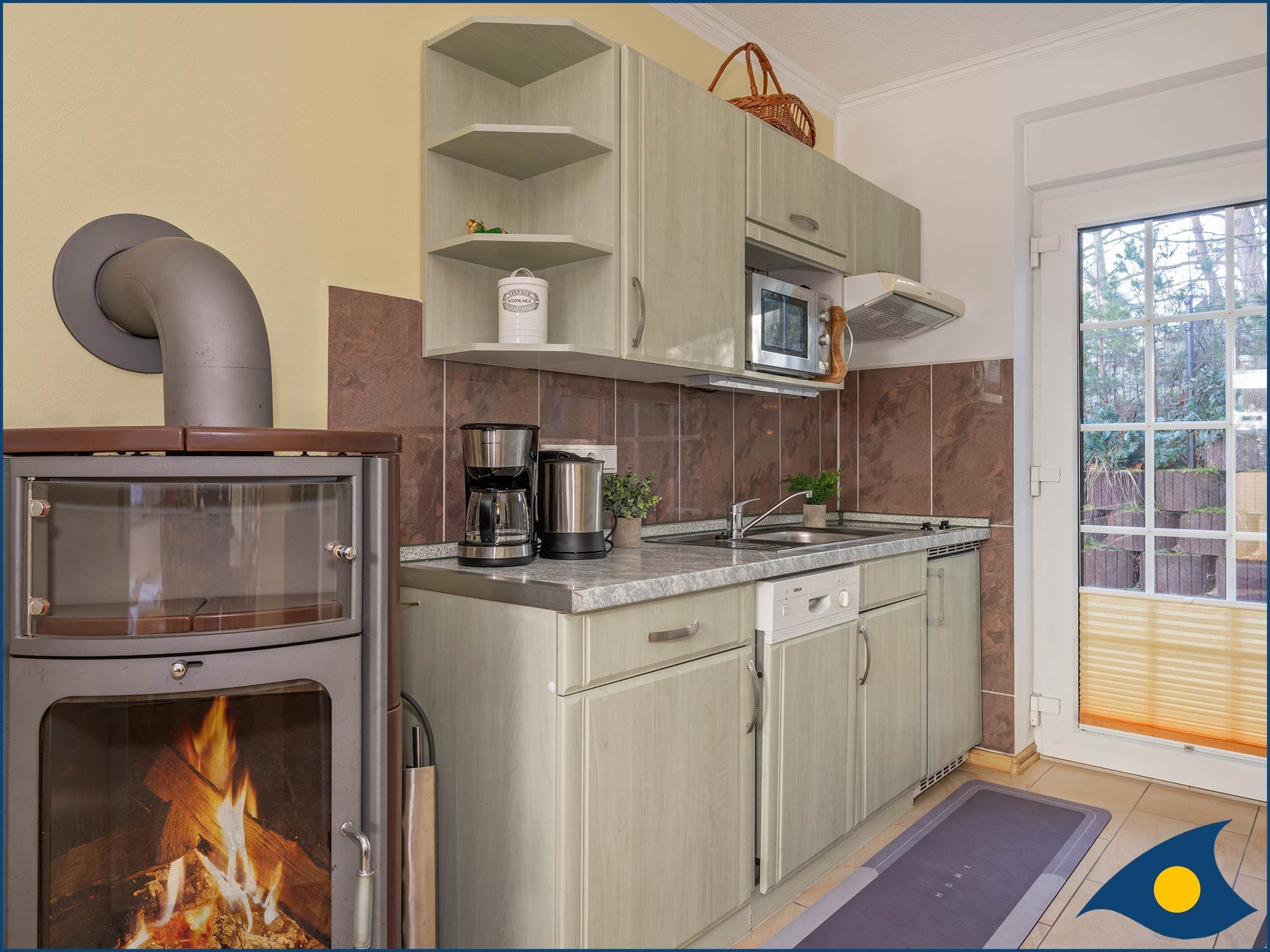 Des Weiteren steht Ihnen ein Kamin, sowie eine Küchenzeile mit einer Spülmaschine und einer kleinen Essecke zur Verfügung.