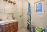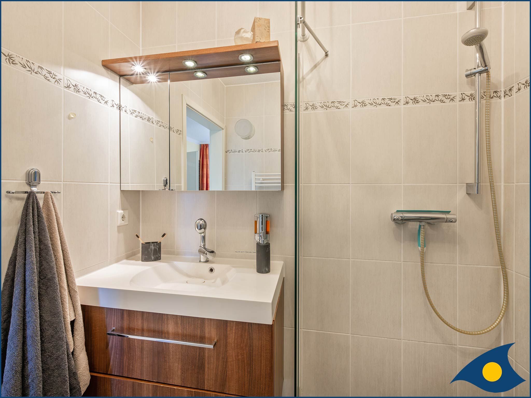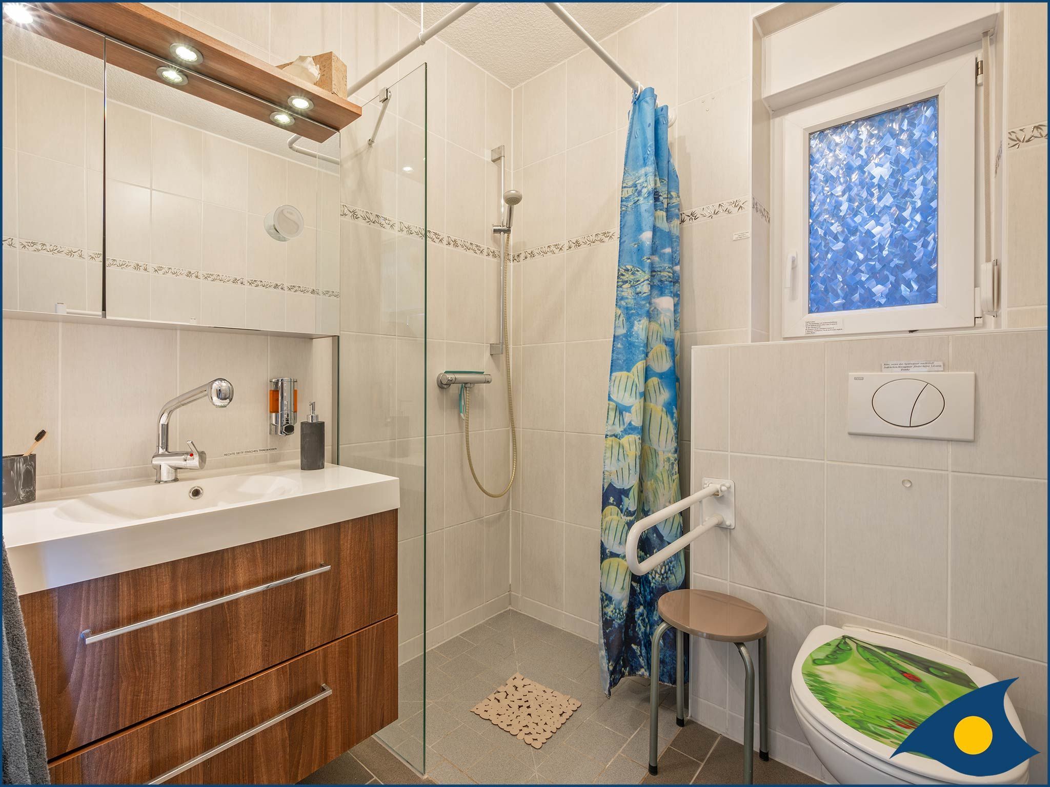 Das Badezimmer verfügt über eine ebenerdige Dusche und eignet sich somit auch für Rollstuhlfahrer.