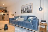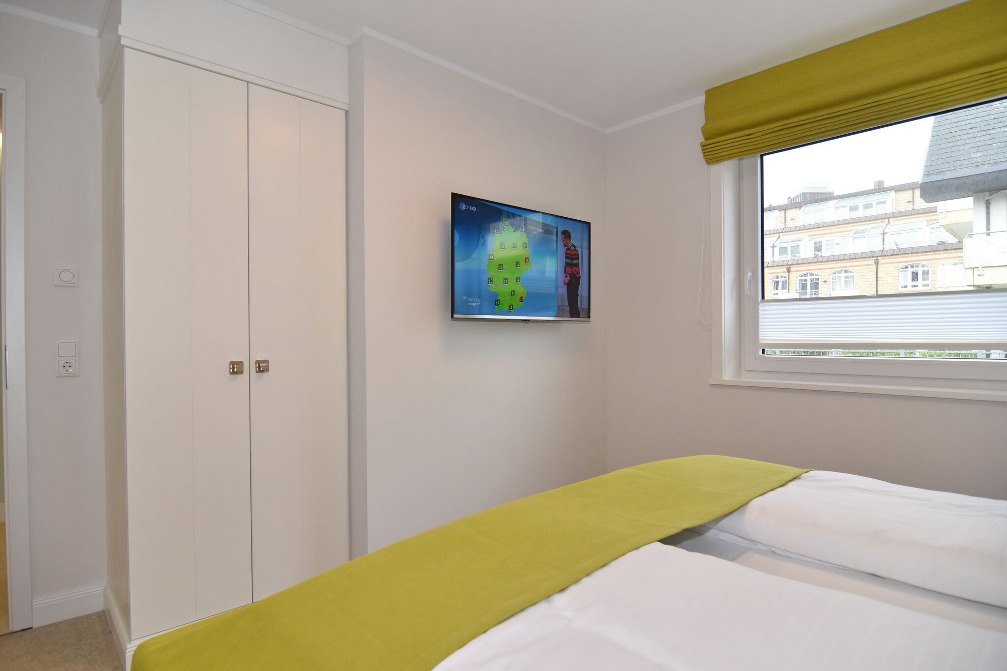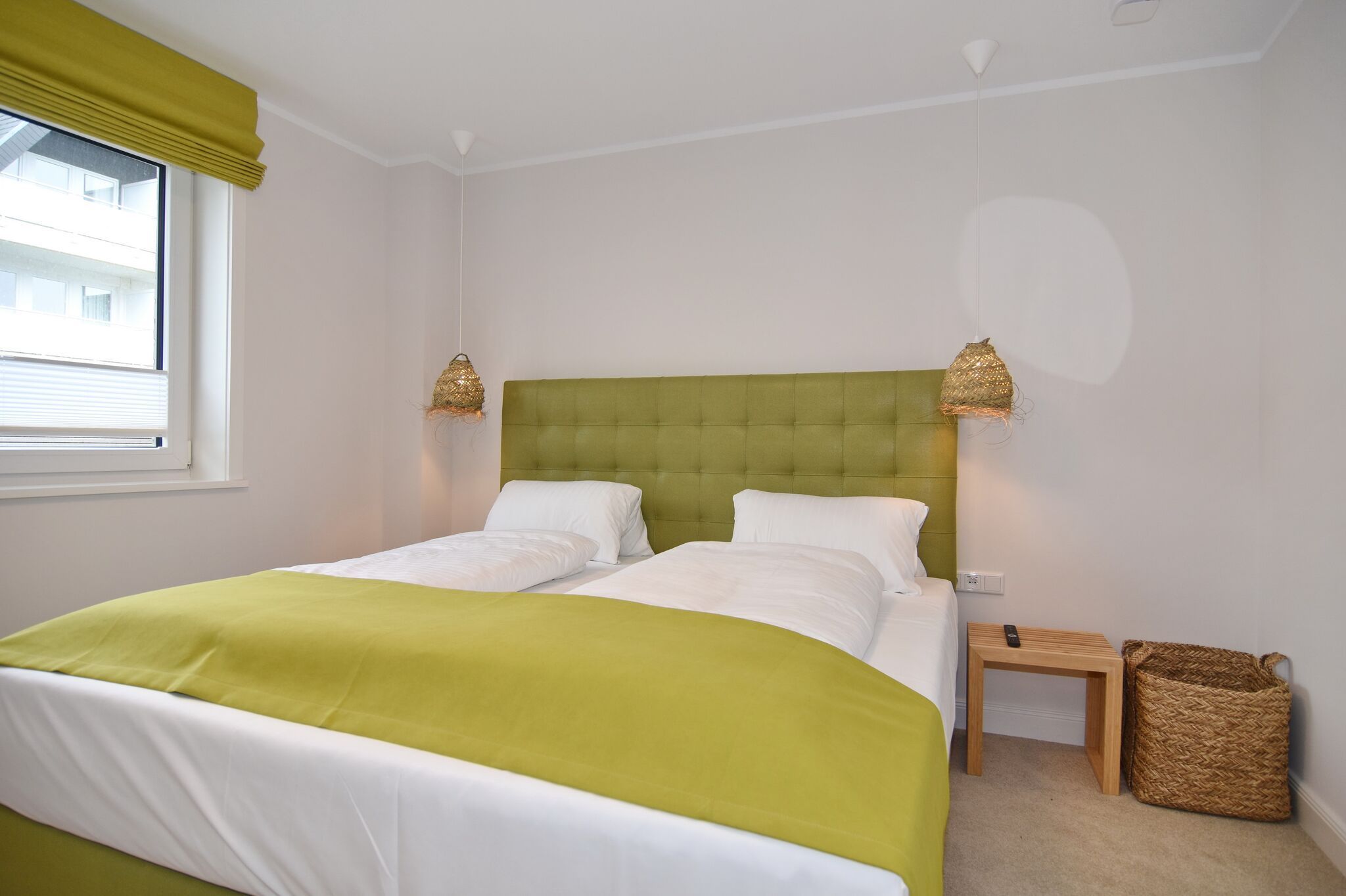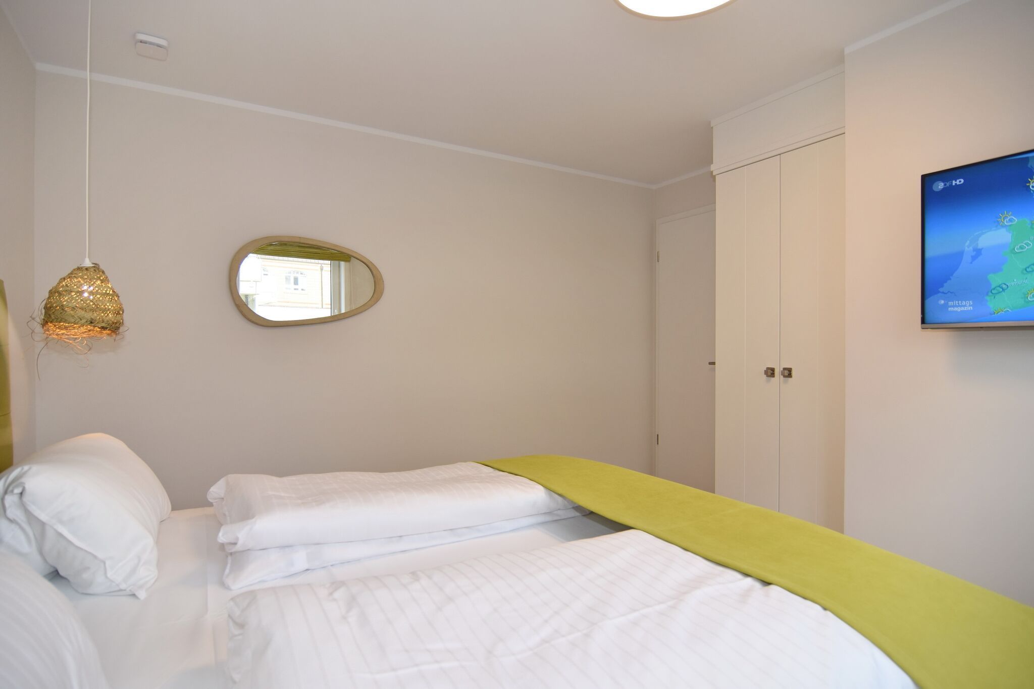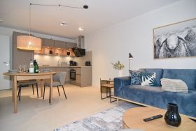 Die hochwertige 3-Zimmer-Erdgeschosswohnung mit ca. 60 qm ist für maximal 3 Personen ausgestattet. Vom geräumigen Flur mit Garderobe gelangen Sie in das Wohnzimmer mit offener Küche und möblierter Südterrasse. Die hochwertige Küche bietet neben Induktionsherd auch Geschirrspüler, Kühlschrank mit Gefrierfach und Backofen mit integrierter Mikrowelle. Die Wohnung bietet Ihnen zwei Schlafräume und ein Duschbad /WC mit Haar- und Handtuchtrockner. Das große Schlafzimmer ist mit einem Boxspringbett (200x200) der Marke FBF, Flat-TV und Einbauschrank ausgestattet (1 Kinderbett zubuchbar), das kleine Schlafzimmer hat ein vom Tischler eingebautes Einzelbett (90x200) und einen kleinen Einbauschrank.