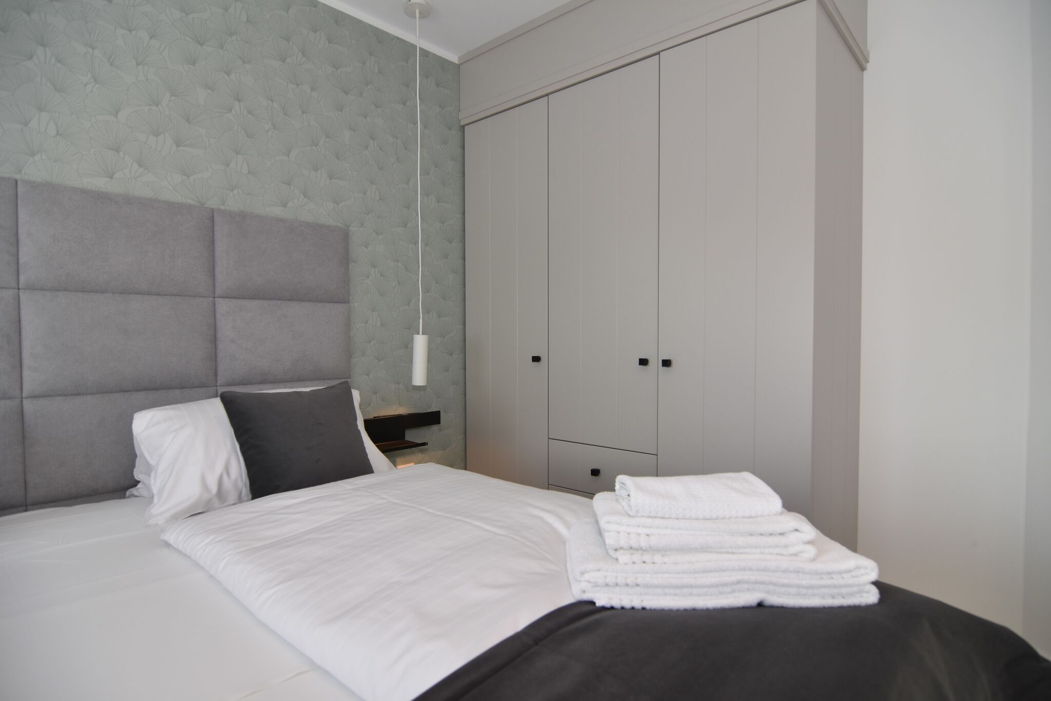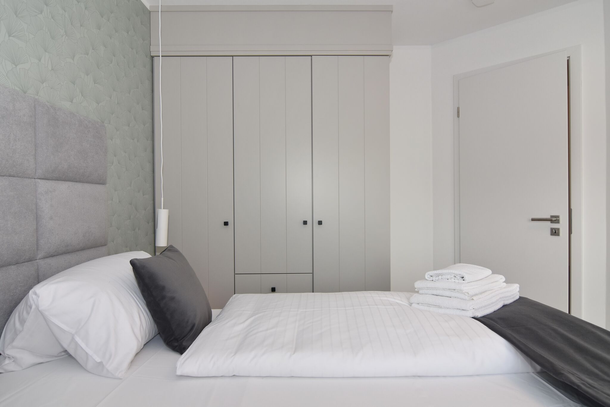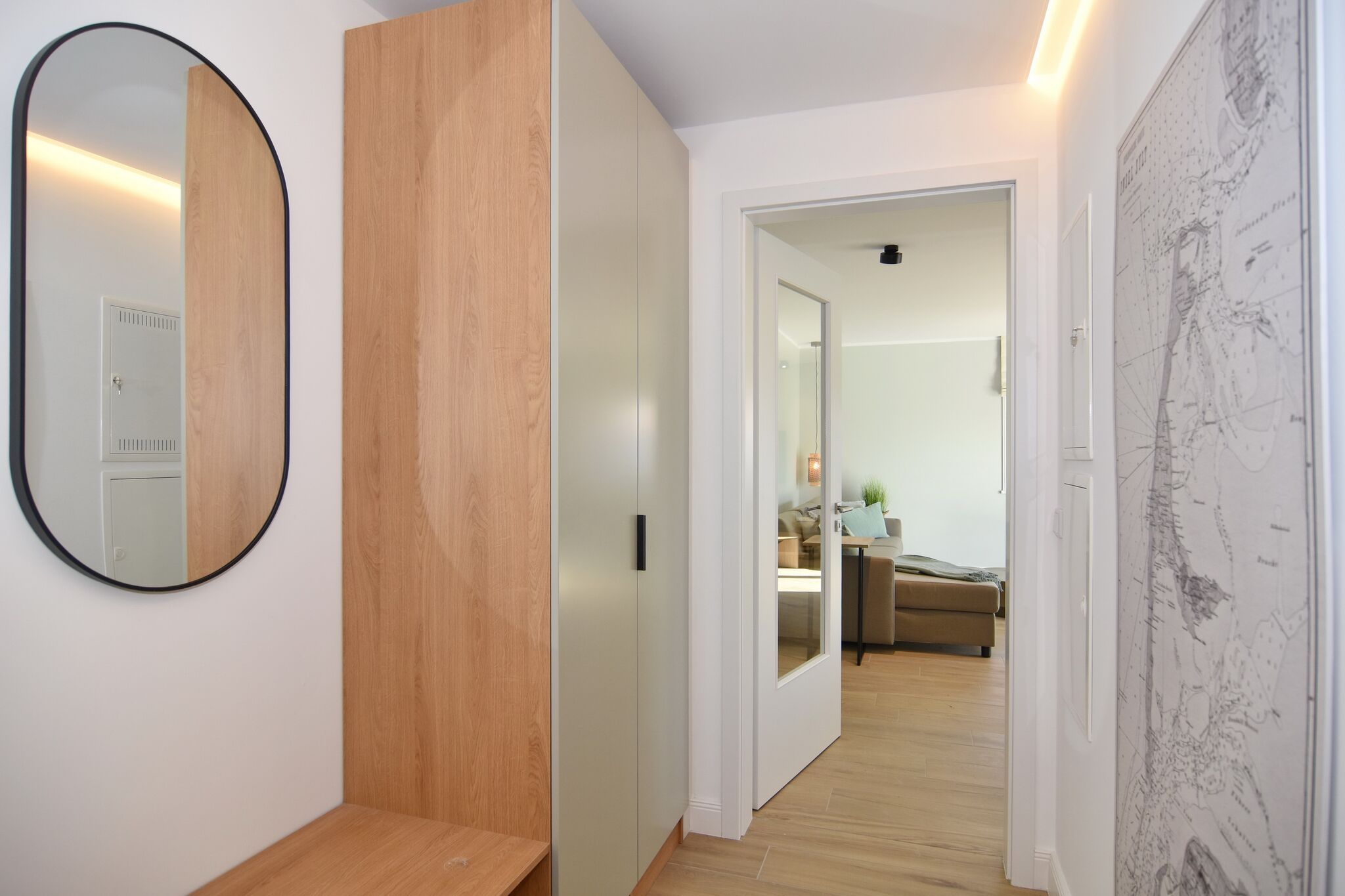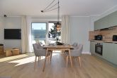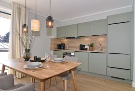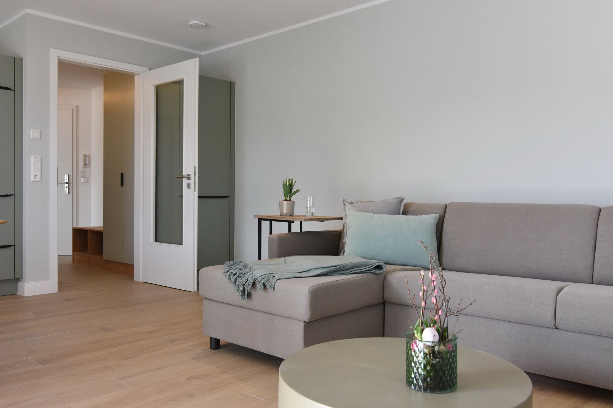 Die hochwertige 2-Zimmer-Wohnung im 1. OG mit ca. 59 qm ist für maximal 3 Personen ausgestattet. Vom Flur mit Garderobe gelangen Sie in das Wohnzimmer mit offener Küche und möbliertem Südbalkon. Die hochwertige Küche bietet neben Induktionsherd auch Geschirrspüler, Kühlschrank mit Gefrierfach und Backofen mit integrierter Mikrowelle. Die Wohnung bietet Ihnen ein Schlafzimmer und ein Duschbad /WC mit Haar- und Handtuchtrockner. Das Schlafzimmer ist mit einem Boxspringbett (200x200) der Marke FBF, Flat-TV und Einbauschrank ausgestattet. Bis auf das Schlafzimmer sind die Räume mit großformatigen Fliesen versehen.