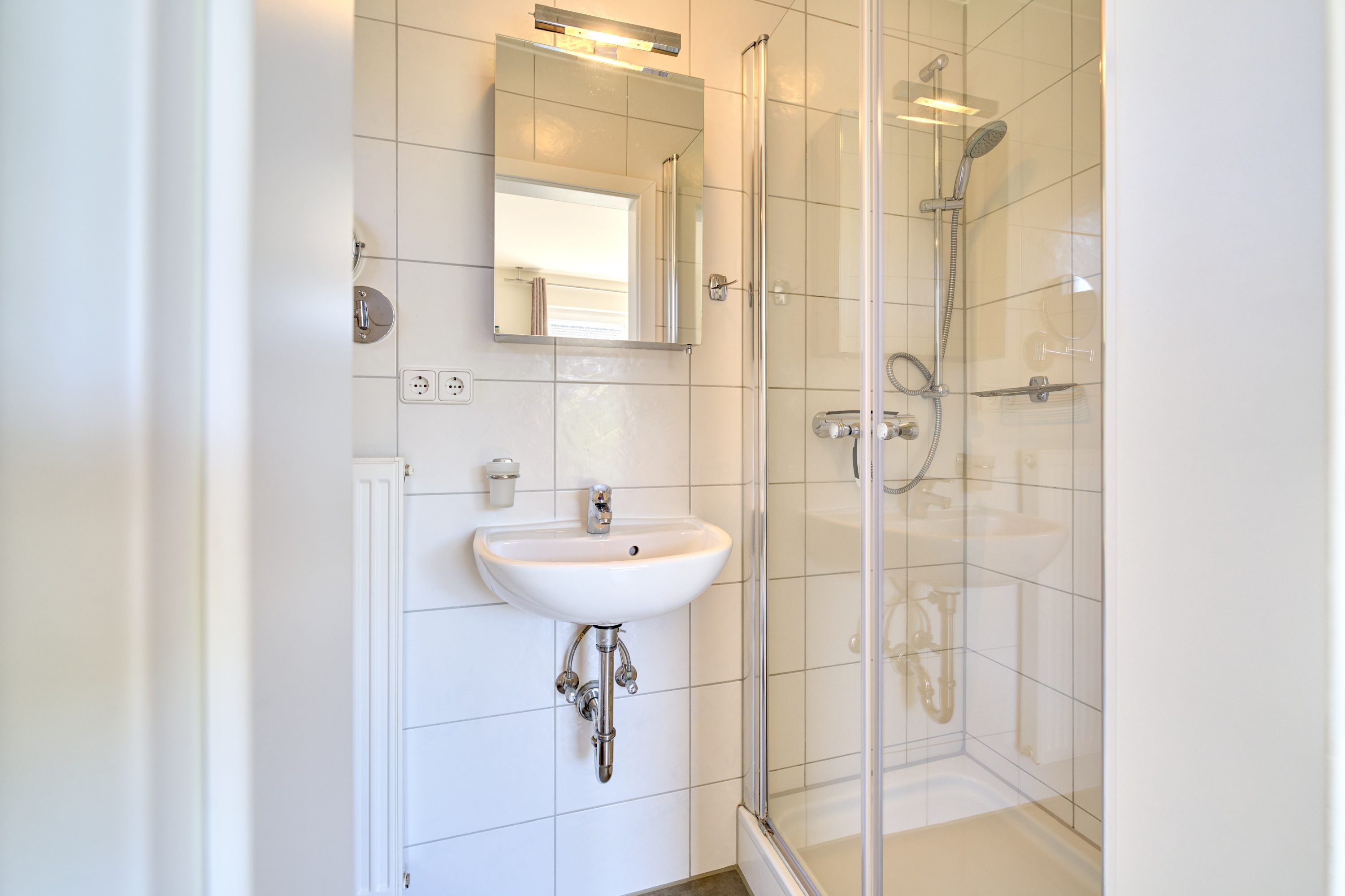 Das Badezimmer ist mit einer Dusche, Waschbecken, WC und einem Fön ausgestattet.