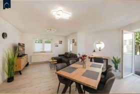 Diese geschmackvoll eingerichtete Ferienwohnung bietet auf 76 m² viel Platz für bis zu sechs Personen – ideal für Familien, Paare oder aktive Urlauber. Die Wohnung befindet sich in einem ruhigen Dorf auf Usedom, nur 300 Meter vom Ostseestrand entfernt. Zwei gemütliche Schlafzimmer, ein helles Badezimmer mit Dusche sowie ein großzügiger Wohnbereich mit Sofa und Essbereich laden zum Wohlfühlen ein. Die moderne Ausstattung umfasst unter anderem drei Fernseher, eine Spülmaschine, eine Mikrowelle und einen Internetanschluss über WLAN.