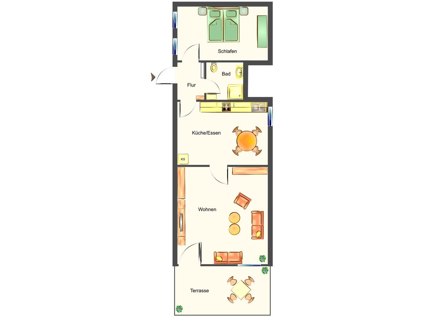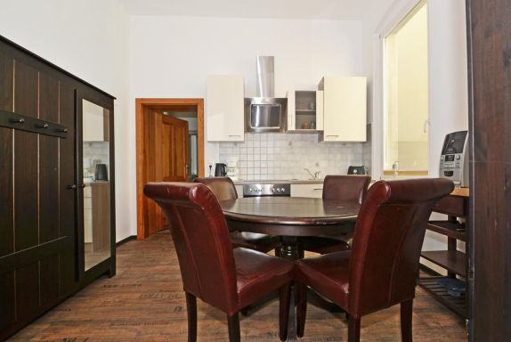 Der gemütliche Wohnbereich ist mit einem Sofa, Sessel, TV und Radio ausgestattet und lädt zu entspannten Abenden ein. Die voll ausgestattete Küche bietet alles, was Sie für die Selbstverpflegung benötigen: Kühlschrank, Gefrierfach, Herd, Backofen, Kaffeemaschine, Toaster, Wasserkocher, Geschirrspüler und ausreichend Küchenutensilien. Ein Esstisch bietet Platz für gemeinsame Mahlzeiten. Auch praktische Extras wie ein Haartrockner, Staubsauger und Schuhschrank sind vorhanden. Alle Fenster verfügen über Sichtschutz, sodass Sie Ihre Privatsphäre jederzeit genießen können.