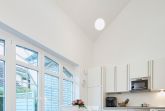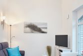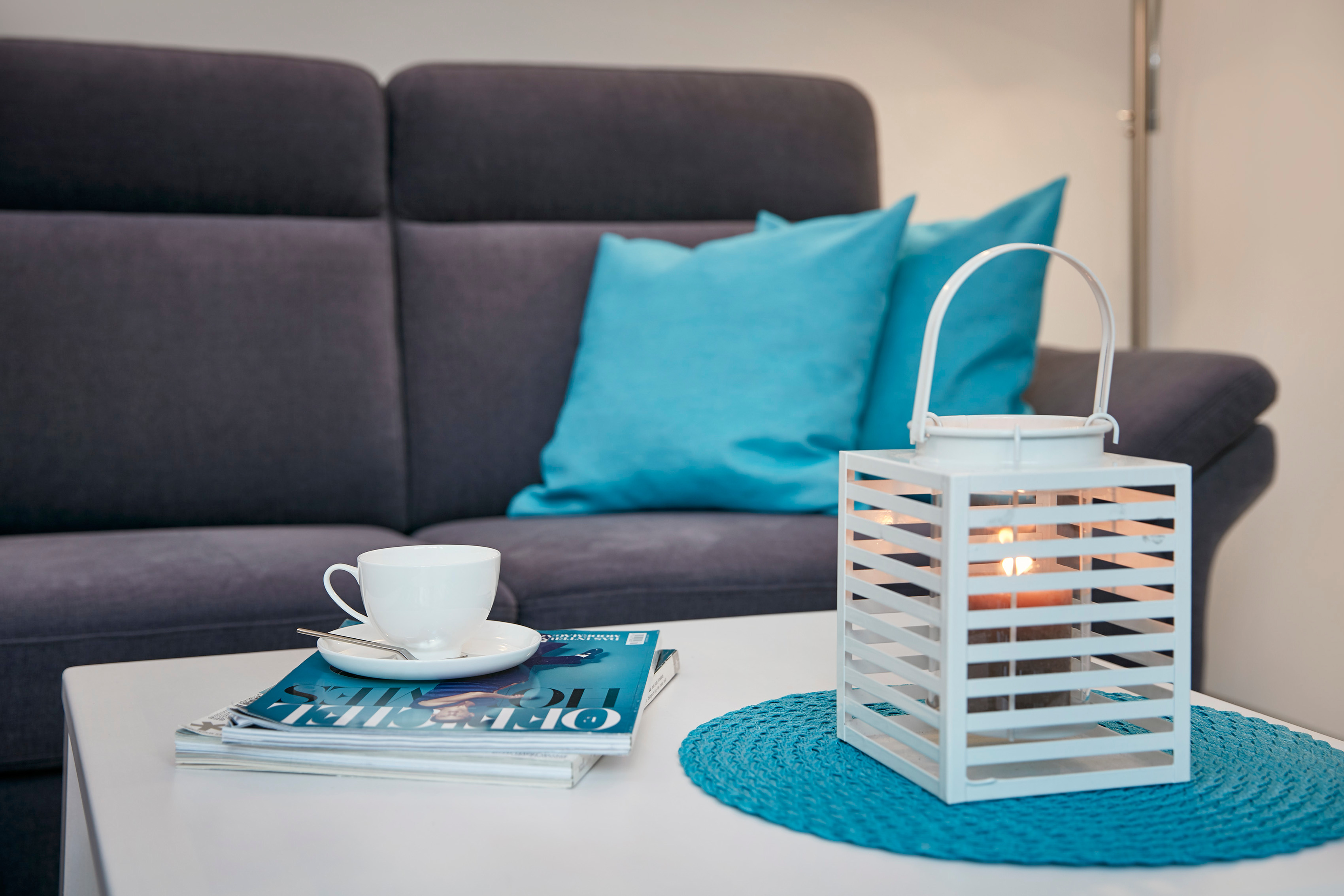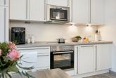 Das lichtdurchflutete Wohn-/Esszimmer verfügt über einen Essplatz für zwei Personen und einen Wohnbereich mit komfortablen und ansprechenden Sitzmöbeln. Die hochwertig ausgestattete Küchenzeile mit Backofen, Mikrowelle und Spülmaschine sowie diversen Kleingeräten (Filterkaffeemaschine, Wasserkocher, Toaster uvm.) bietet alles für ein entspanntes Essen zu zweit.