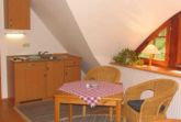Das kleine gemütliche 1-Zimmer-Appartement für 1-2 Personen ist ganzjährig mietbar und befindet sich im Dachgeschoß der dem Garten und dem Boddengewässer zugewandten Hausseite. Das große Gaubenfenster nach Süden lässt viel Licht herein, das große Badezimmerfenster nach Norden bietet einen schönen Blick auf den Bodden.