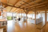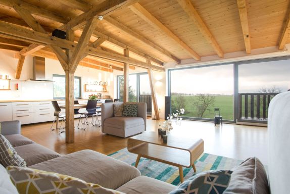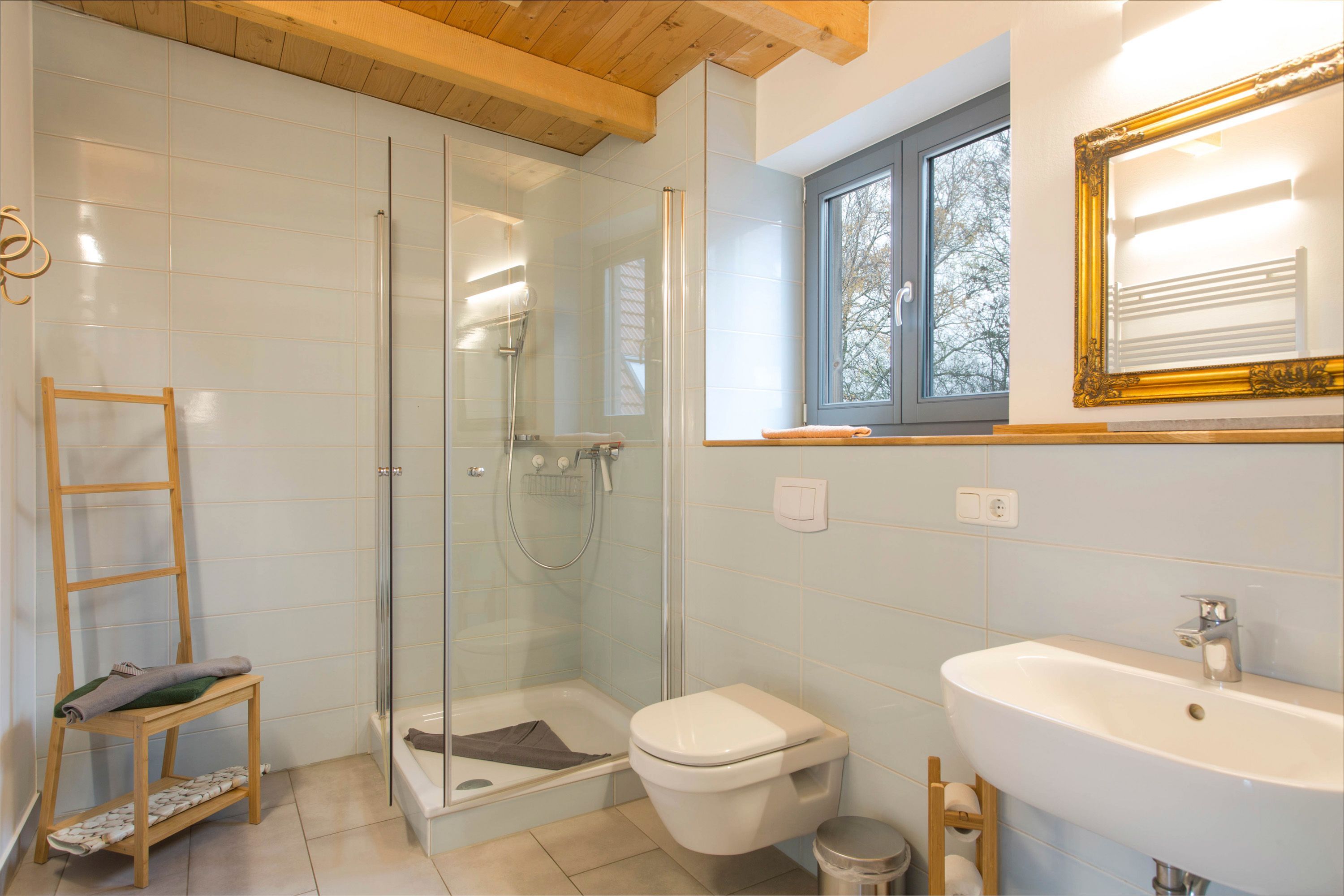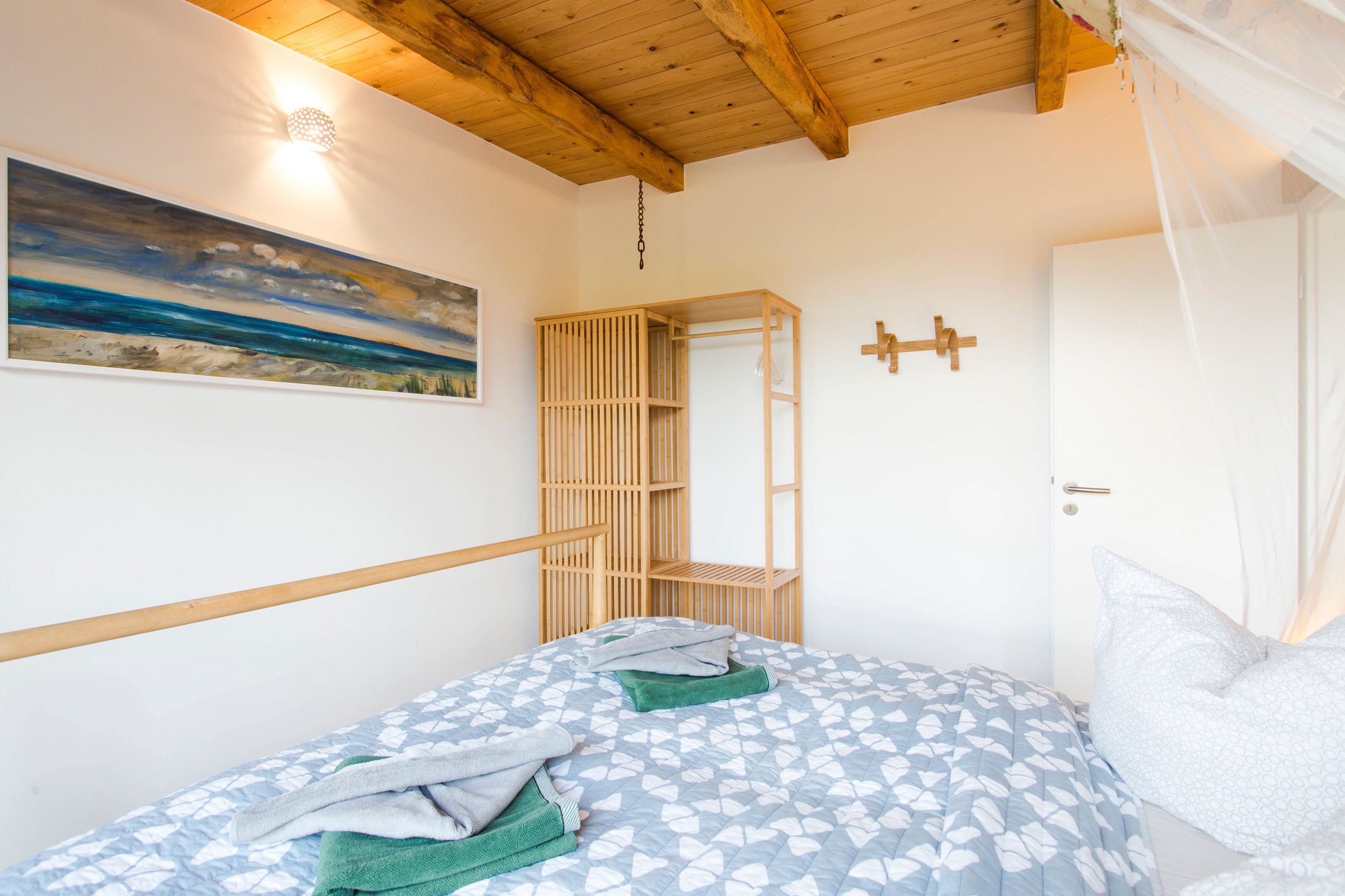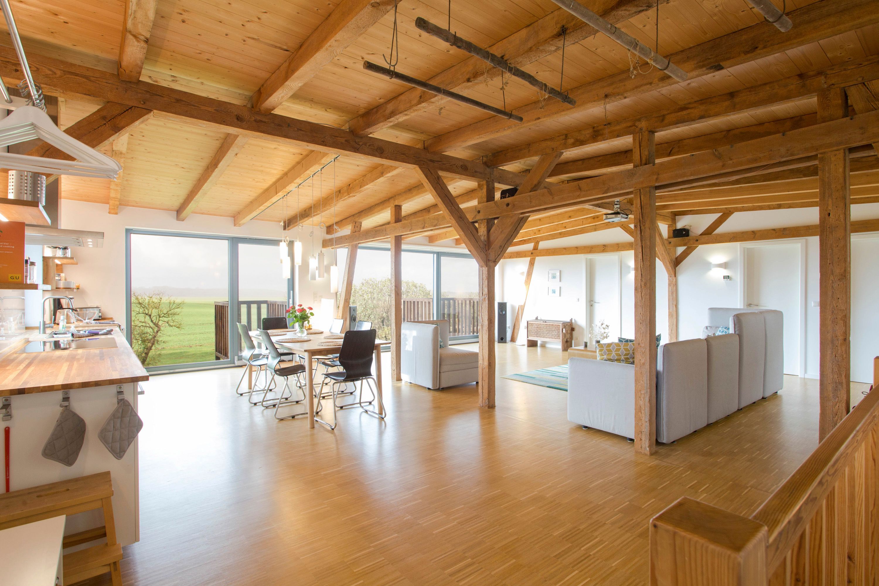 Das Scheunenloft Westblick im ehemaligen Heuboden des Stalls bietet auf 96 m² für bis zu 6 Personen genügend Platz. Das Herzstück ist das Wohnzimmer mit offener Küche und einem atemberaubenden Panoramablick über die Wiesen bis hin zum Bodden. Auf dem gemütlichen Schlafsofa (2x80x200) können sie gemeinsame Abende verbringen oder die nächsten Ausflüge planen. Die modern und offen gestaltete Küche ist voll ausgestattet mit einem Kühlschrank, Backofen, Induktionskochfeld, Geschirrspüler und Utensilien des täglichen Bedarfs. Die beiden Schlafzimmer verfügen einmal über ein Doppelbett (160x200, getrennte Matratzen) und einmal über ein Etagenbett (90x200, 140x200). Im Bad befindet sich eine Dusche, Waschbecken und WC.