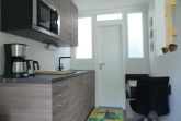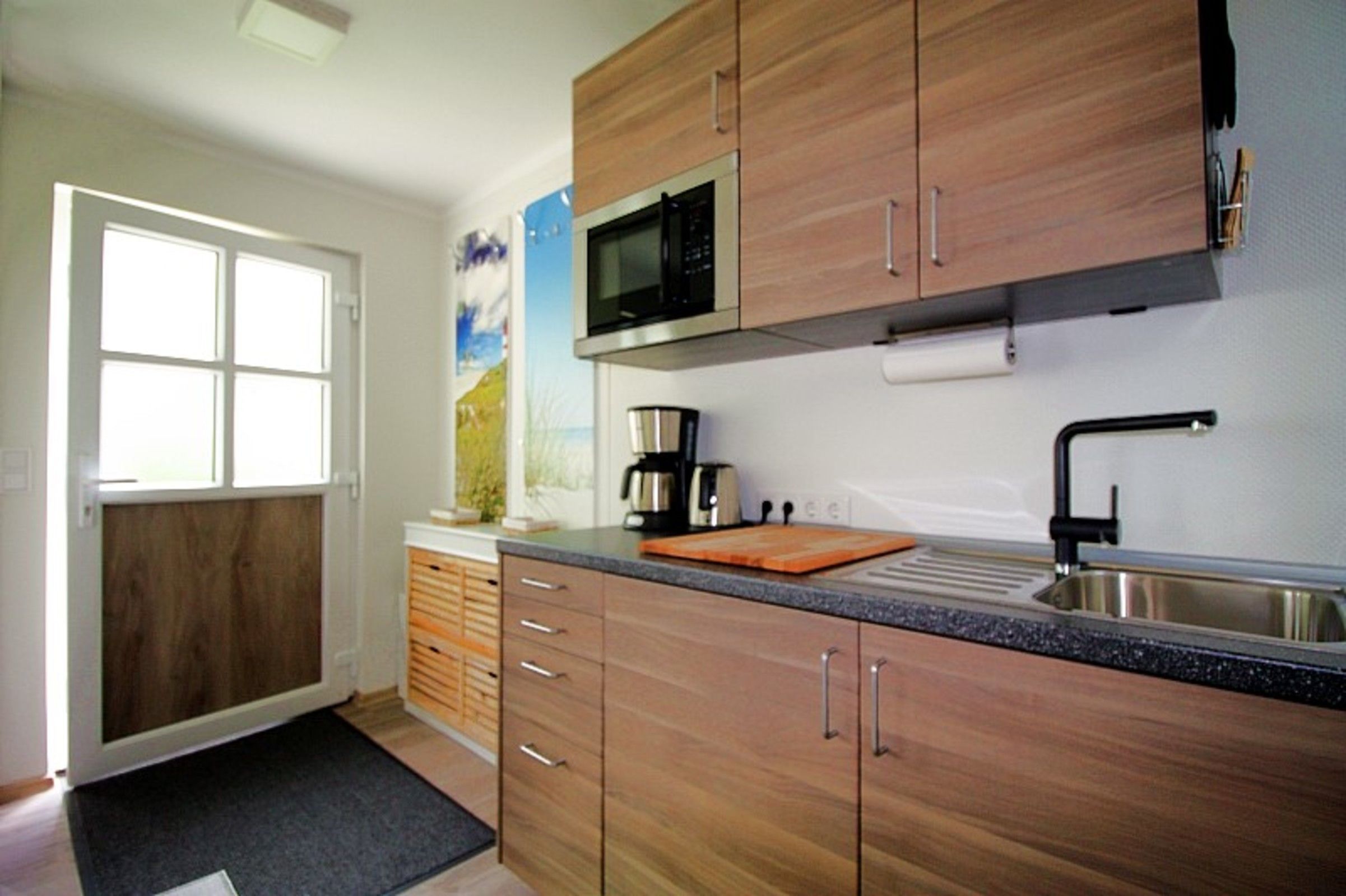 • moderne Einbau-Küche mit Kühlschrank, Glaskeramik-Kochfeld, Mikrowelle, Wasserkocher, Kaffeemaschine, Toaster, separater Essbereich