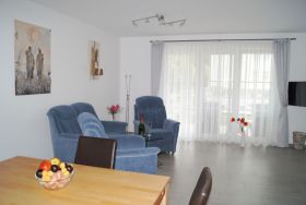 Ihre etwa 88 qm große Ferienwohnung verfügt über ein Wohnzimmer mit integrierter Küche , zwei Schlafzimmer, ein Bad und über ein Gäste-WC sowie einen Balkon.