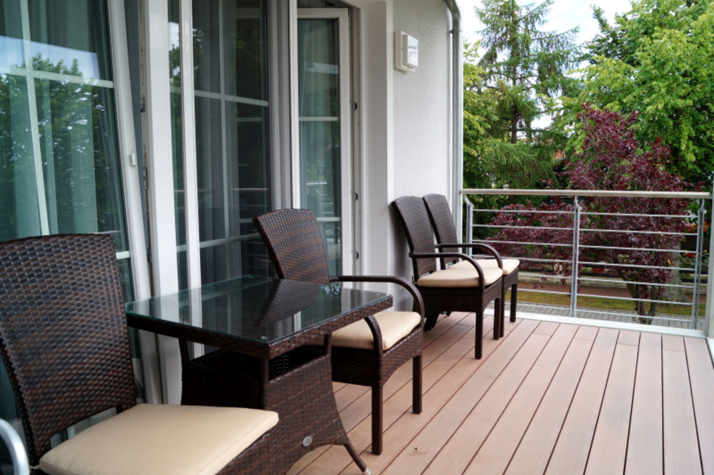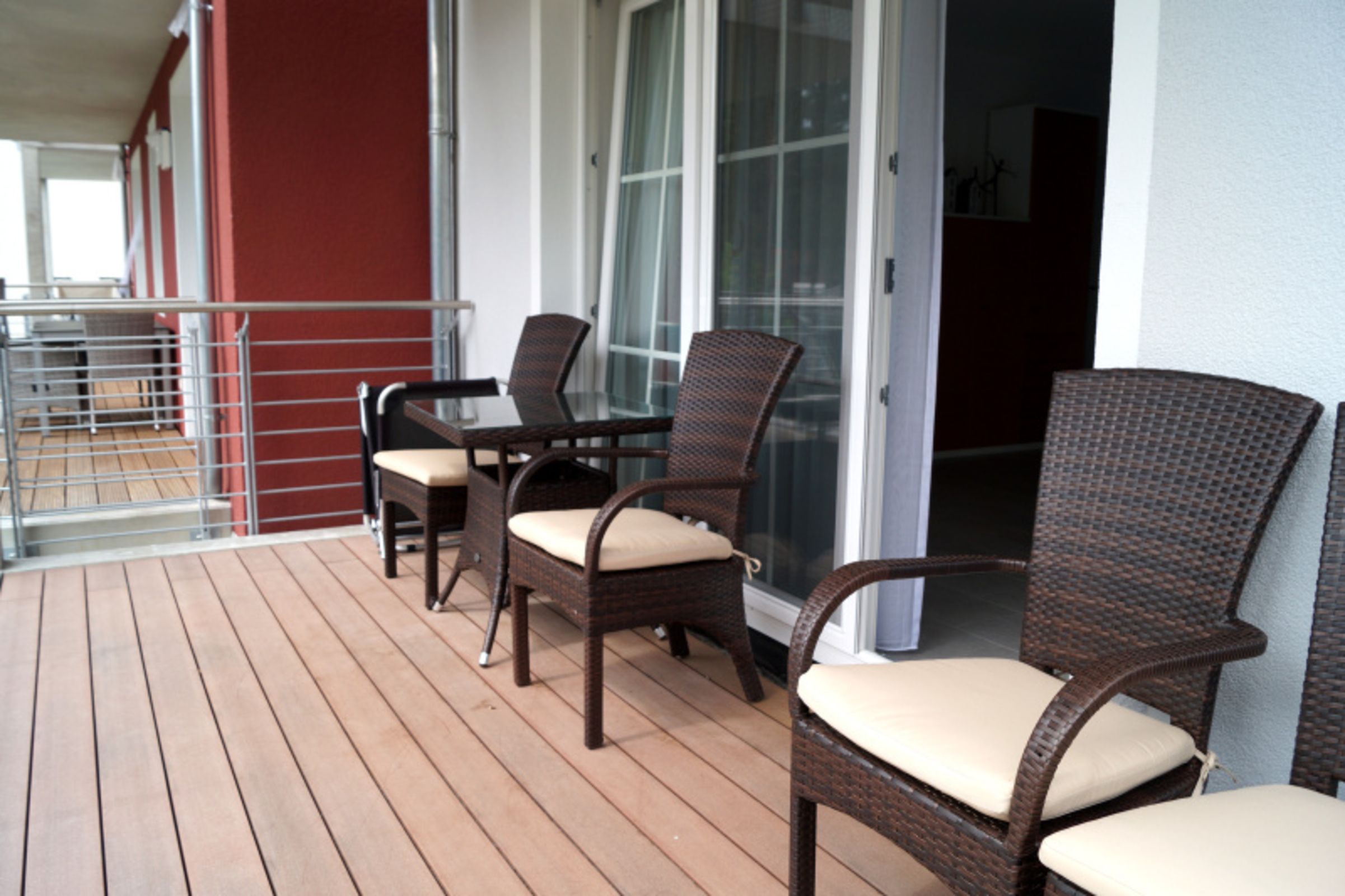 Zu der Ferienwohnung gehören außerdem ein Balkon mit Gartenmöbeln und ein PKW-Stellplatz.