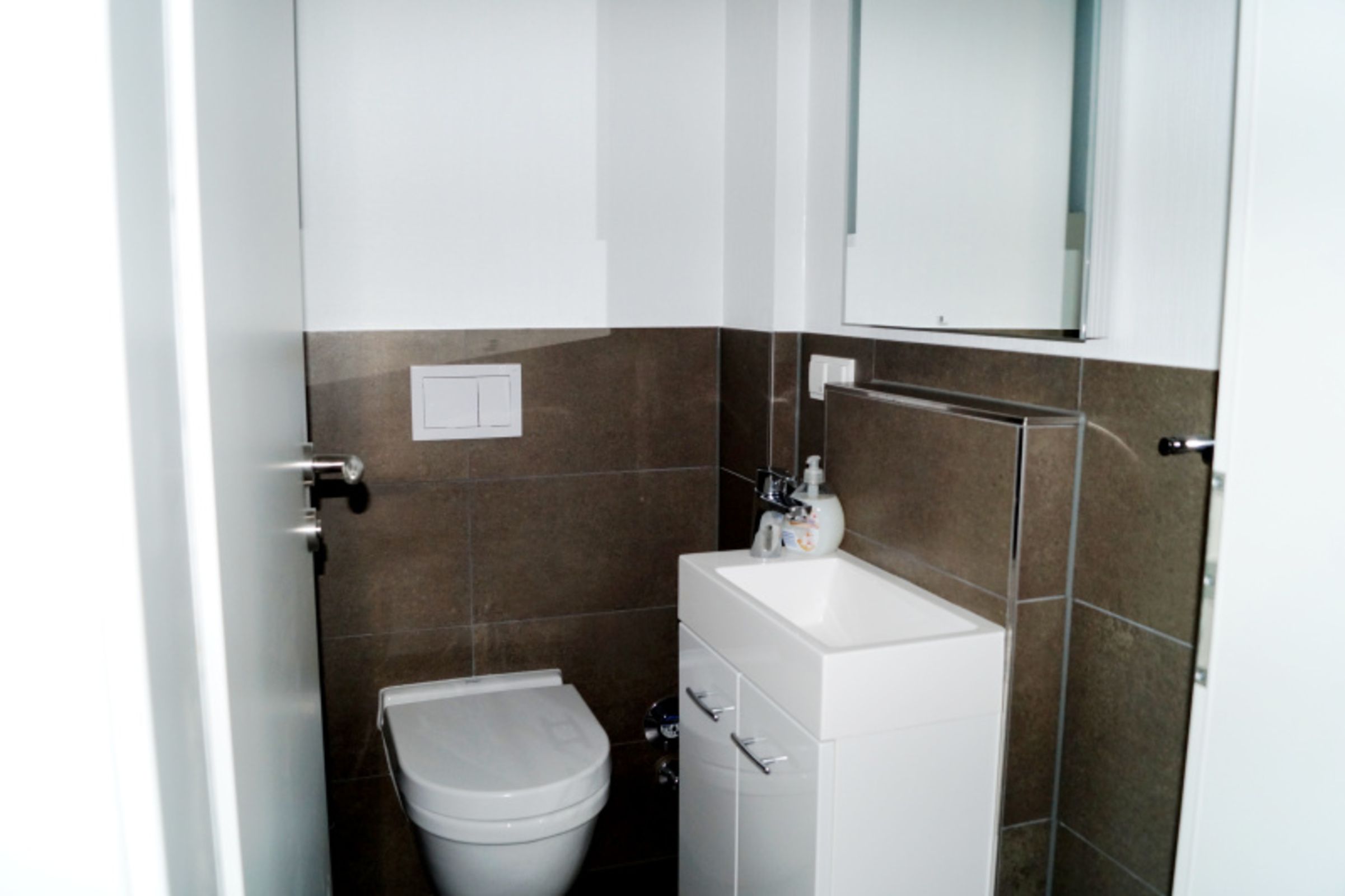 Ebenfalls gibt es in der Wohnung ein Gäste-WC mit einem WC und einem Waschbecken.