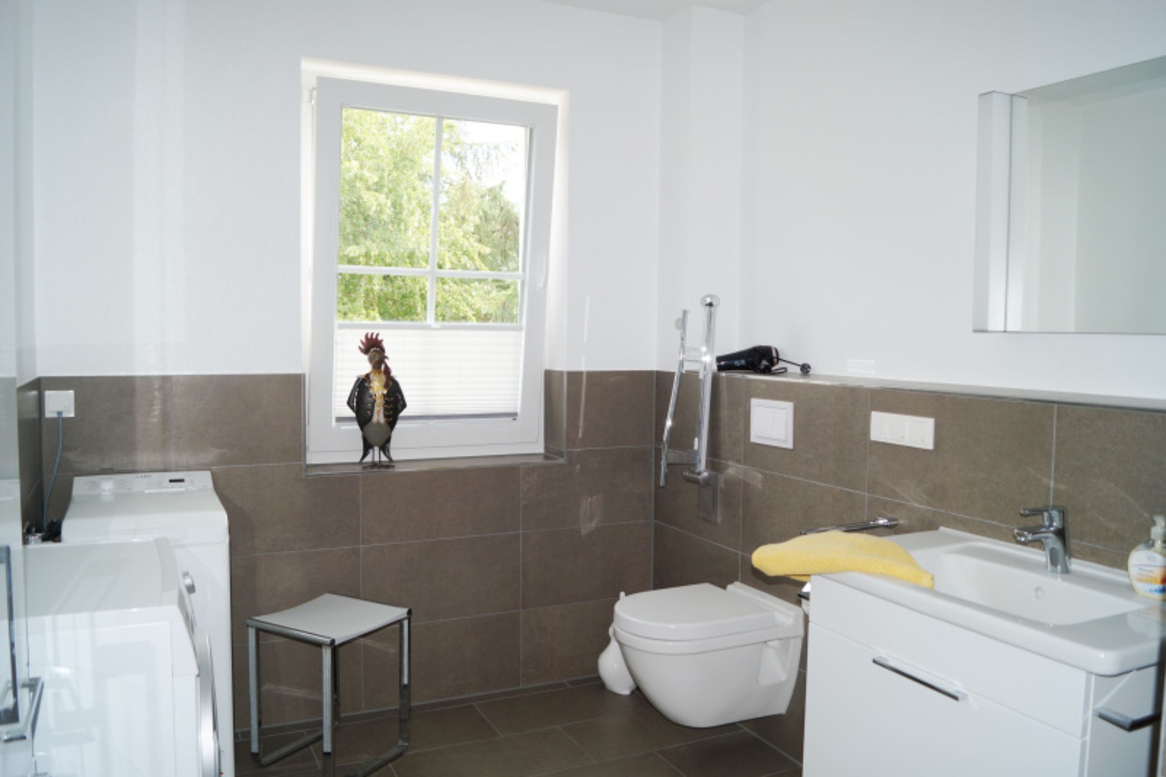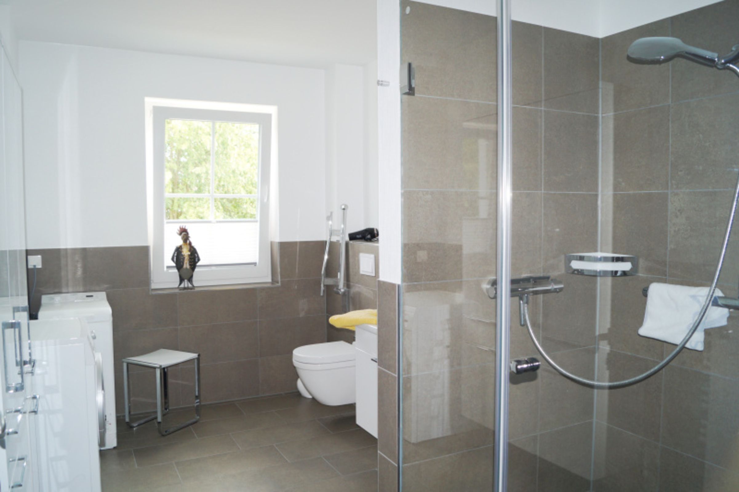 Das geflieste Bad mit Fenster hat eine bodengleiche Dusche, ein WC, einen Waschtisch, einen Föhn sowie eine Waschmaschine und einen Trockner.