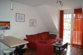 Zu der Ferienwohnung gehören außerdem ein Balkon, ein Fahrradschuppen und ein PKW-Stellplatz.