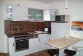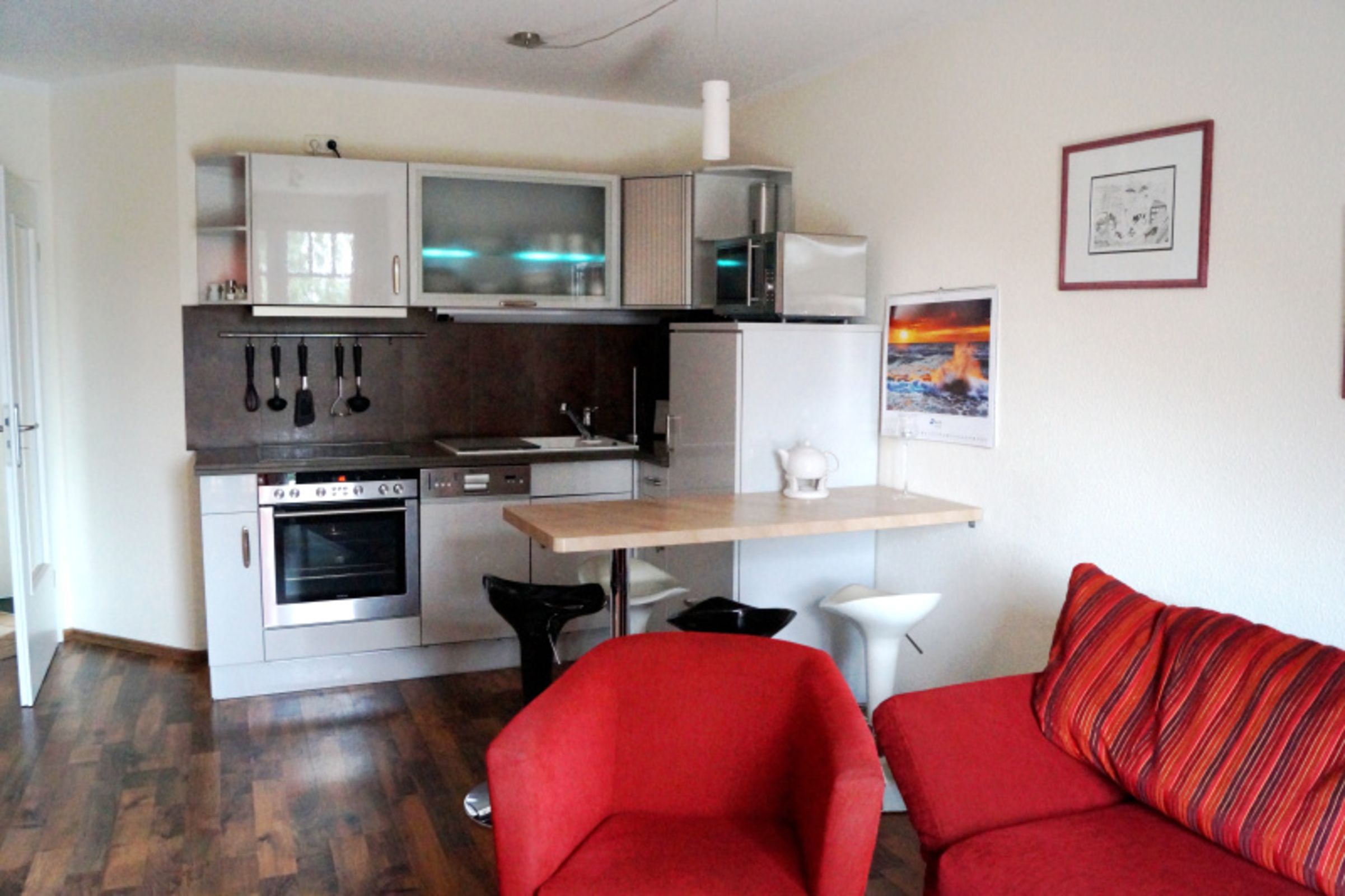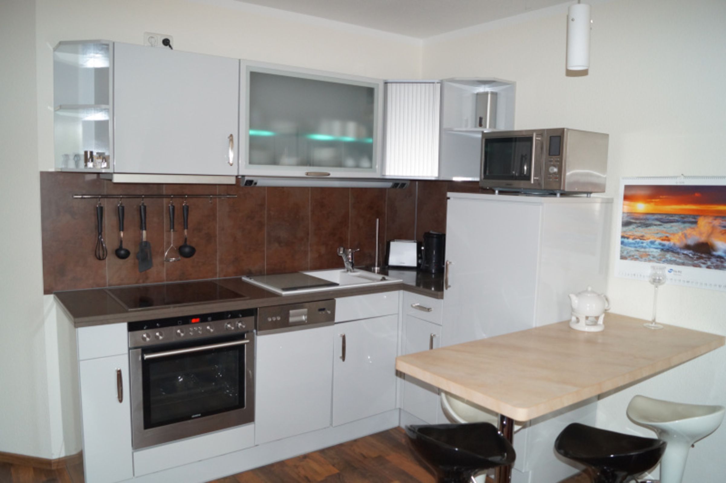 Die offene Küche mit Esstisch und 4 Barhockern ist in das Wohnzimmer integriert und ist unter anderem mit einem Backofen, einem Kühlschrank, einer Geschirrspülmaschine und einer Mikrowelle ausgestattet.