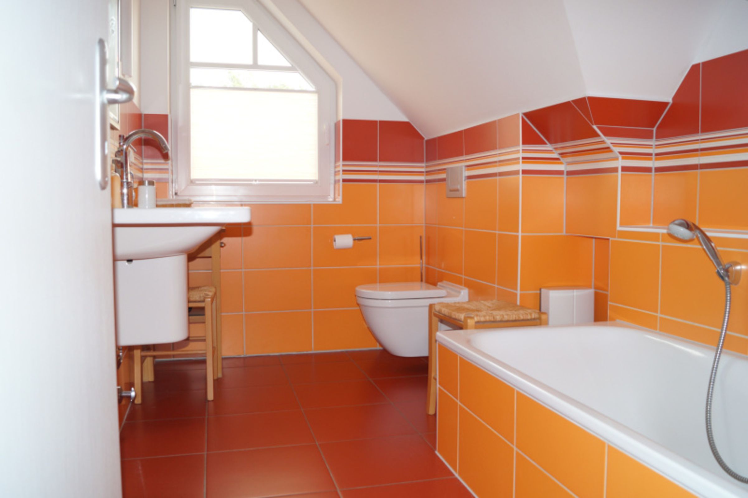 Im gefliesten Bad mit Fenster befinden sich eine Badewanne und ein WC.