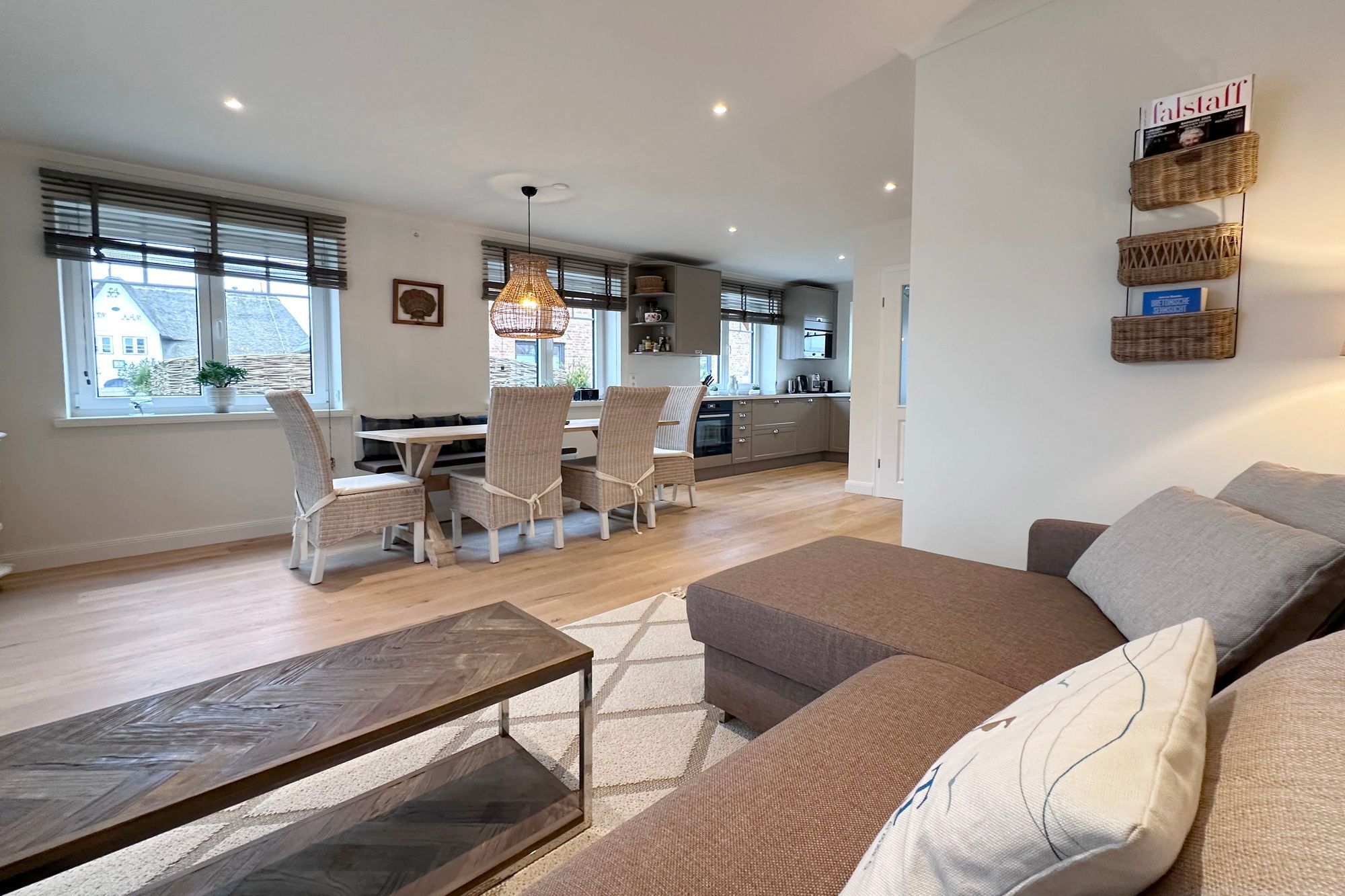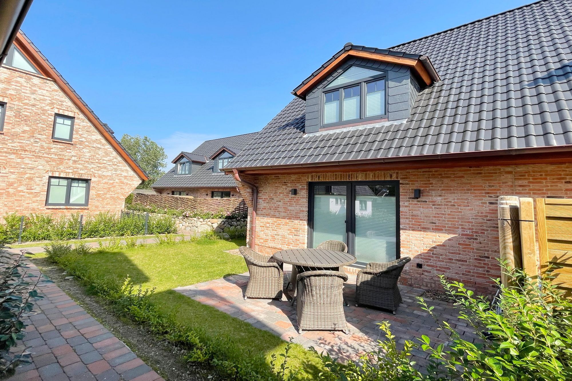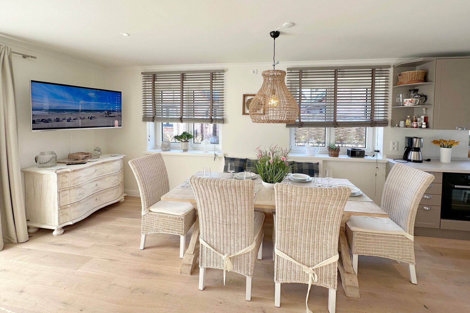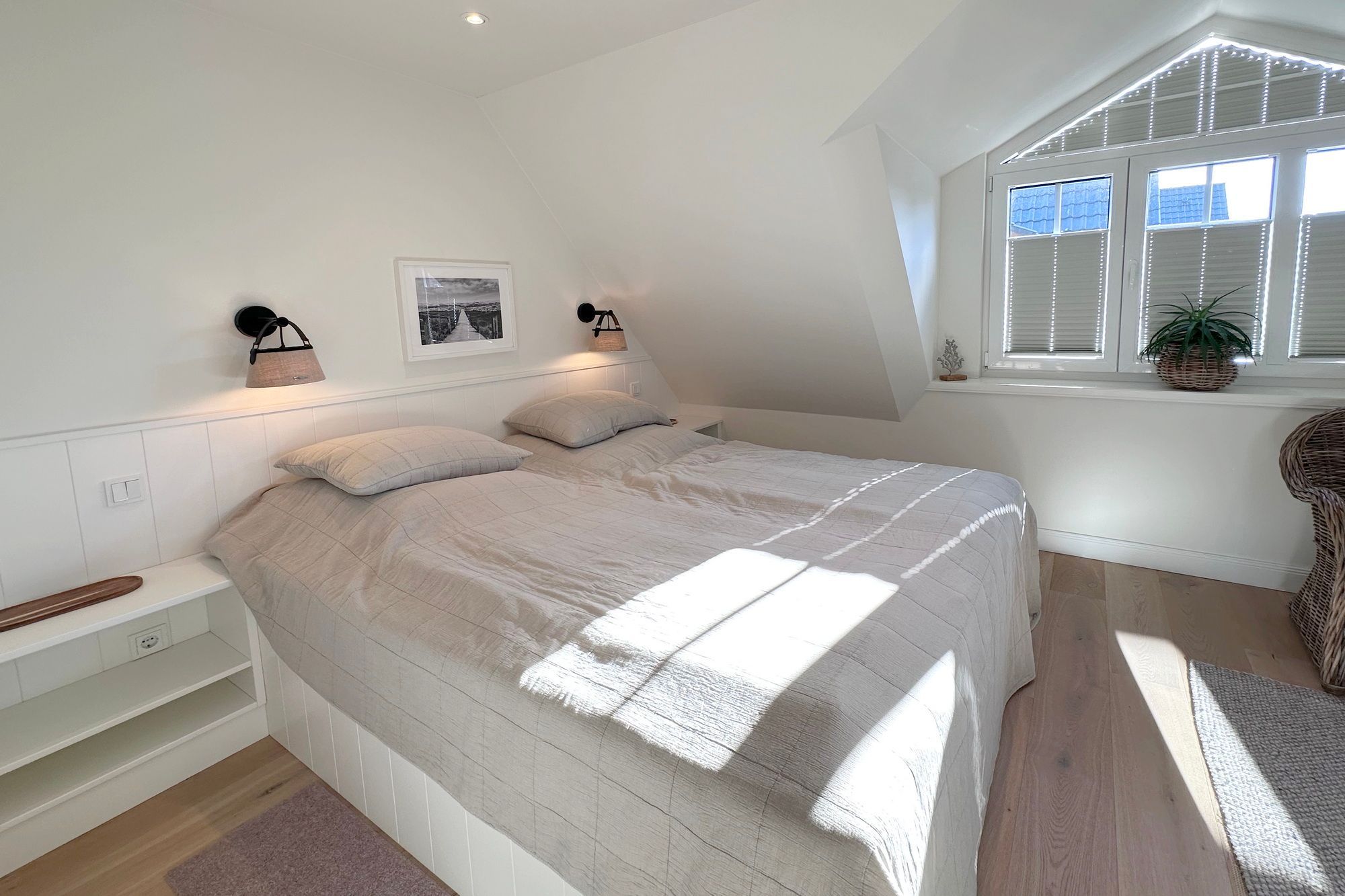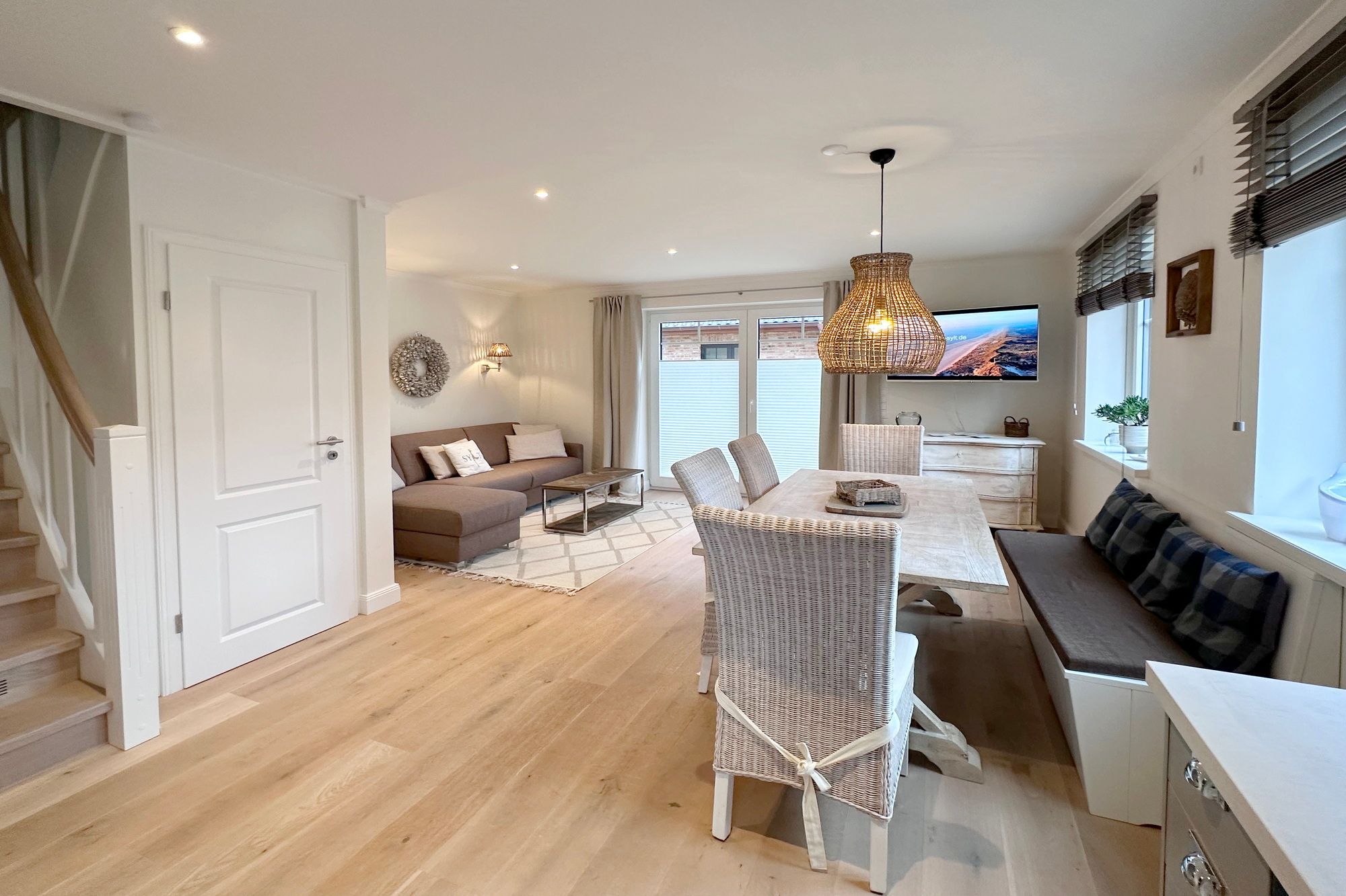 Das Ferienhaus Engels Hüs ist eine Doppelhaushälfte mit einer Nutzfläche von ca. 88m², die Platz für bis zu vier Personen bietet. Das Haus erstreckt sich über 2 Etagen, nämlich das Erdgeschoss und das Obergeschoss. Im Erdgeschoss befindet sich ein Wohnraum mit einem Flatscreen-TV, WLAN und einem Essbereich. Außerdem gibt es hier eine Küchenzeile mit einem Backofen und einer Mikrowelle, einem Induktionsherd, einer Geschirrspülmaschine und einer Nespressomaschine. Des Weiteren gibt es eine Terrasse in südlicher Ausrichtung mit Gartenmöbeln. Ein Badezimmer mit Dusche und WC sowie eine Waschmaschine sind ebenfalls im Erdgeschoss vorhanden.
