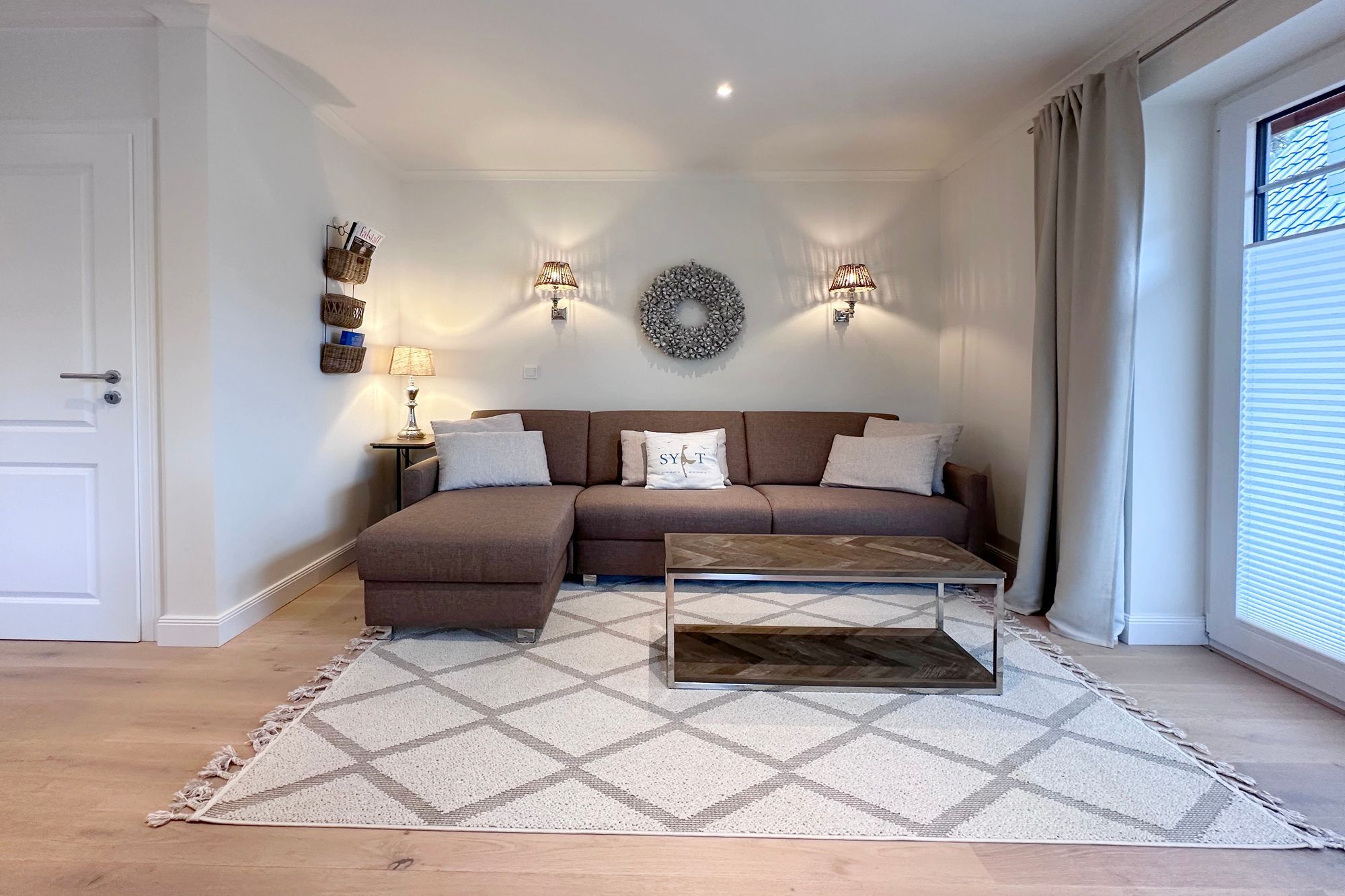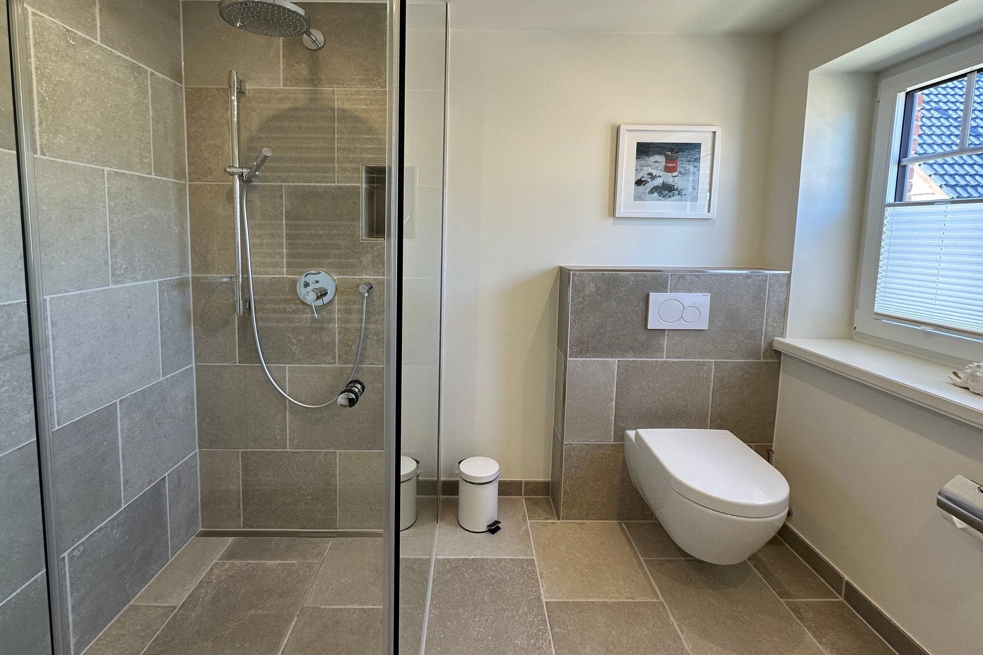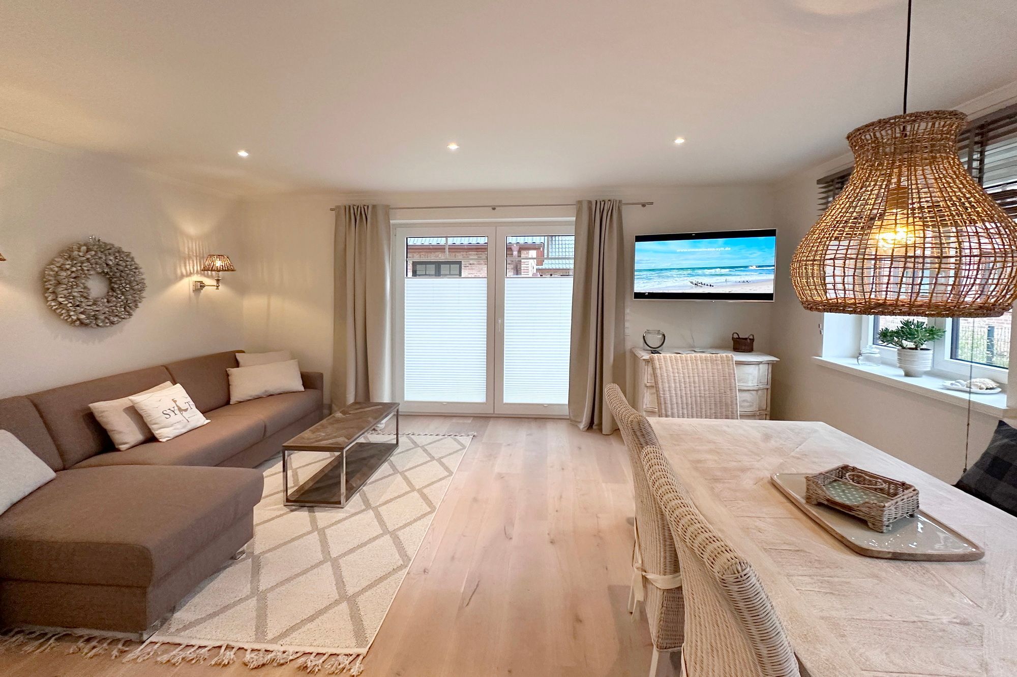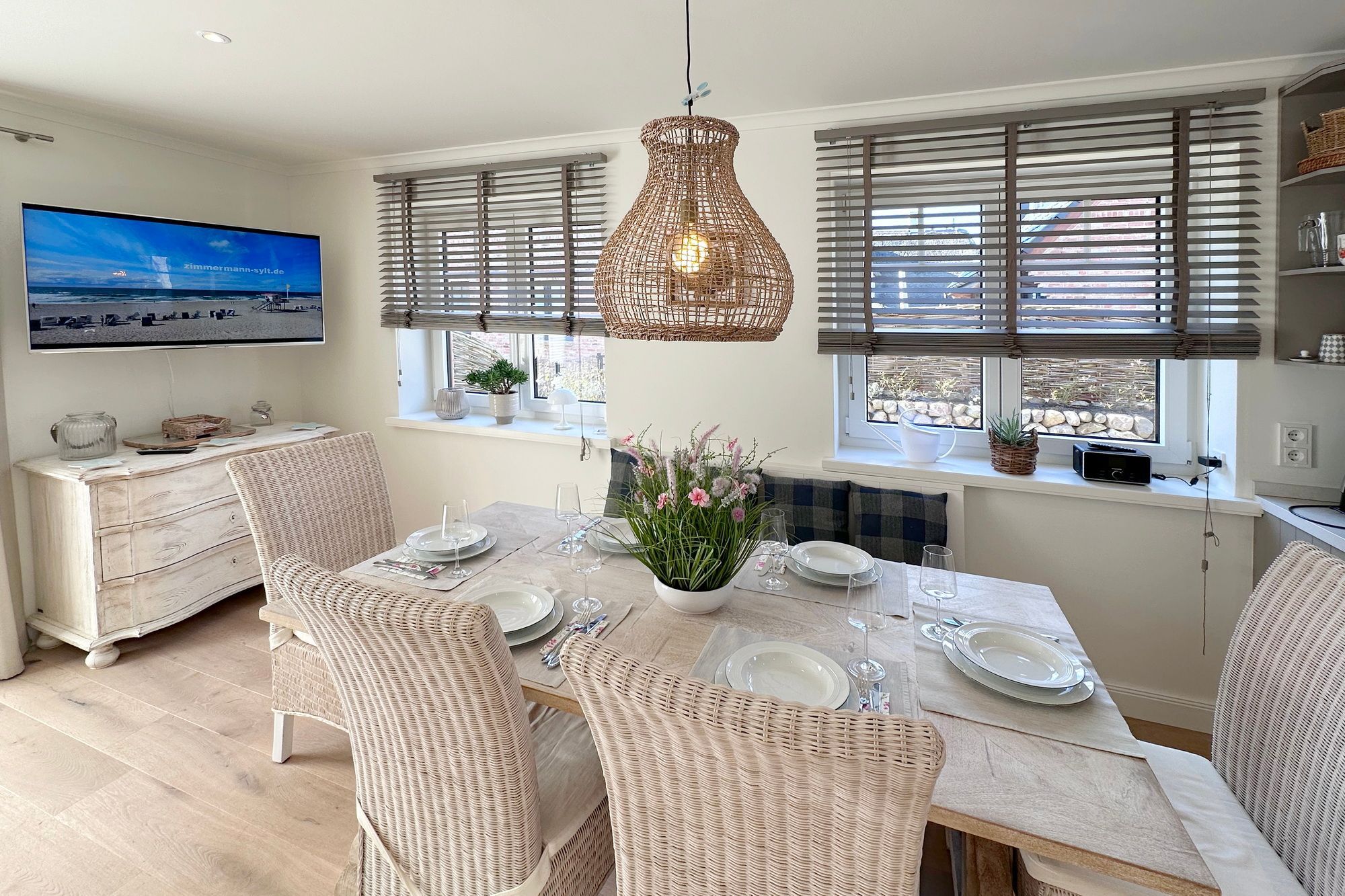 Das Ferienhaus Engels Hüs ist eine Doppelhaushälfte mit einer Nutzfläche von ca. 88m², die Platz für bis zu vier Personen bietet. Das Haus erstreckt sich über 2 Etagen, nämlich das Erdgeschoss und das Obergeschoss. Im Erdgeschoss befindet sich ein Wohnraum mit einem Flatscreen-TV, WLAN und einem Essbereich. Außerdem gibt es hier eine Küchenzeile mit einem Backofen und einer Mikrowelle, einem Induktionsherd, einer Geschirrspülmaschine und einer Nespressomaschine. Des Weiteren gibt es eine Terrasse in südlicher Ausrichtung mit Gartenmöbeln. Ein Badezimmer mit Dusche und WC sowie eine Waschmaschine sind ebenfalls im Erdgeschoss vorhanden.