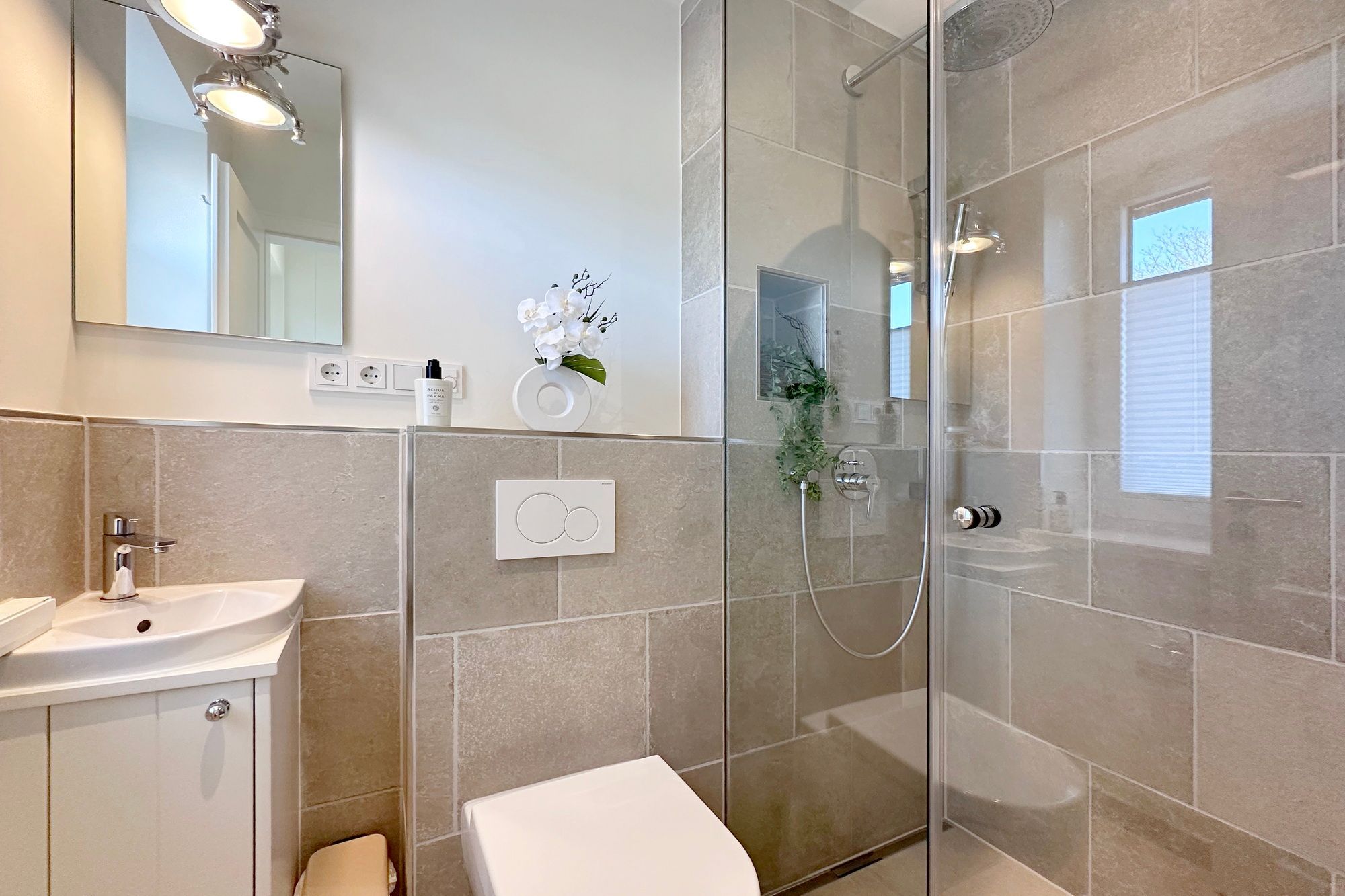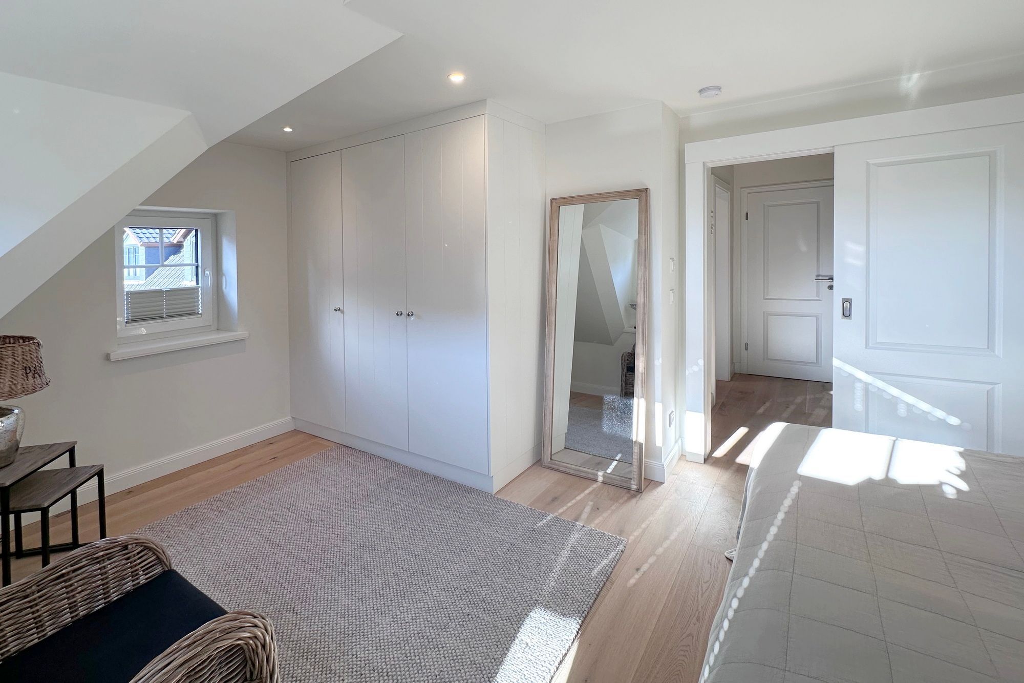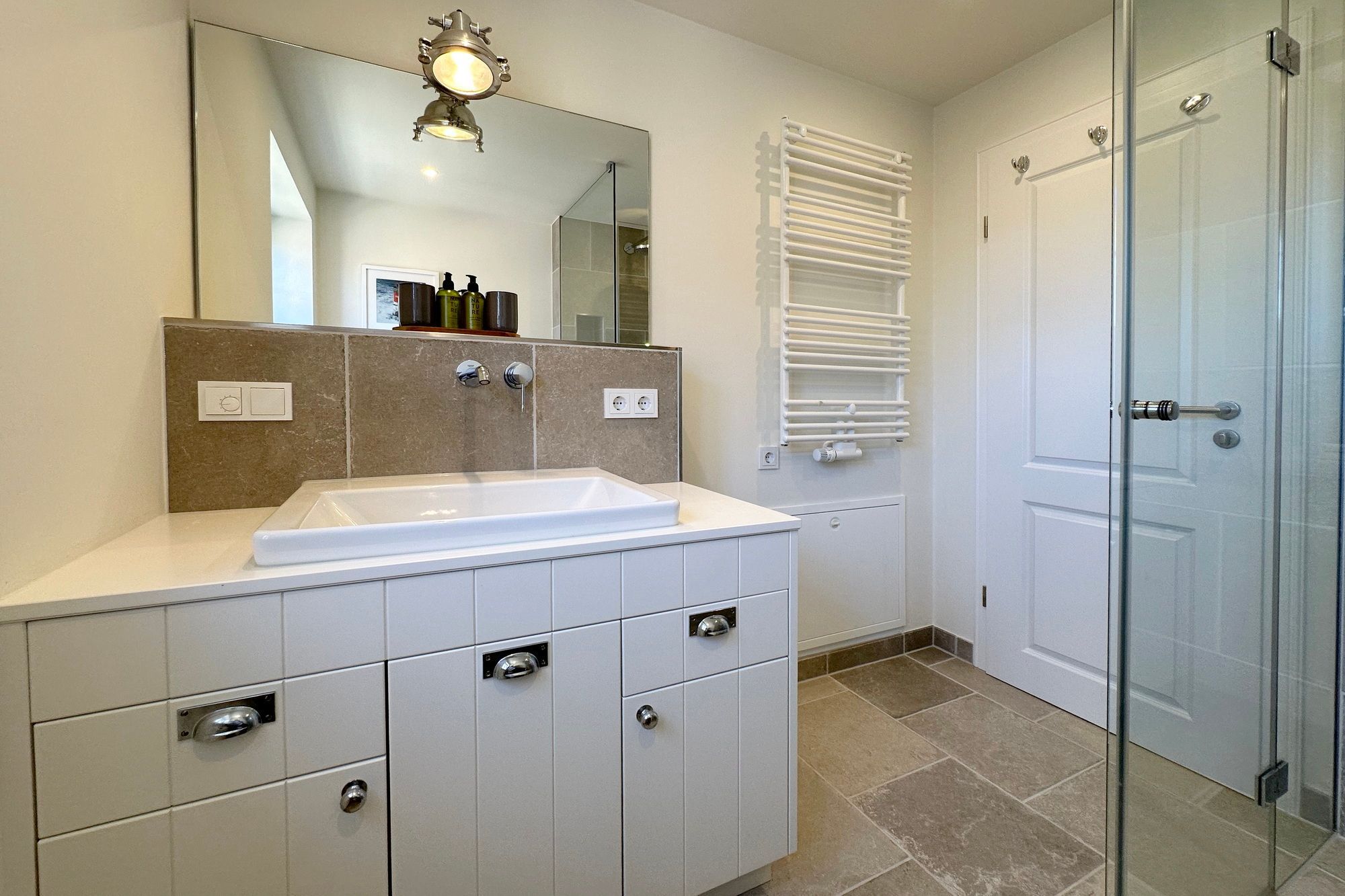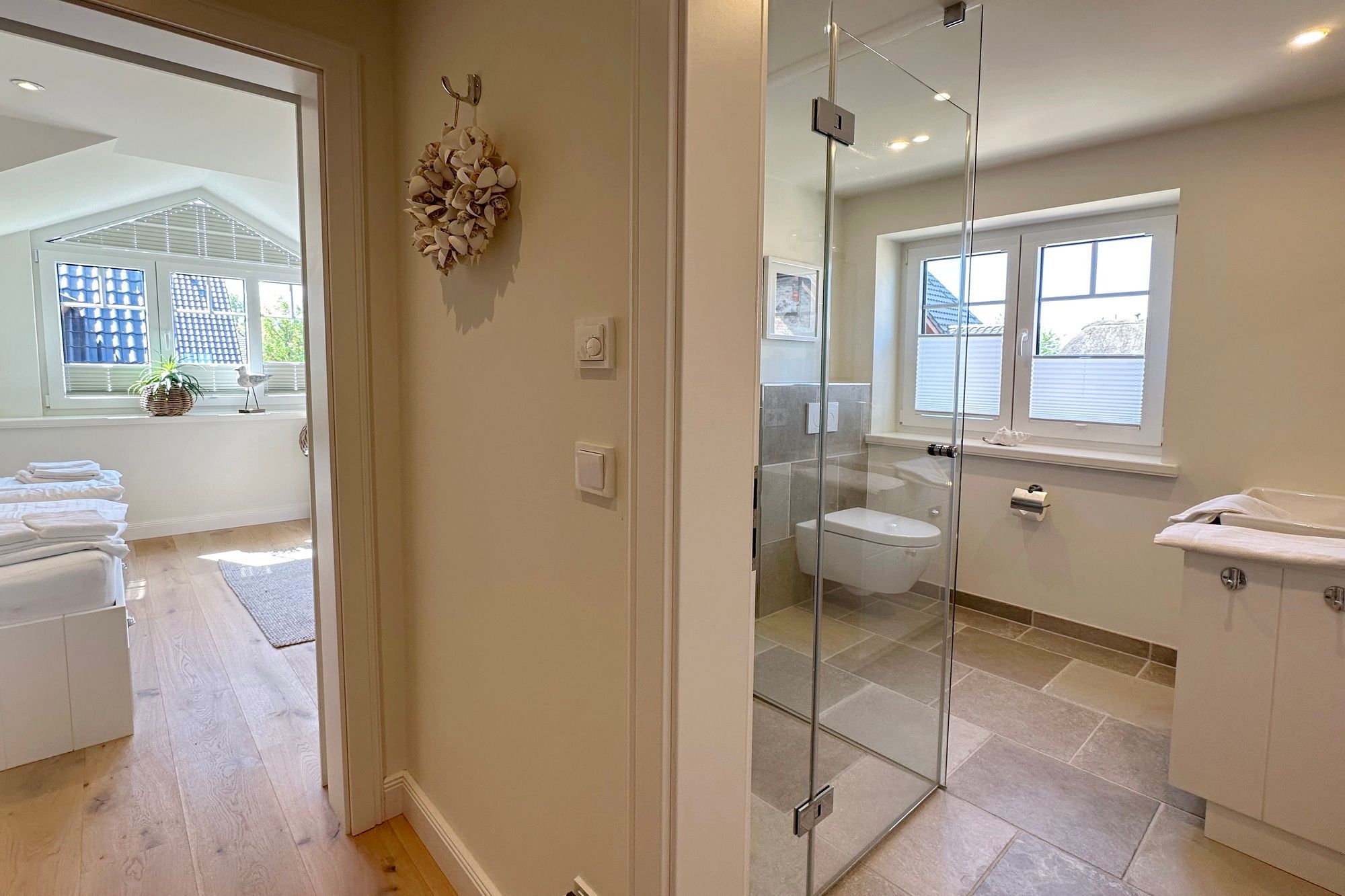 Im Obergeschoss befinden sich zwei Räume mit je einem Doppelbett (160x200 und 180x200) sowie ein weiteres Badezimmer mit Dusche und WC.