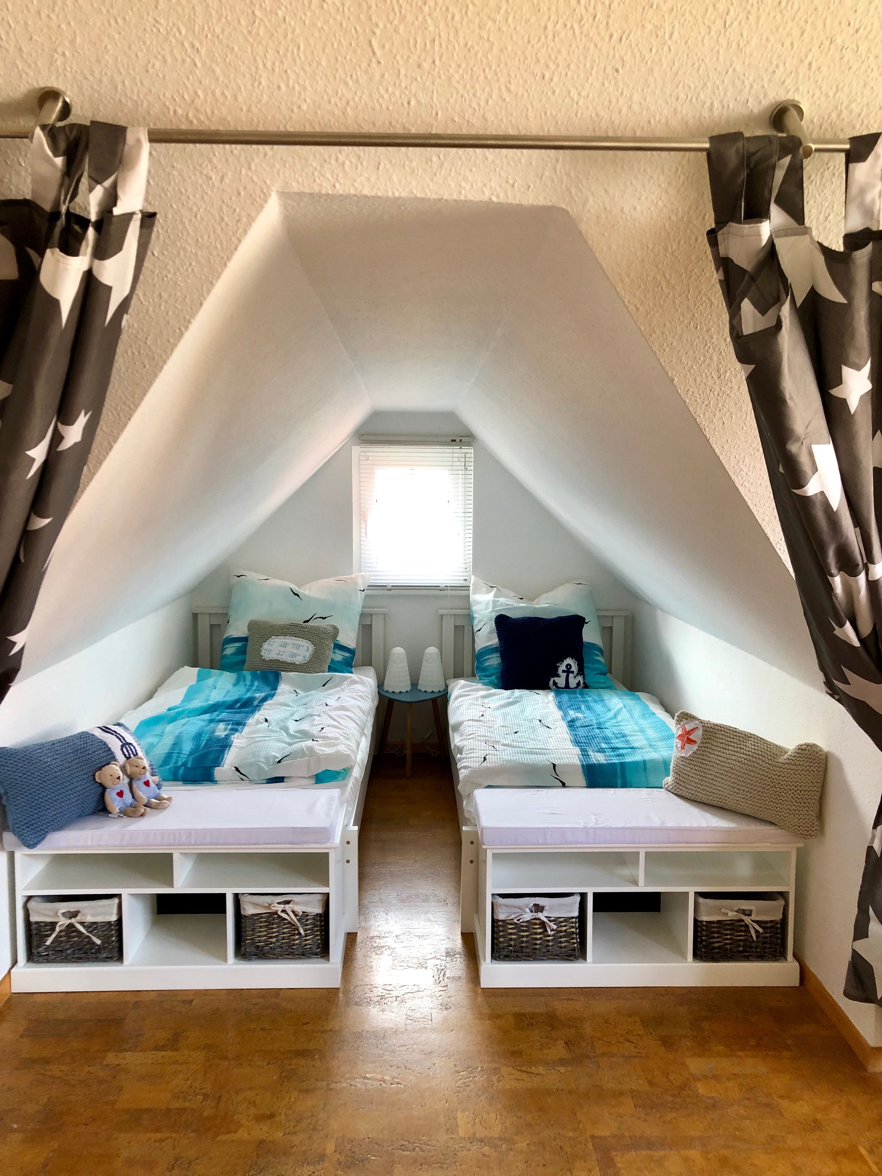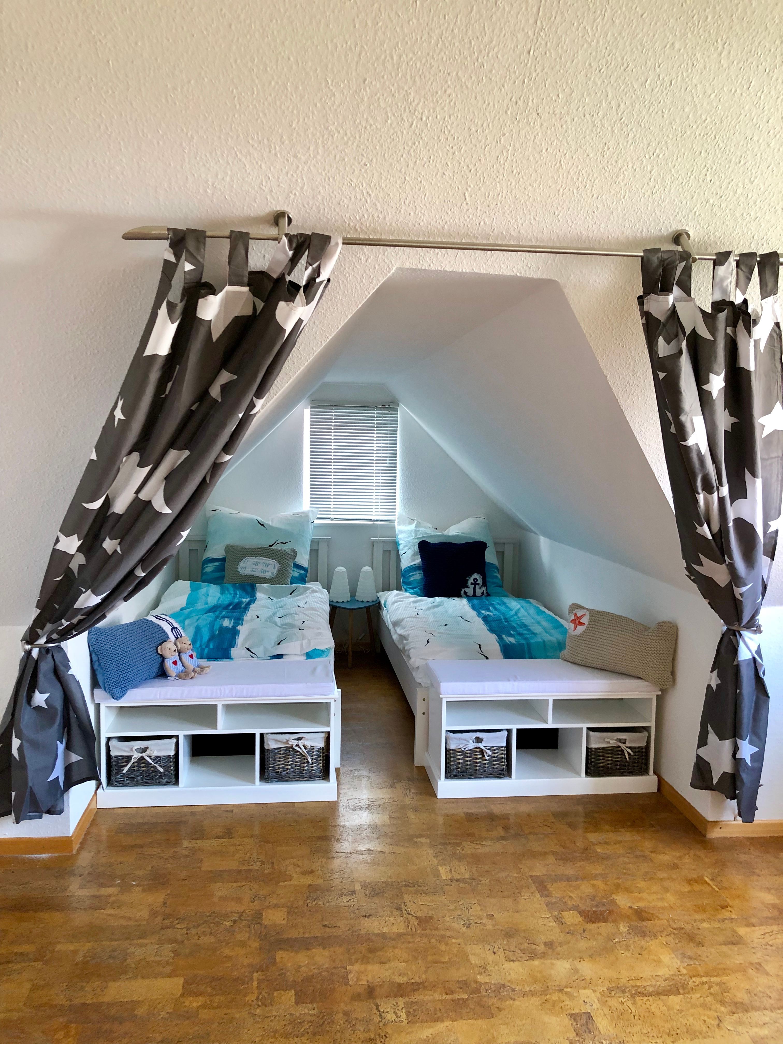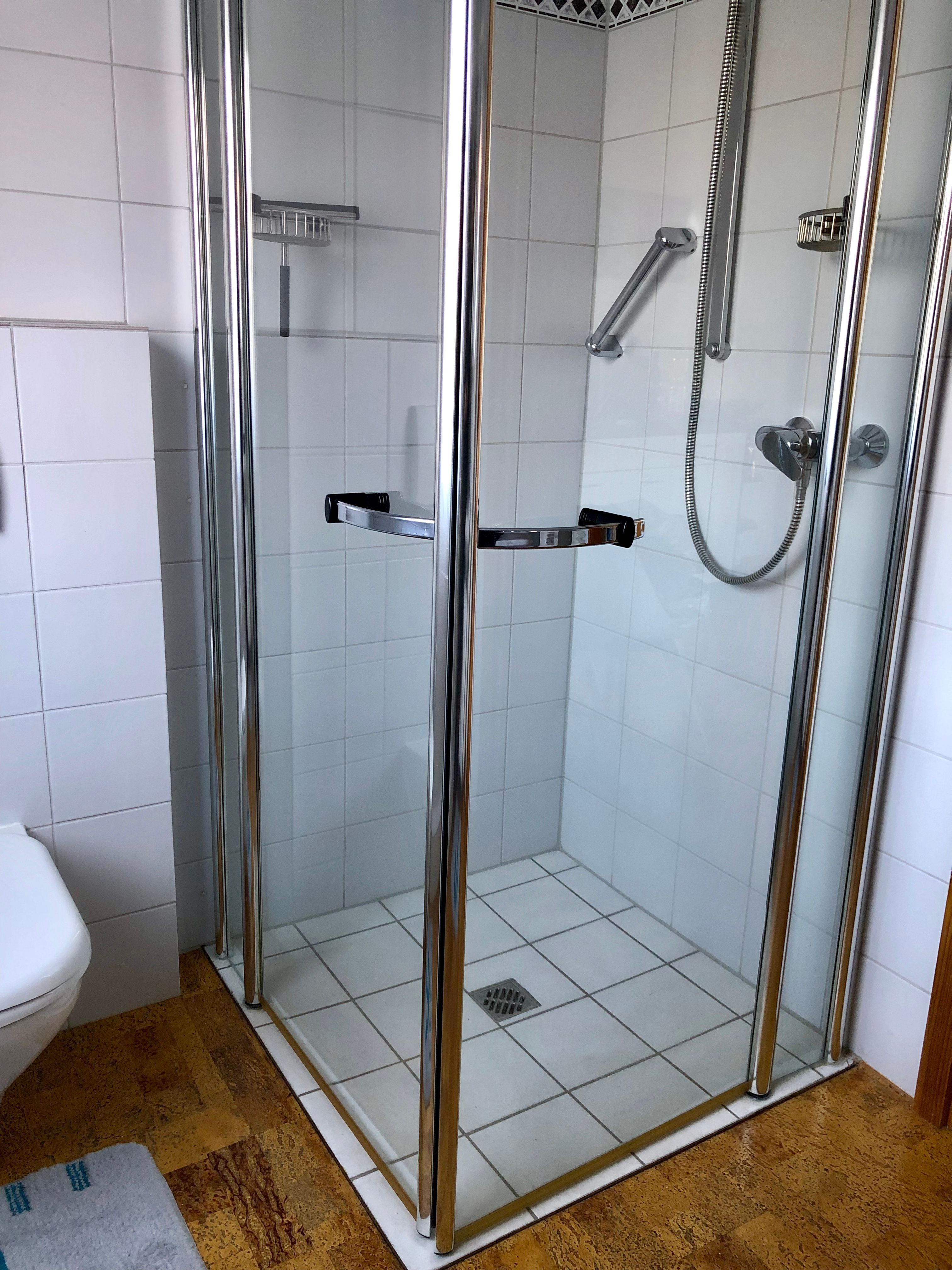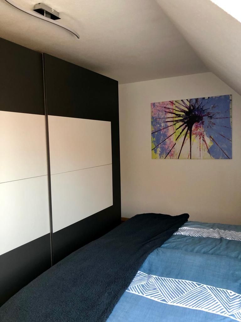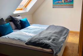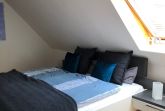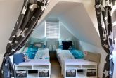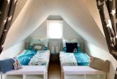 Im Obergeschoss befinden sich 3 Schlafzimmer für jeweils 2 Personen. Ein Badezimmer mit Dusch/Badewanne, WC, Waschbecken und Fön ist ebenfalls vorhanden. Zwei Schlafzimmer sind mit einem Doppelbett und Schrank ausgestattet, das Schlafzimmer ist mit 2 Einzelbetten und einem Schrank ausgestattet.
