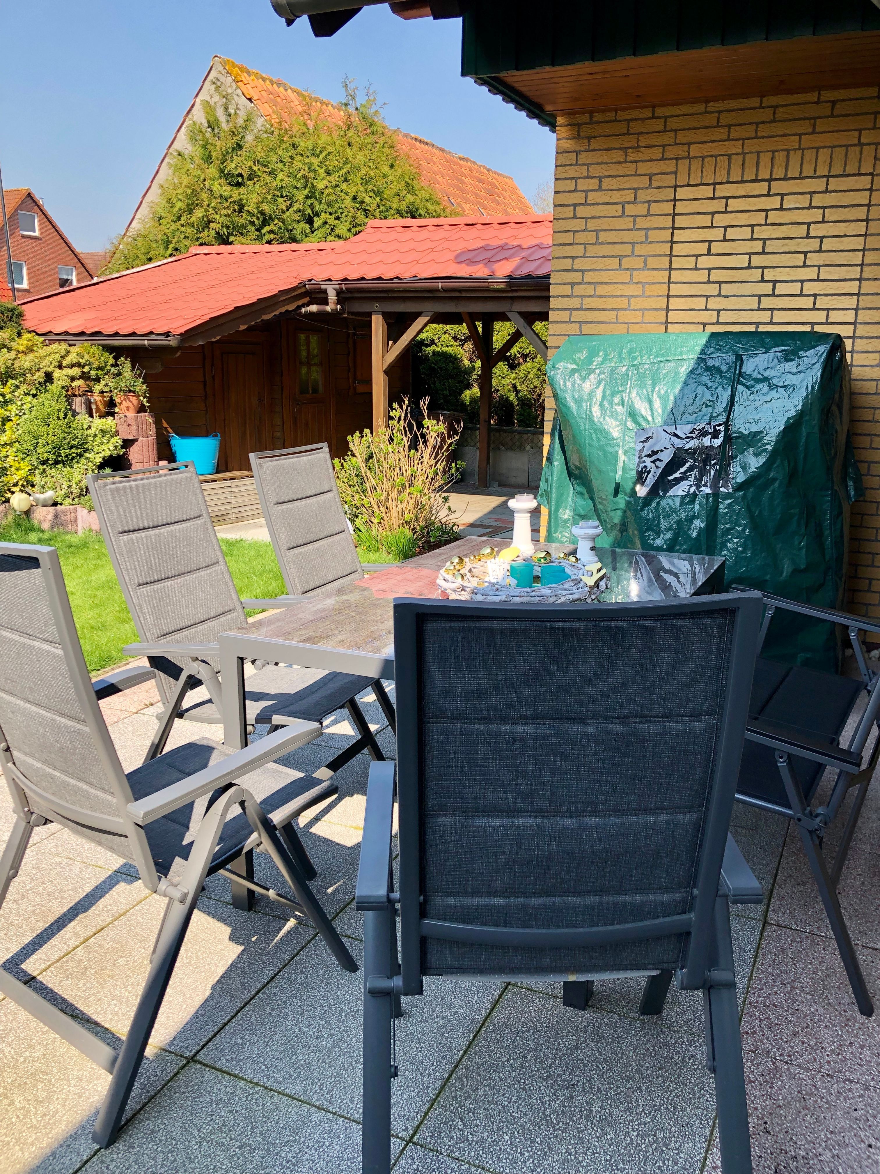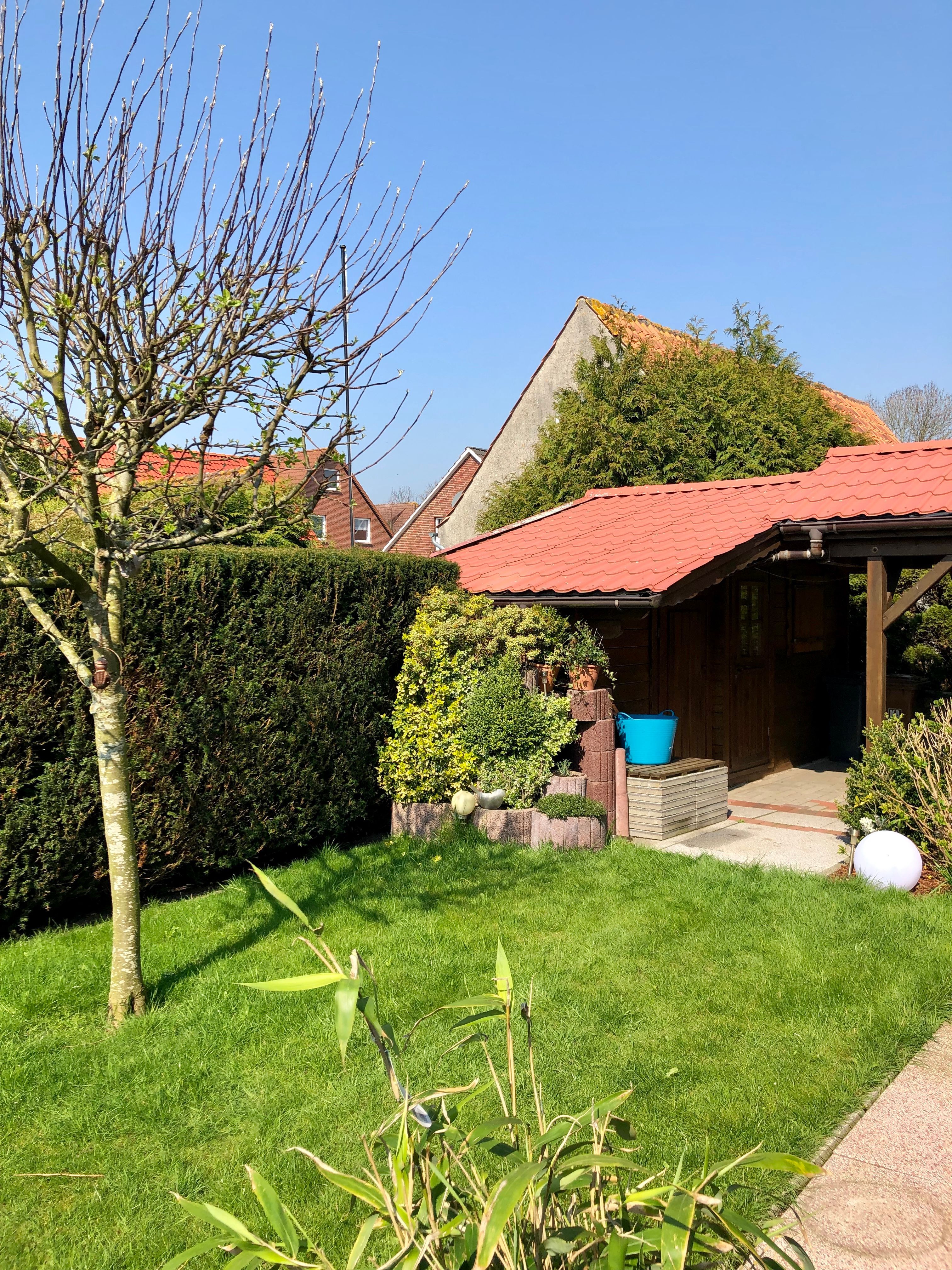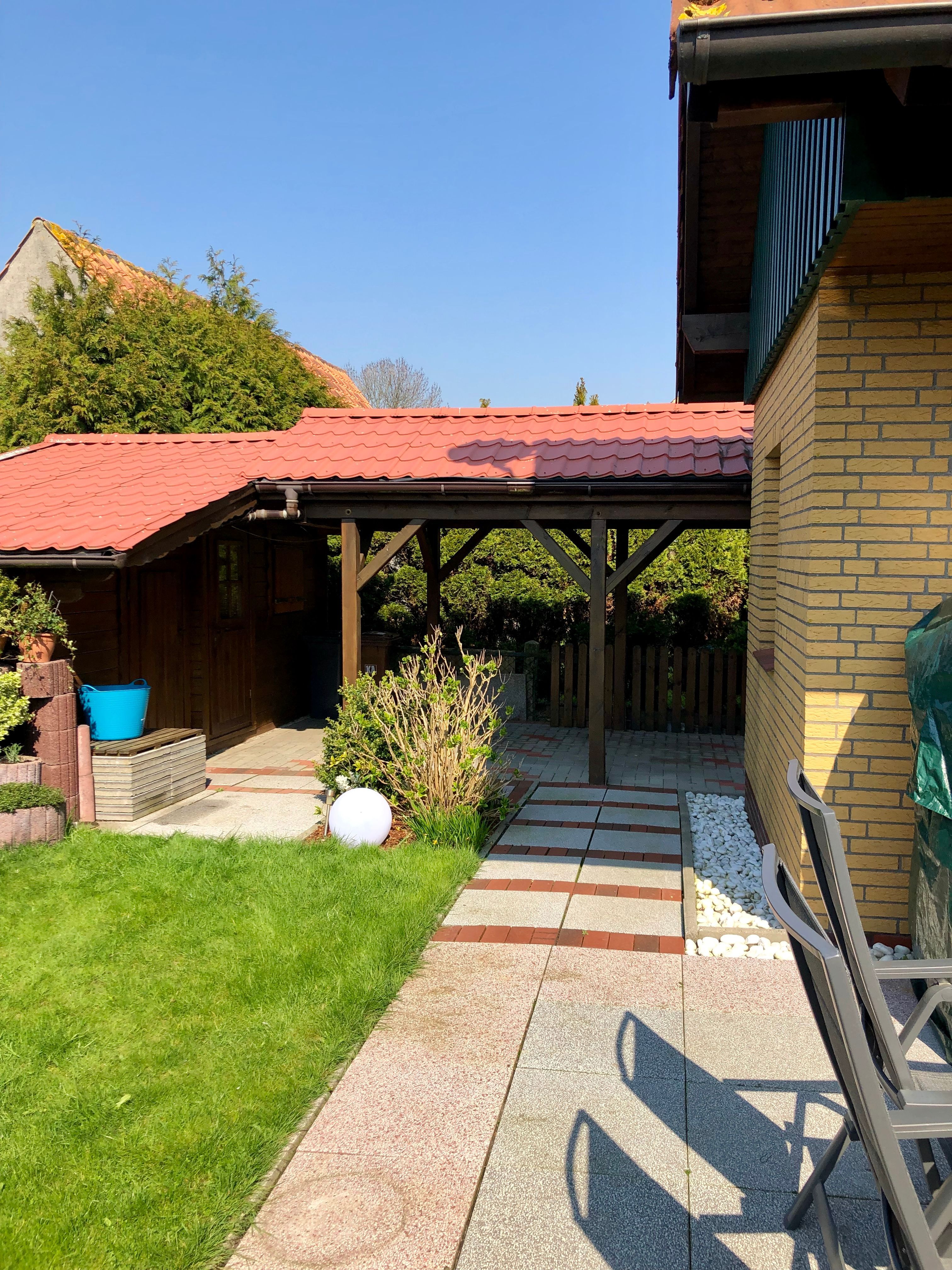 Von dort gelangen Sie auch auf die schöne, Sonnenterrasse mit ansprechenden Gartenmöbeln/ Strandkorb, abschließbarem Gartenhaus, großen Carport (mit abschließbaren Tor) und eingezäunten (durch Hecken) Garten.