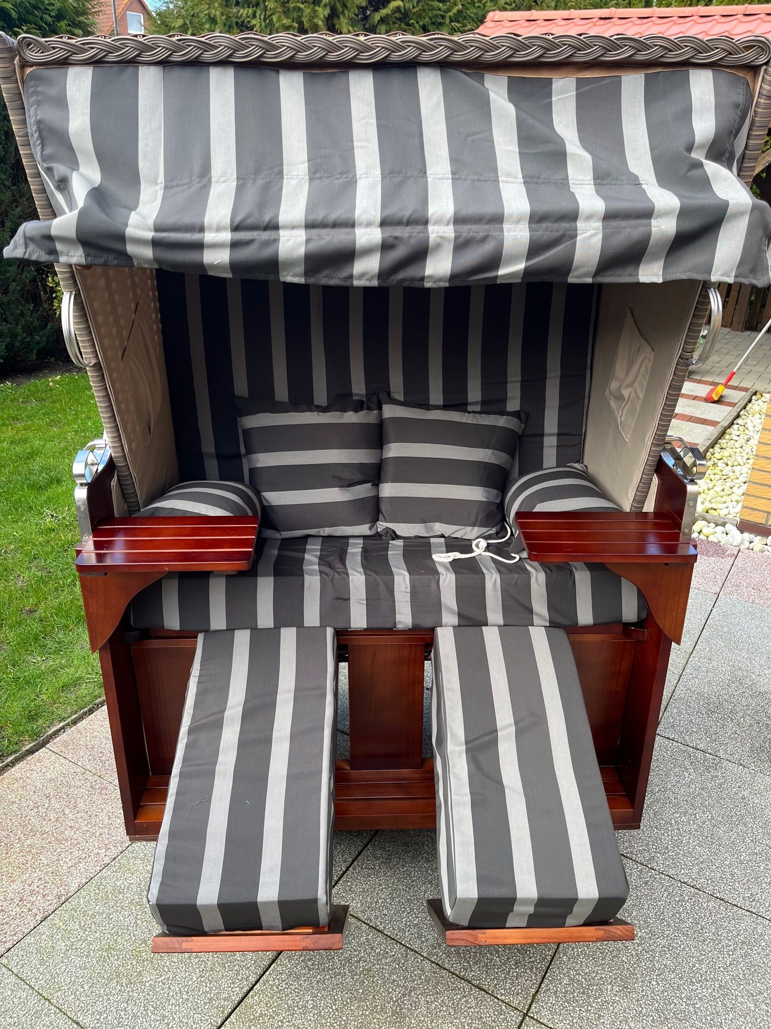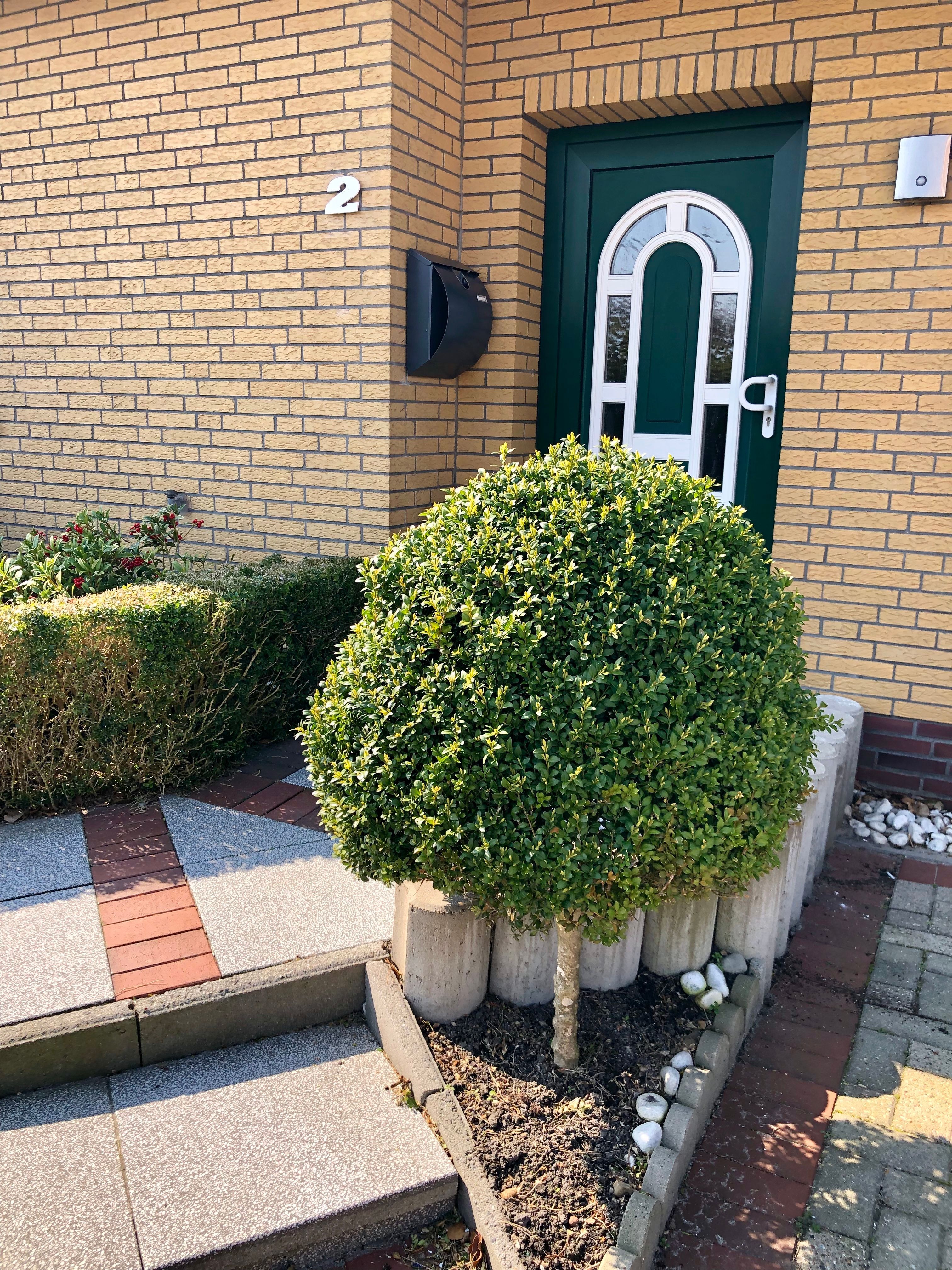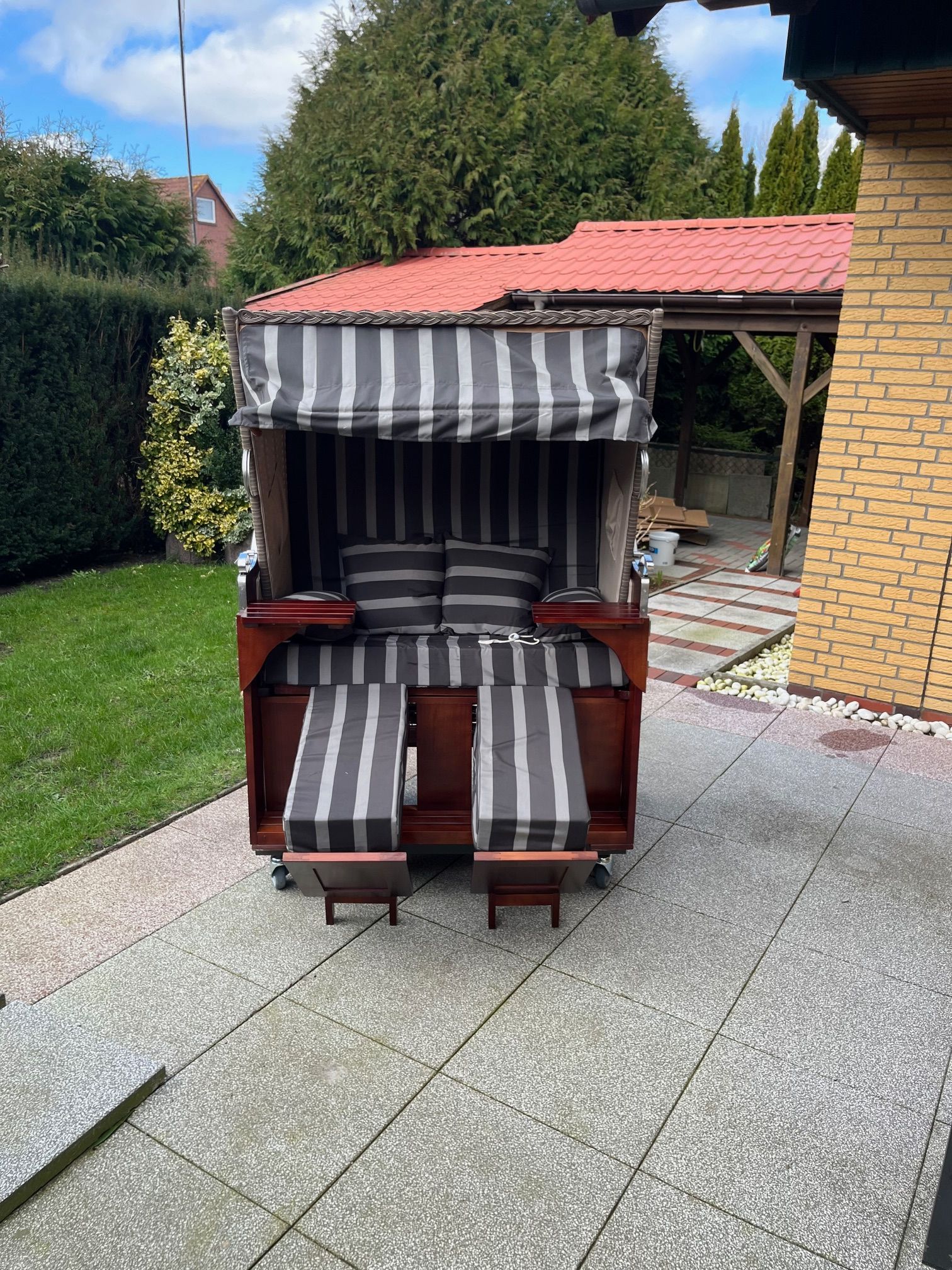 Von dort gelangen Sie auch auf die schöne, Sonnenterrasse mit ansprechenden Gartenmöbeln/ Strandkorb, abschließbarem Gartenhaus, großen Carport (mit abschließbaren Tor) und eingezäunten (durch Hecken) Garten.