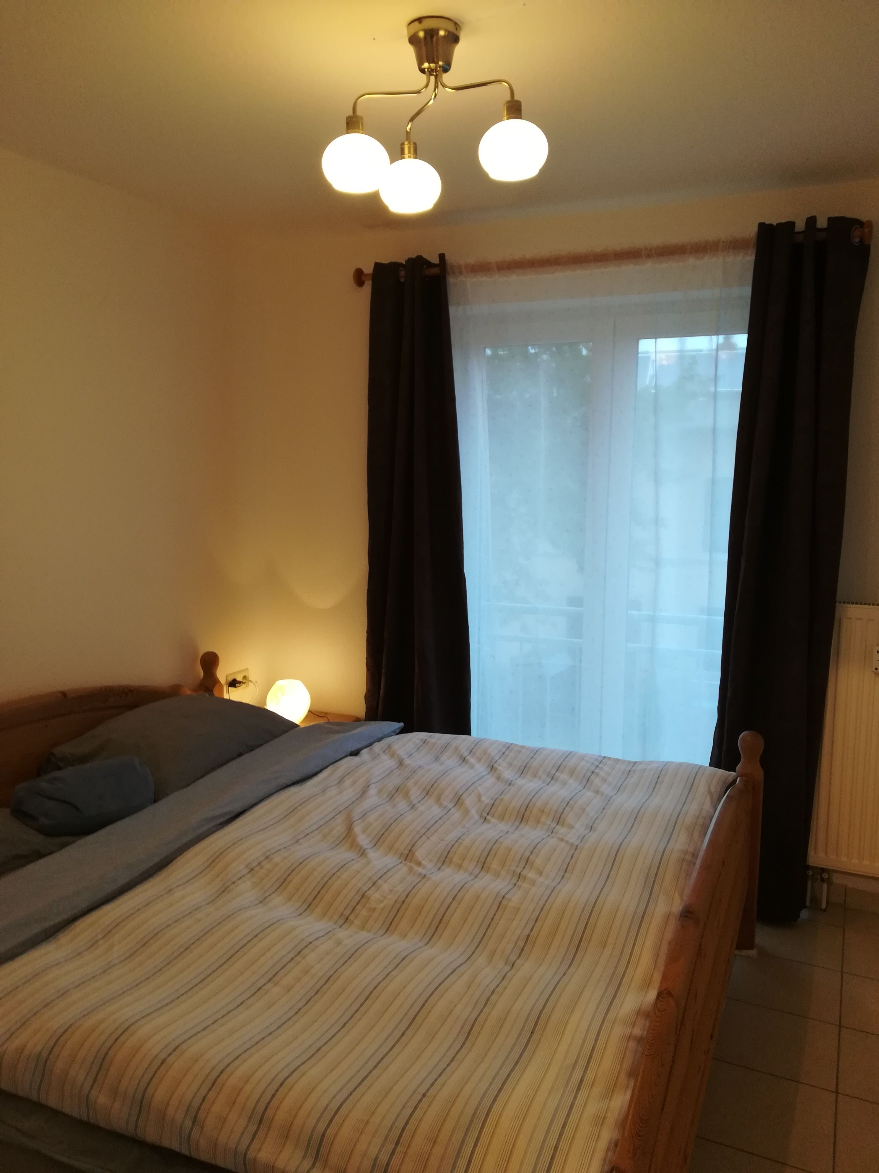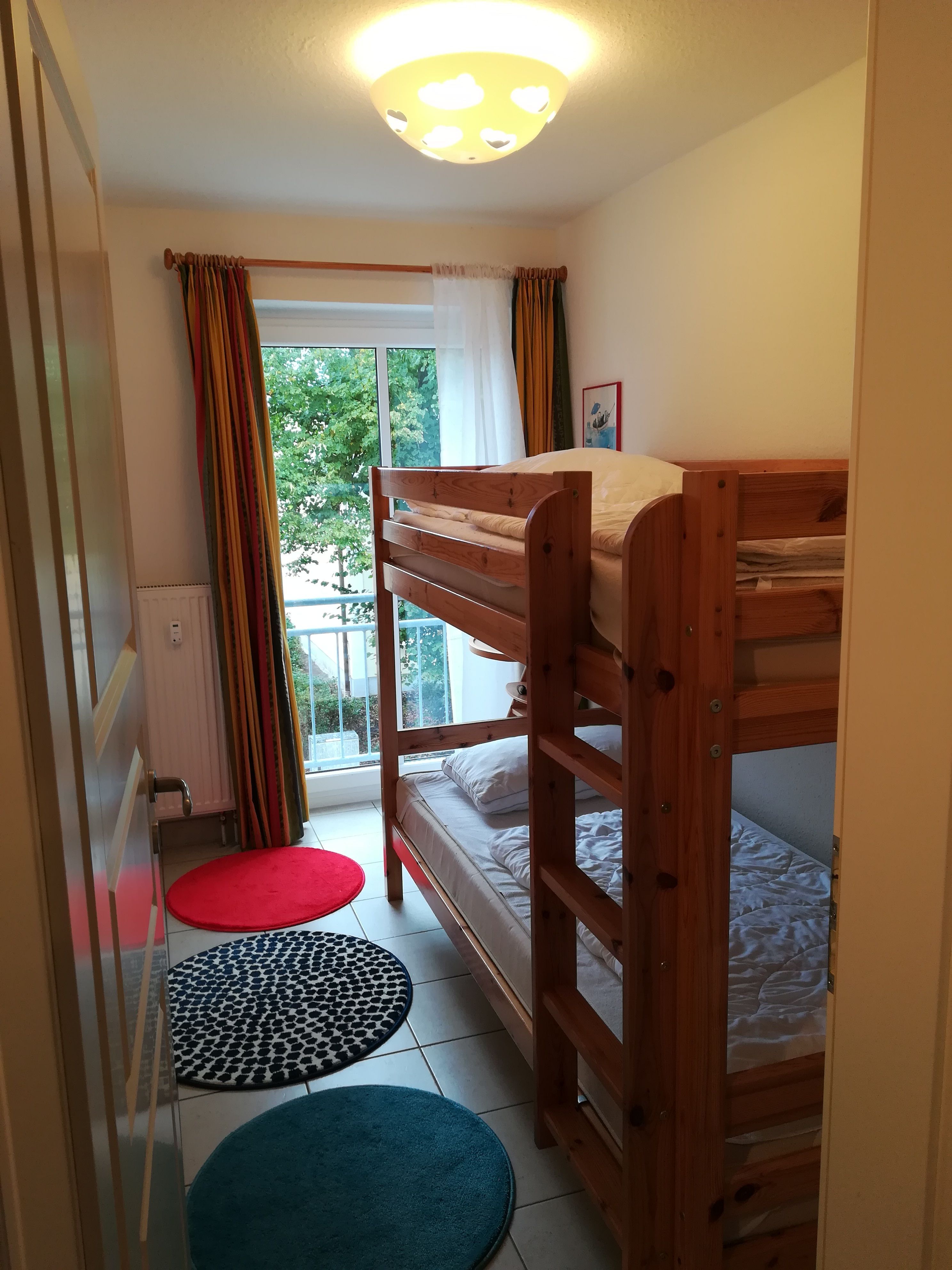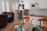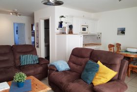1 Schlafzimmer Doppelbett und 1 Schlafzimmer Etagenbett. Wohnzimmer mit integrierter Küchenzeile. Badezimmer mit Dusche und WC. Balkon mit Blick zum Wasser.
