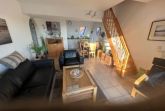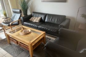 Der Wohnbereich ist mit modernen, belederten Sitzmöbeln ausgestattet, hochwertigem Oled Fernseher mit hd+-Karte, Soundbar mit Subwoofer, Blue-Ray Player und Radio mit Bluetooth.