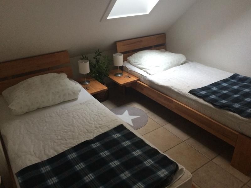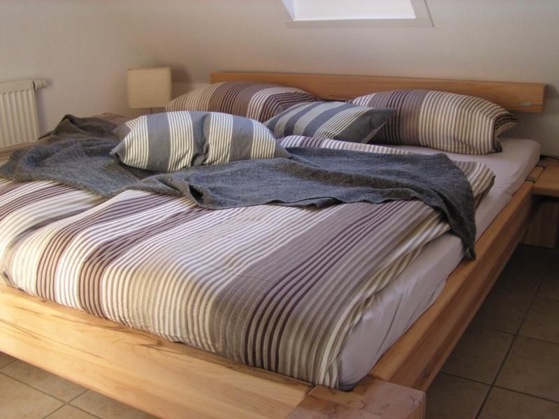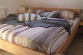 Ein Schlafzimmer hat ein Doppelbett aus Kernbuche von Natura, daneben ein Schlafzimmer mit 2 Einzelbetten und einem zweiten hochwertigen Flachbild-TV, mit einer Play-Station 3, die auch Blue-Ray-Player ist.
