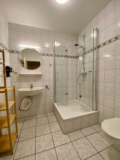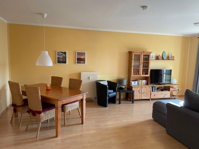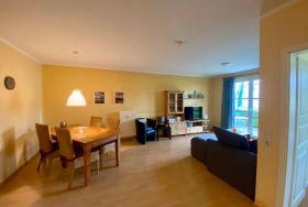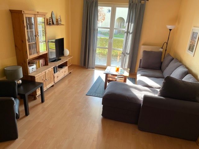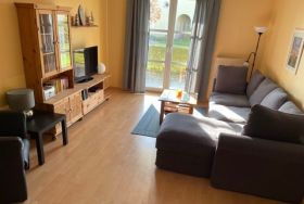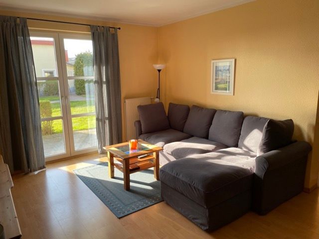 Unsere gemütliche Ferienwohnung mit Terrasse befindet sich im Erdgeschoss und hat einen großzügigen Wohn- und Essbereich für 4 Personen sowie eine Schlafcouch. ?Im Wohnbereich ist eine Küchenzeile, welche mit einem Geschirrspüler, Herd und einer Mikrowelle ausgestattet ist. Das Schlafzimmer verfügt über ein Doppelbett. Im Badezimmer befindet sich eine Dusche und WC.