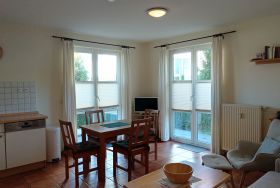 Die kleine, helle und freundliche Ferienwohnung ist ebenerdig mit Terrasse und Gartenzugang angelegt. Sie verfügt über einen Wohnbereich mit integrierter Küchenzeile, einem Schlafzimmer mit Doppelbett und einem Badezimmer mit Dusche und WC. Das Auto parken Sie ganz bequem in der Tiefgarage. Der Stellplatz ist identisch mit der Wohnungsnummer. Schwimmbad (täglich geöffnet) und Sauna (dienstags, freitags und samstags geöffnet) stehen ebenfalls zur Verfügung. Wäschepakete können jederzeit zugebucht werden. 20,00 Euro pro Person. Sie können auch gern Ihre eigene Bettwäsche und Handtücher mitbringen.