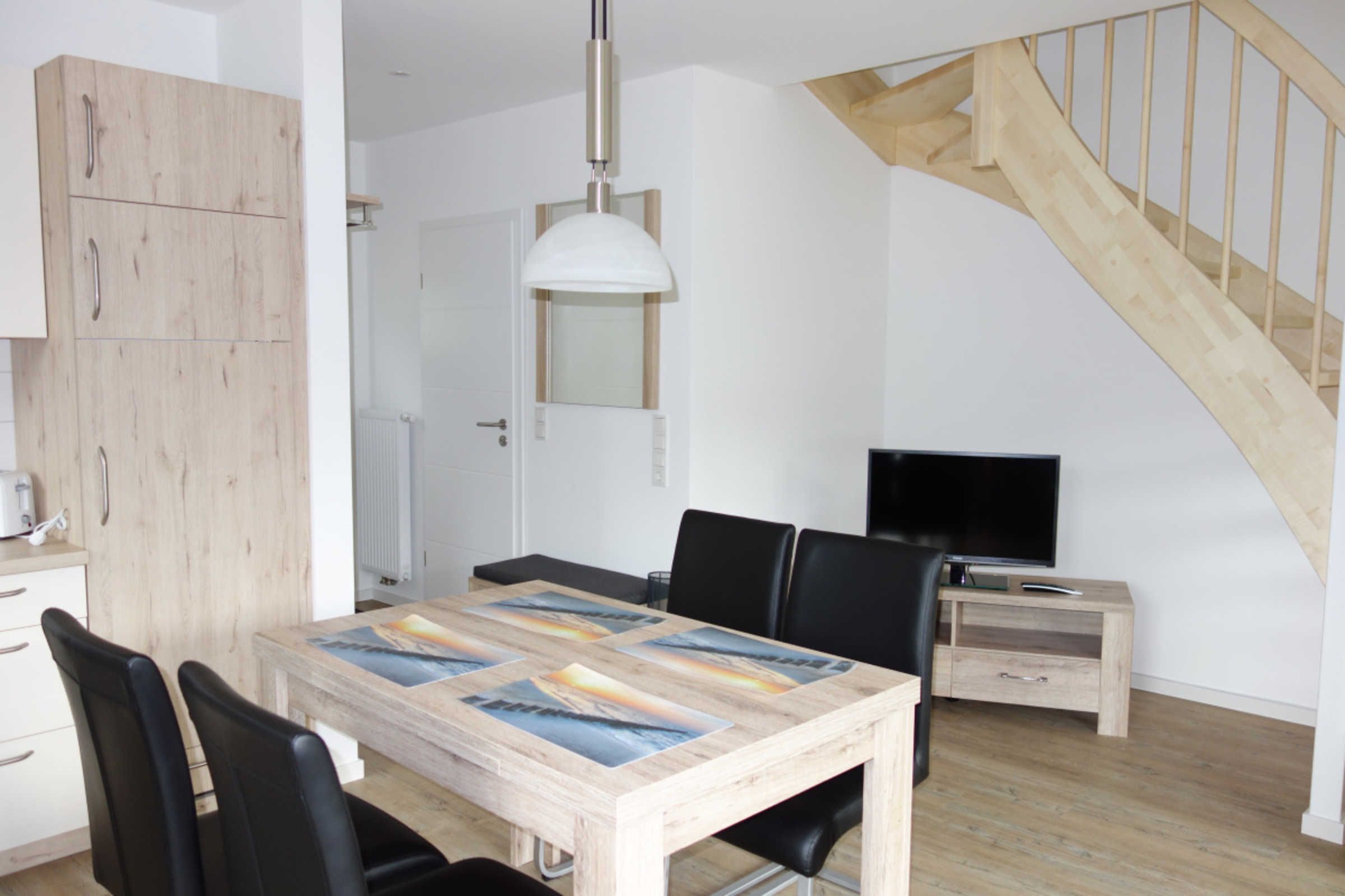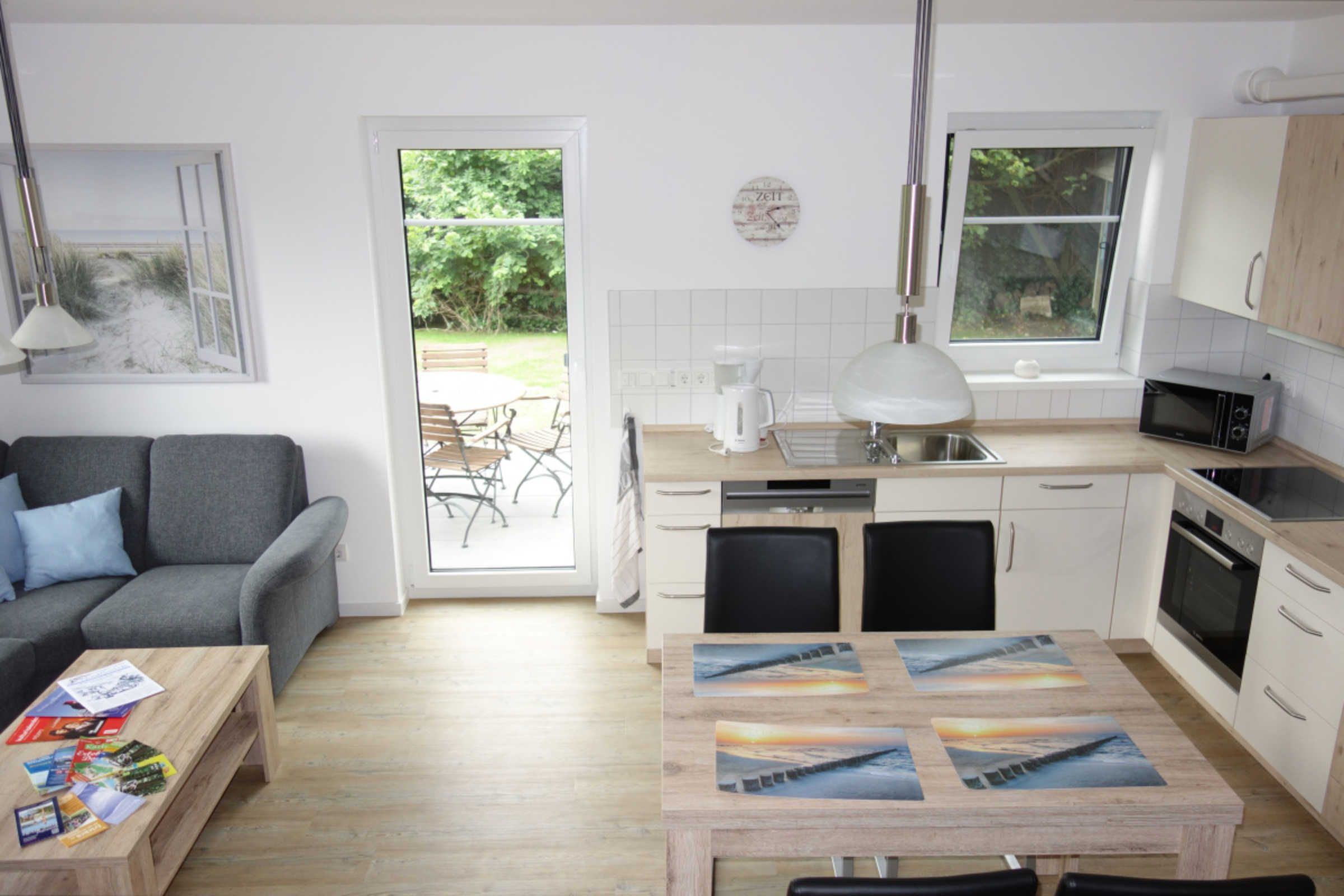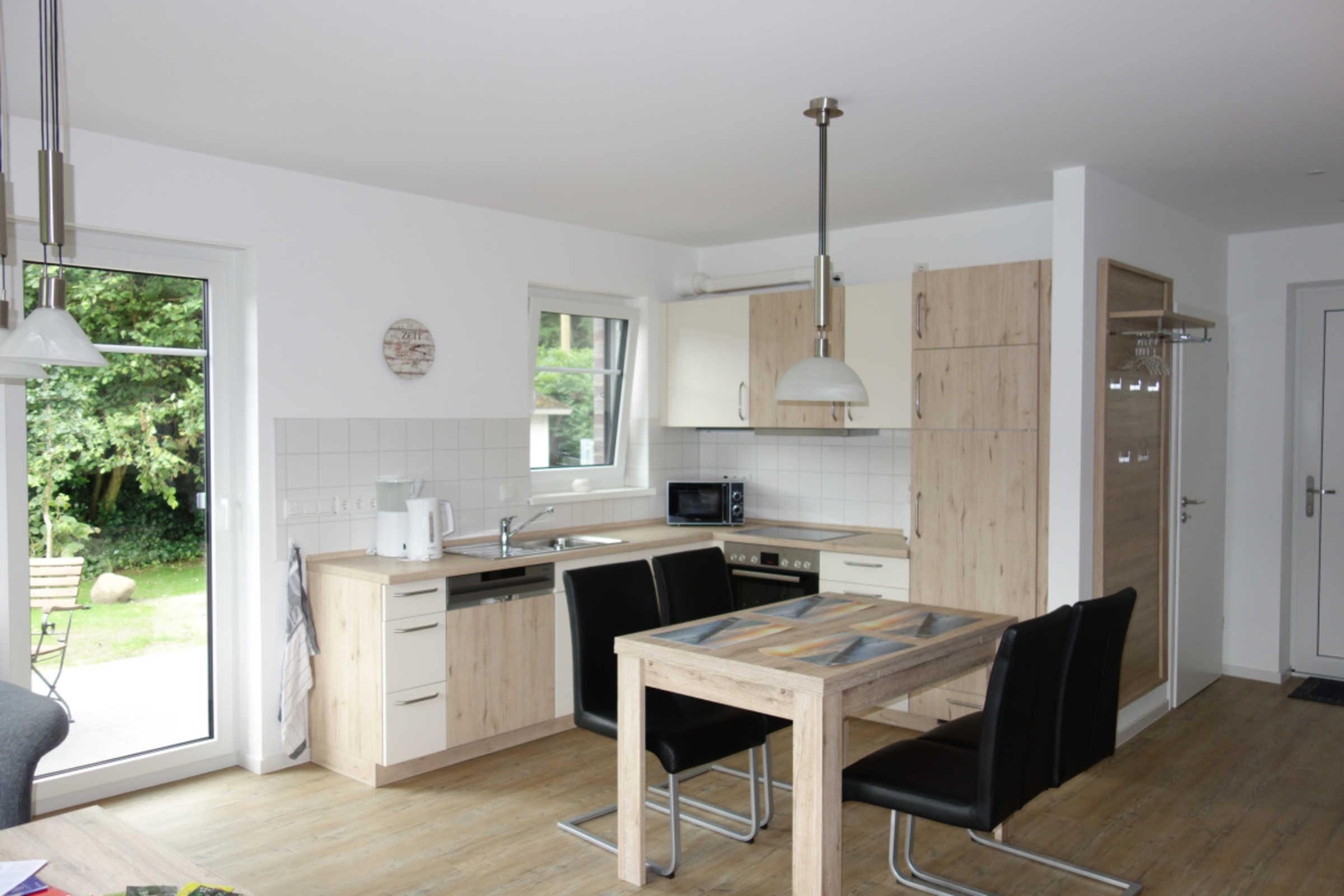 Die große Küchenzeile ist komplett ausgestattet u.a. mit einem Backofen, einem Cerankochfeld mit 4 Kochflächen, einem Kühlschrank, einem kleinem Gefrierfach, einer Kaffeemaschine und einem Wasserkocher. An dem Esstisch mit 4 Stühlen können Sie die Mahlzeiten einnehmen oder Gesellschaftsspiele spielen.