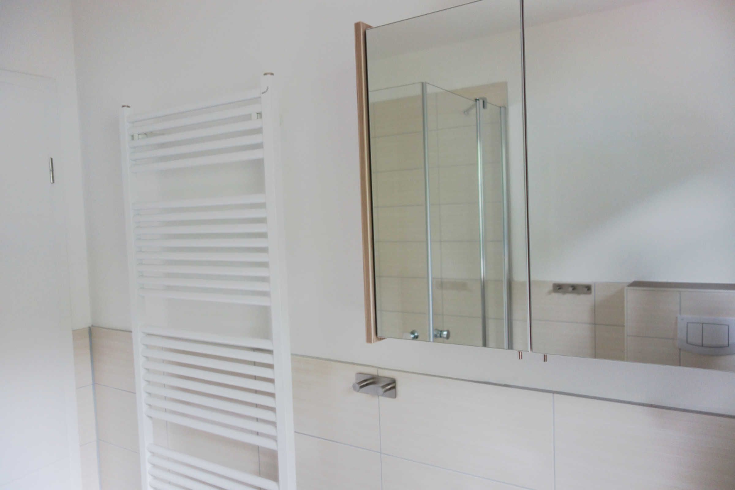 Das Bad im Obergeschoss hat ein Fenster und verfügt über ein WC, eine Dusche und ein Waschbecken.