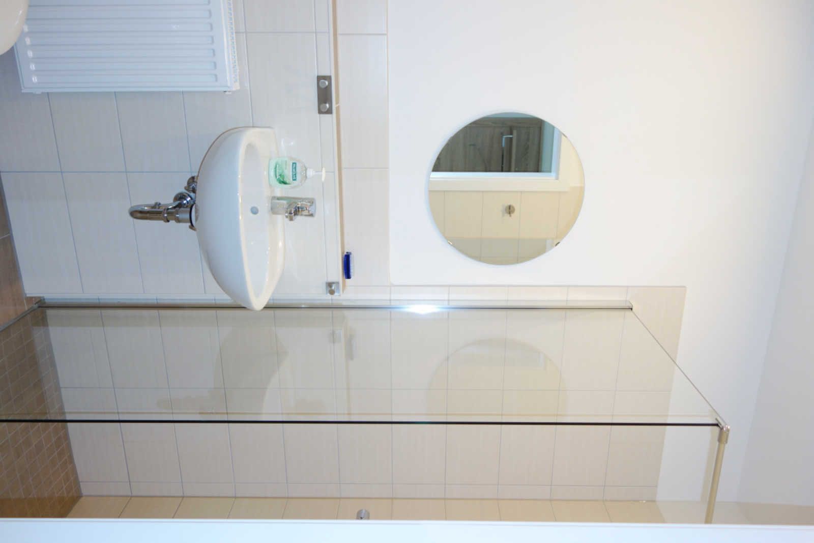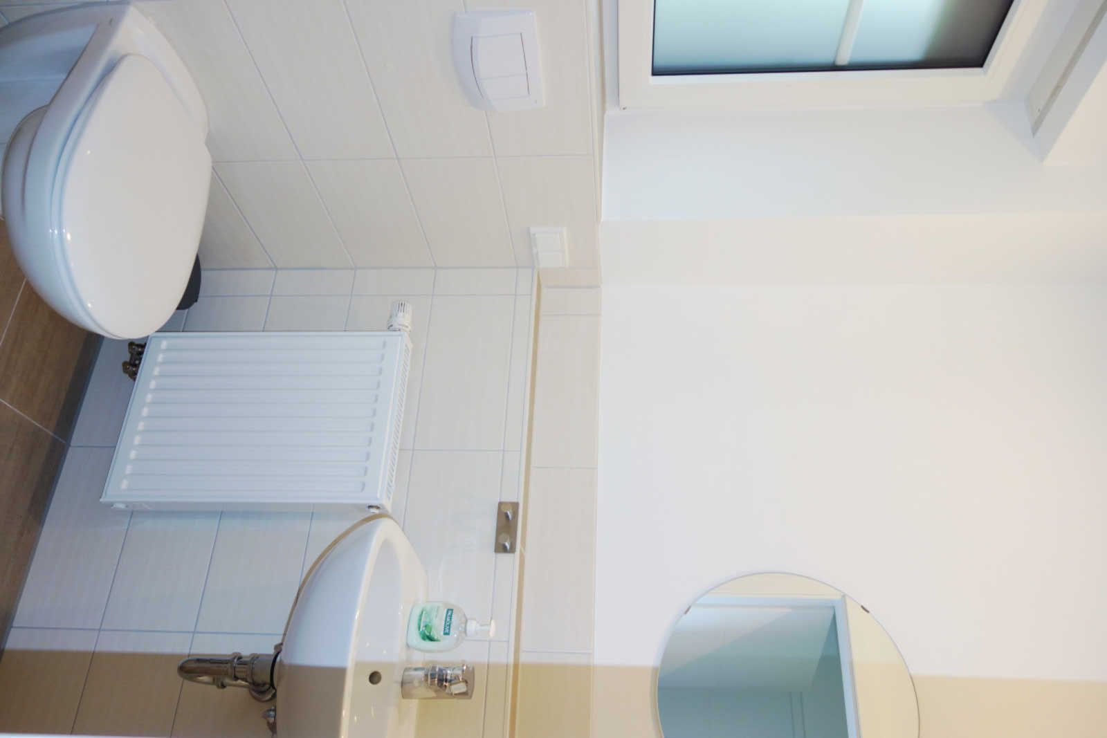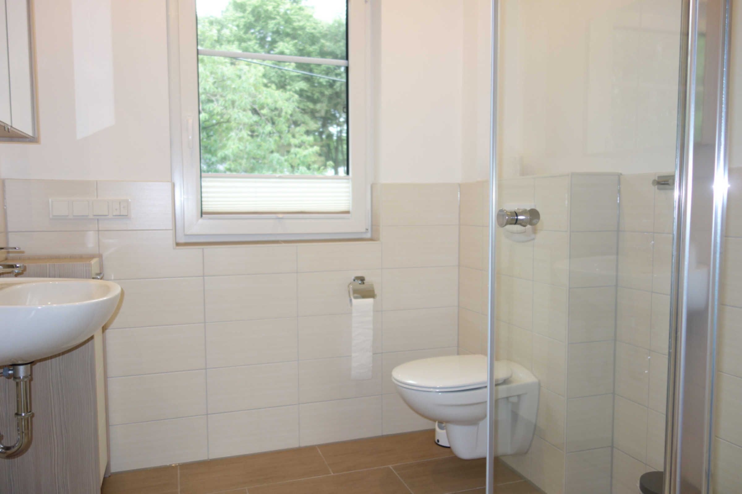 In dem Bad mit Fenster finden Sie eine Dusche, ein WC und ein Waschbecken.