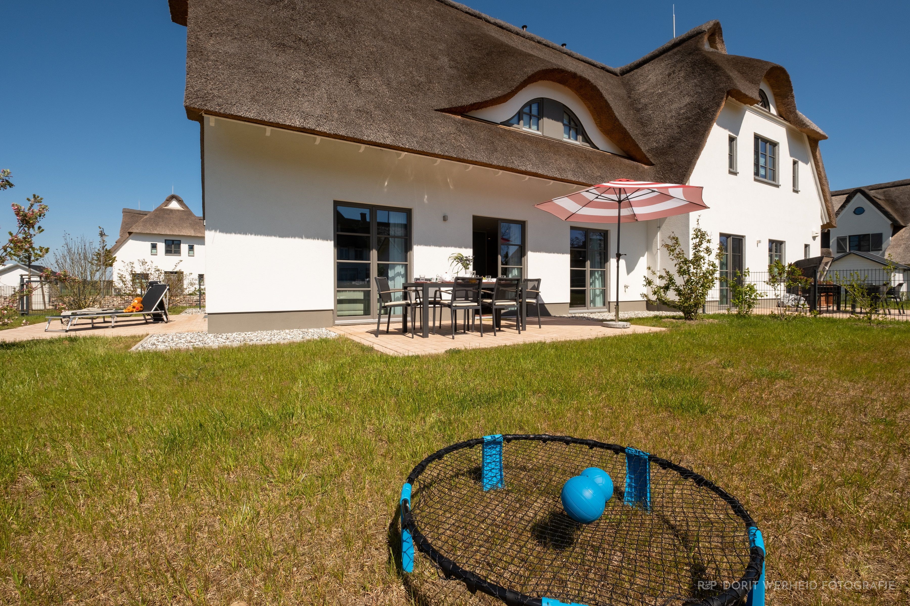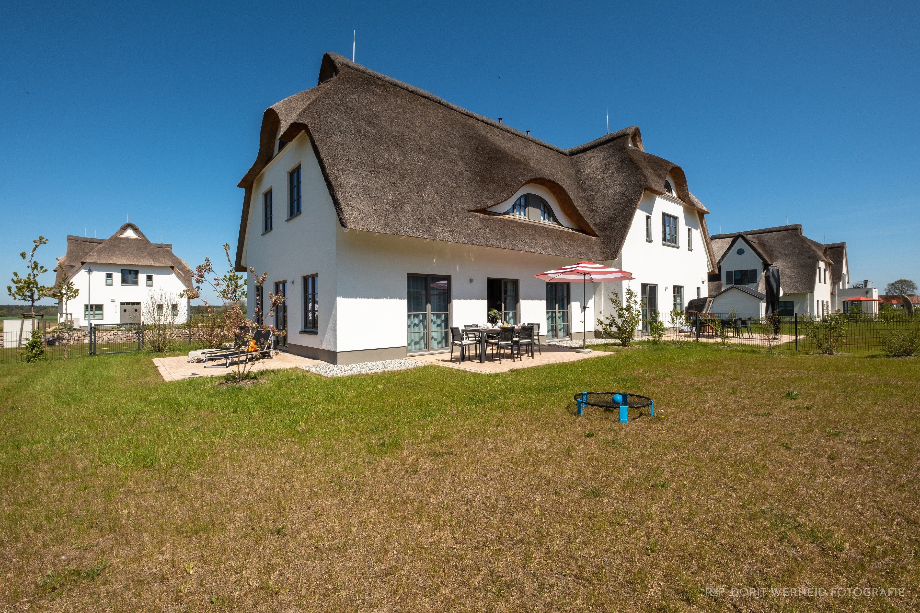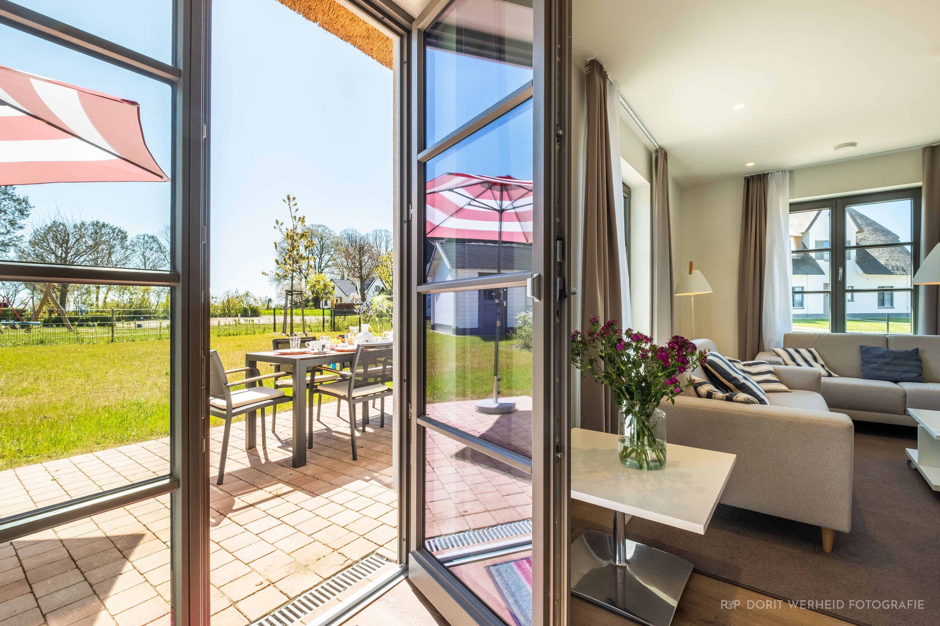 Die Reet gedeckten Häuser wurden in nachhaltiger Holzbauweise errichtet und die Einrichtung ist durch helle sowie freundliche Farben geprägt. Der Blick auf die Haffküste und die umliegende Natur machen Ihren Urlaub einzigartig.