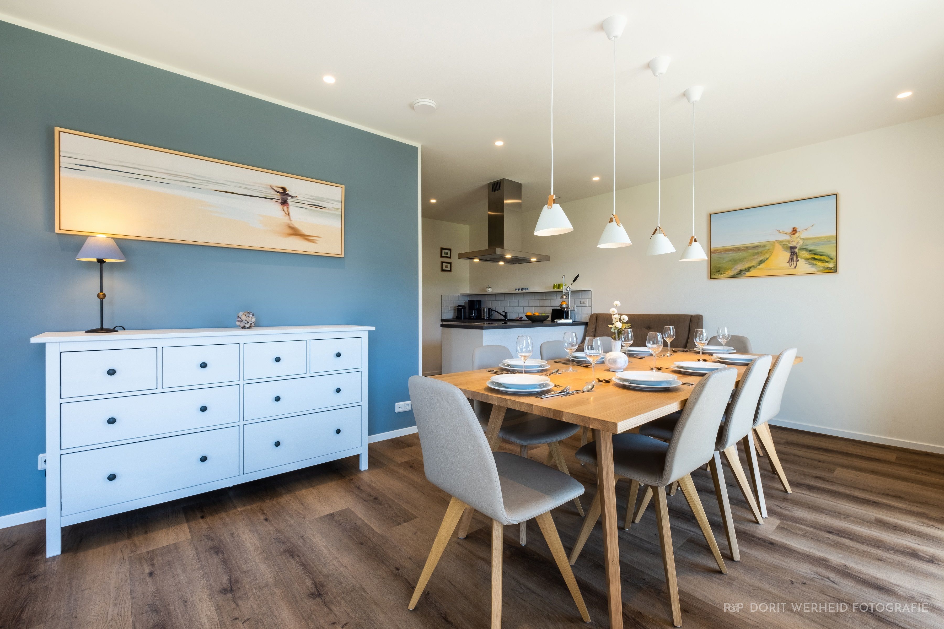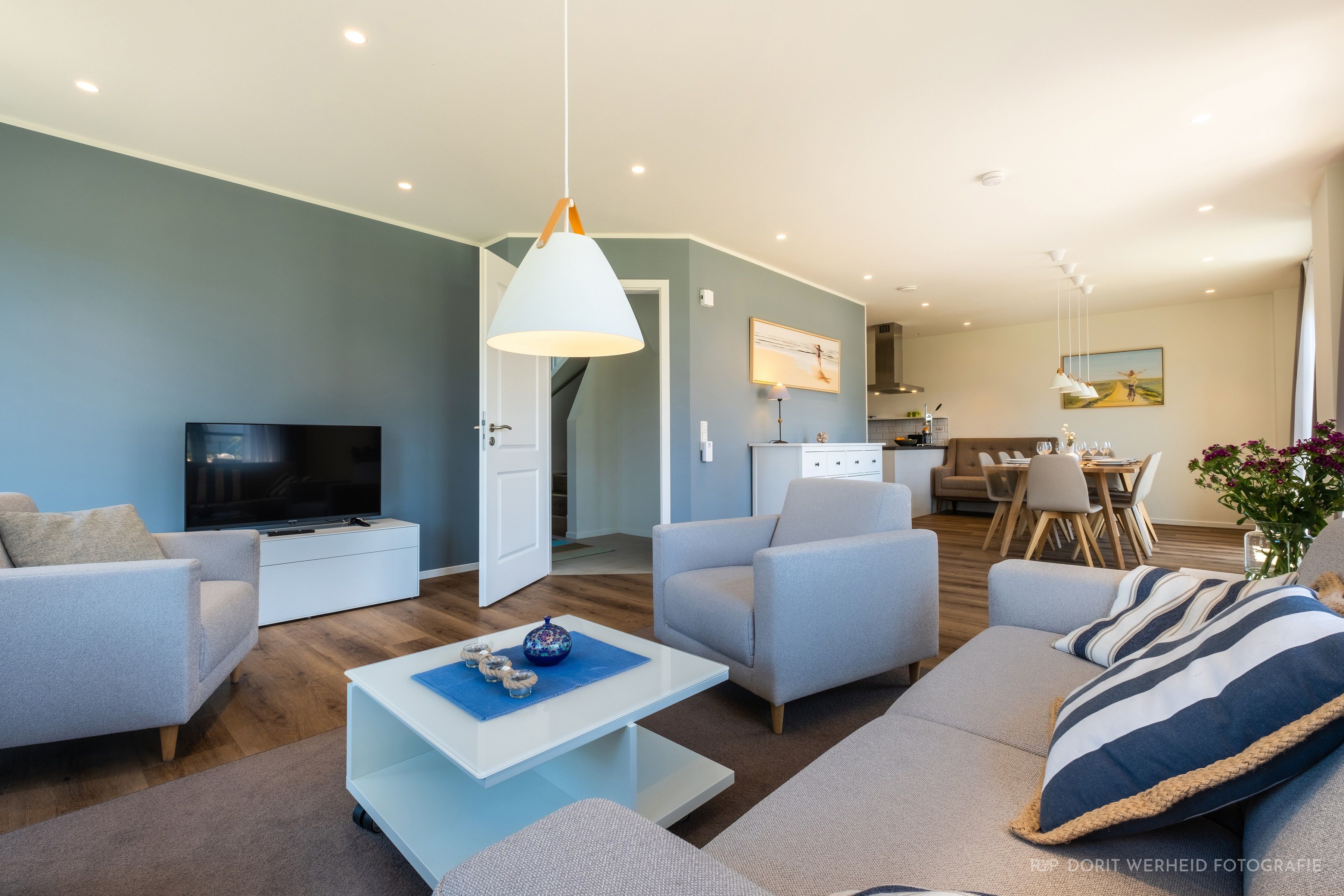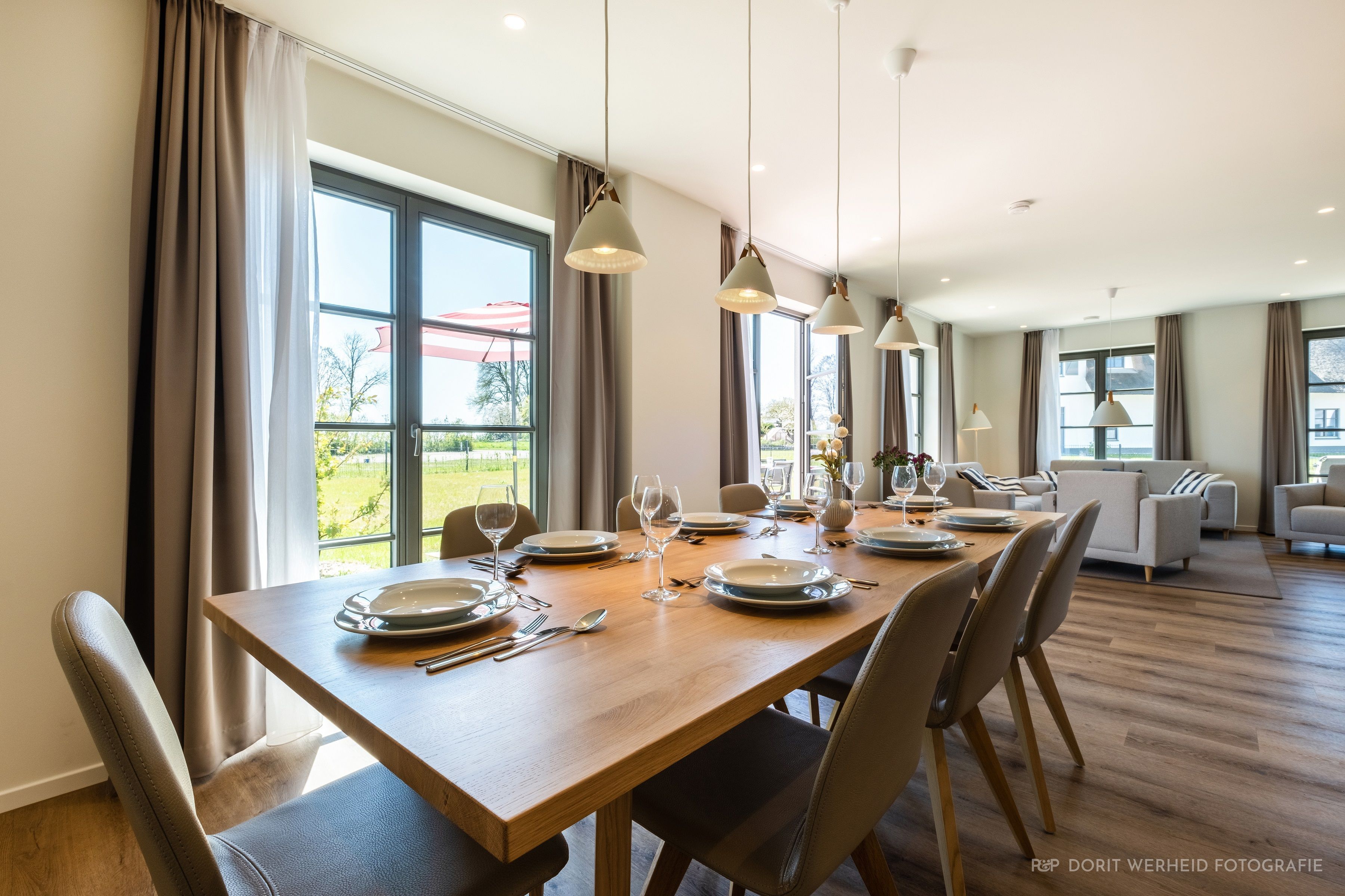 Der großzügige Raum lädt zum Verweilen ein. Hier findest du ein bequemes 3-Sitzer-Sofa, einen Flachbild-TV für entspannte Abende und einen Esstisch, der Platz für bis zu 8 Personen bietet perfekt für gemeinsame Mahlzeiten und gesellige Stunden.