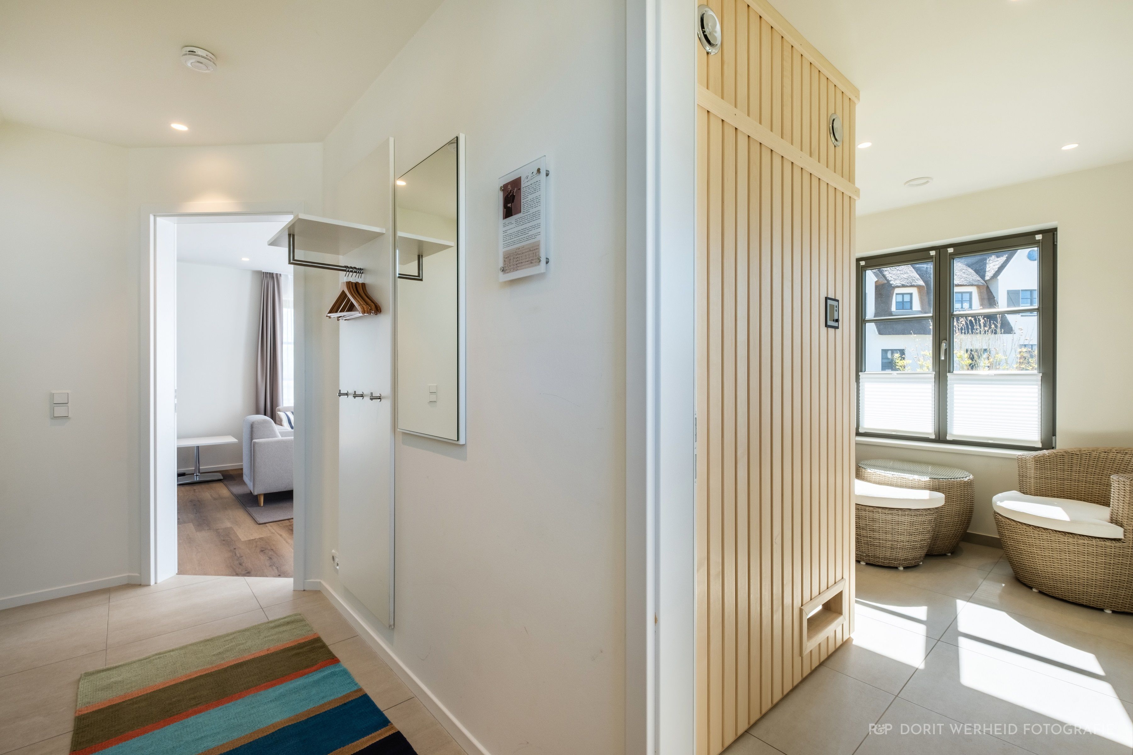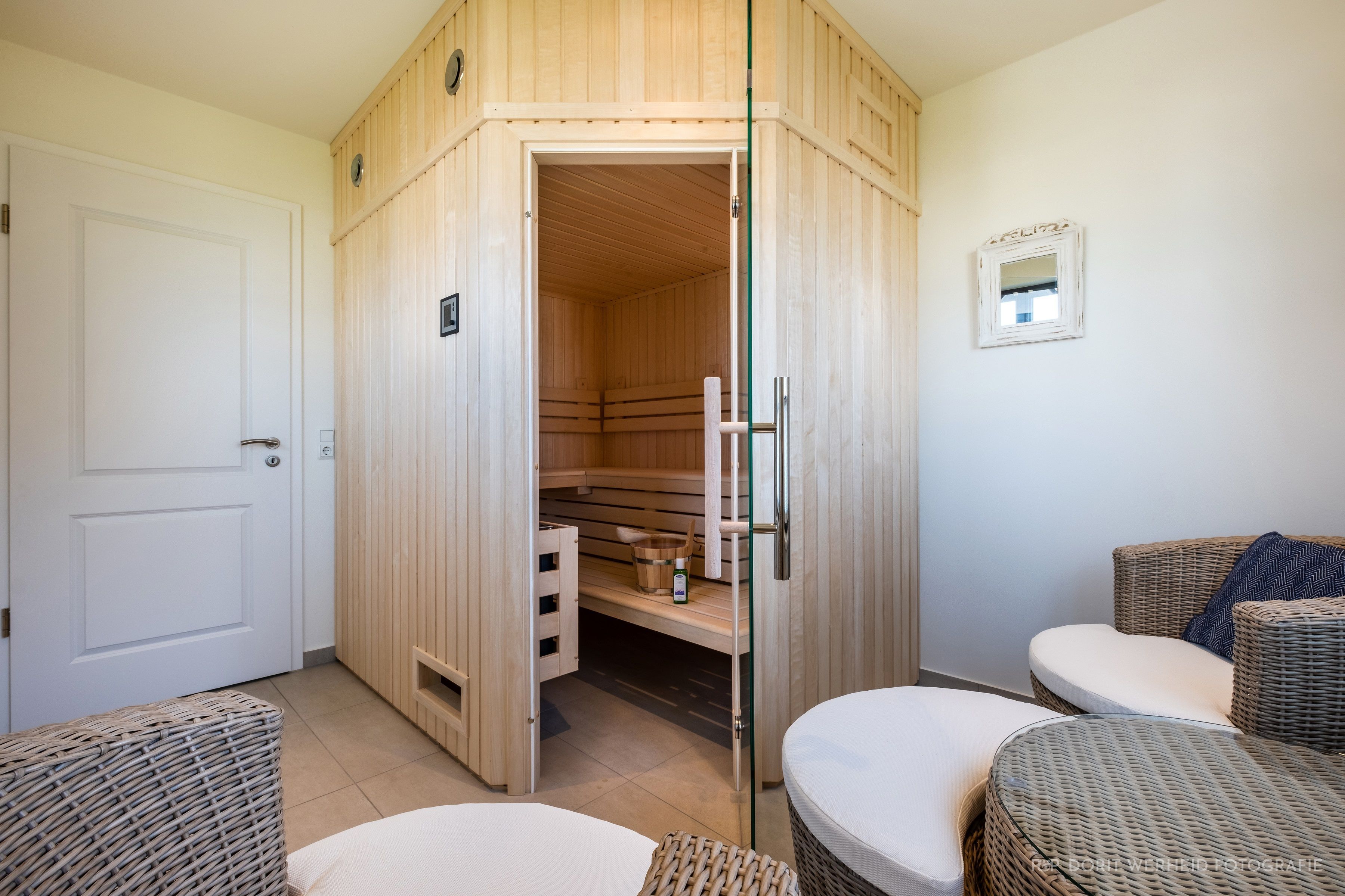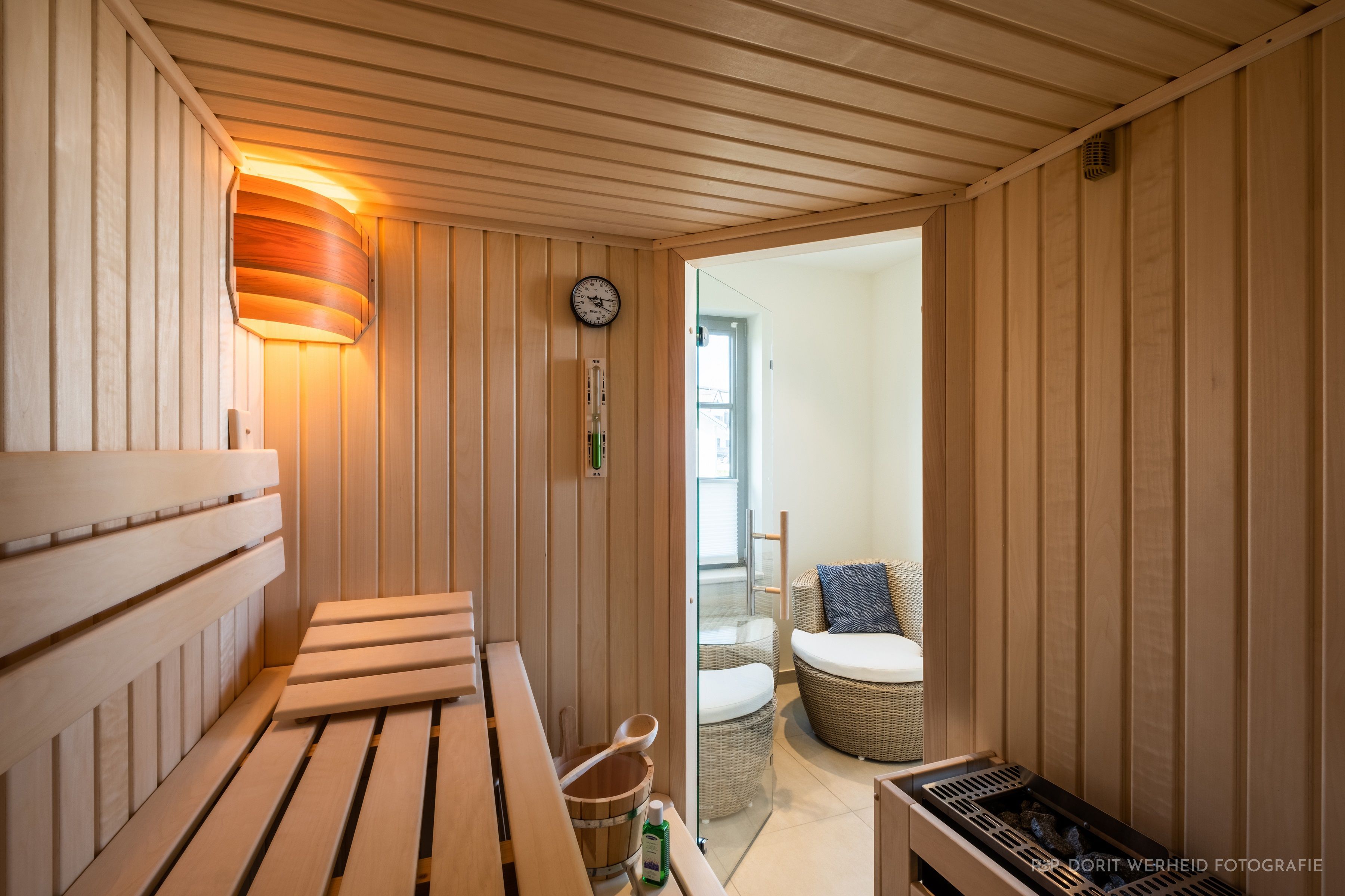 Ein separater Raum mit einer finnischen Sauna für 4 Personen lädt zum Entspannen ein. Zusätzlich gibt es einen Ruhebereich, um die Seele baumeln zu lassen.