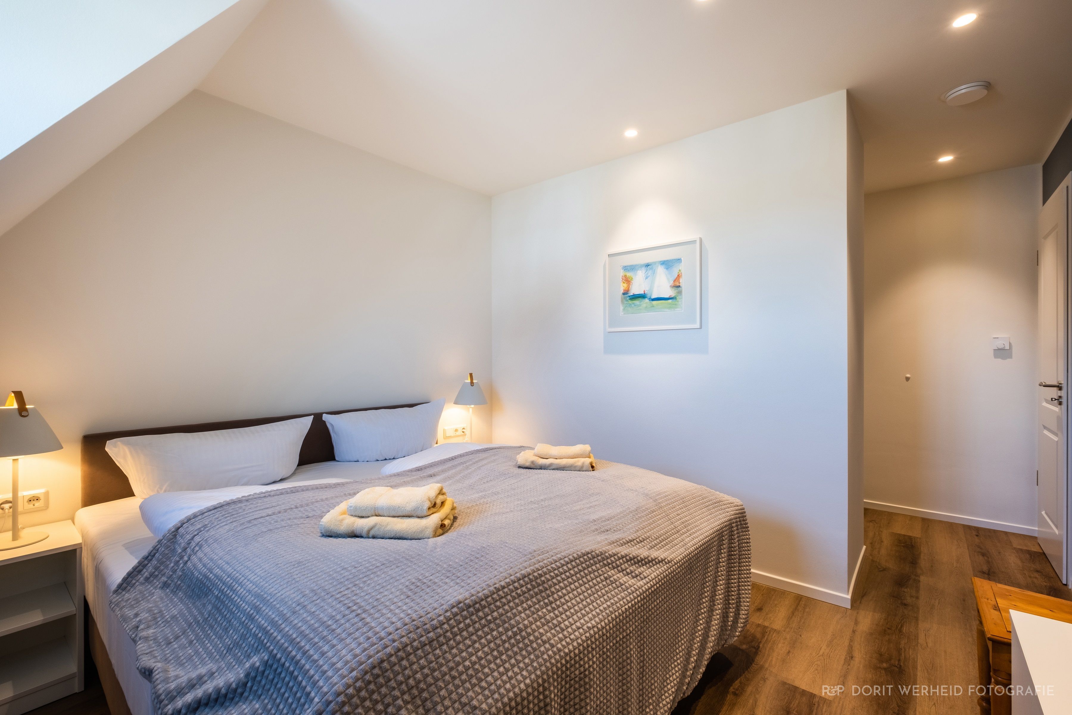 Drei Schlafzimmer mit jeweils einen Doppelbett von 180 x 200 cm, eigenem Flat-TV bieten erholsamen Schlaf und private Rückzugsorte.