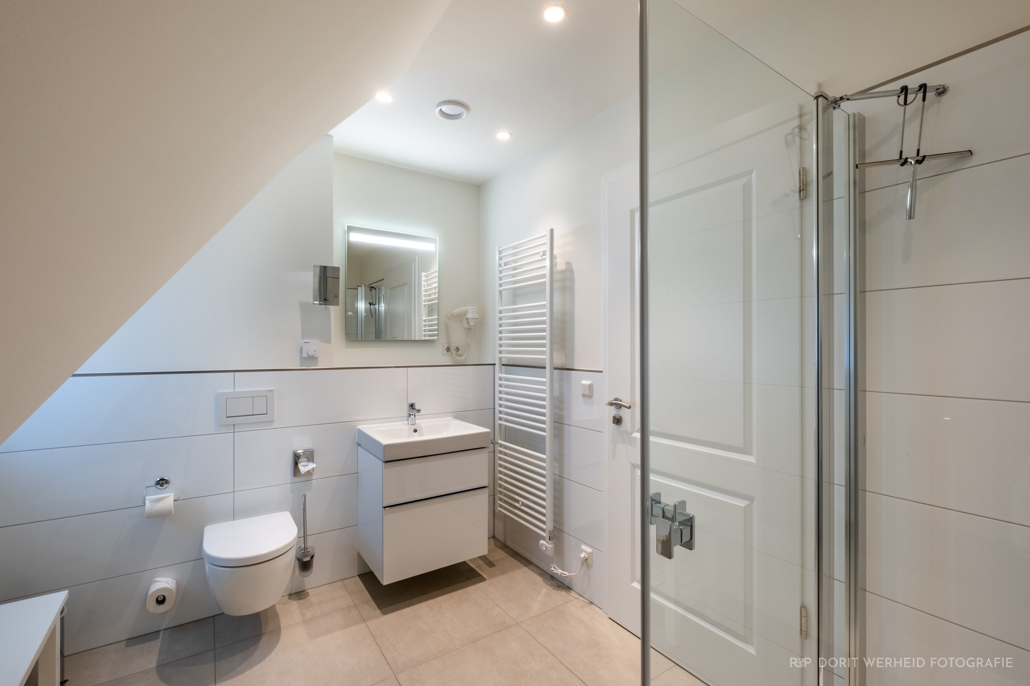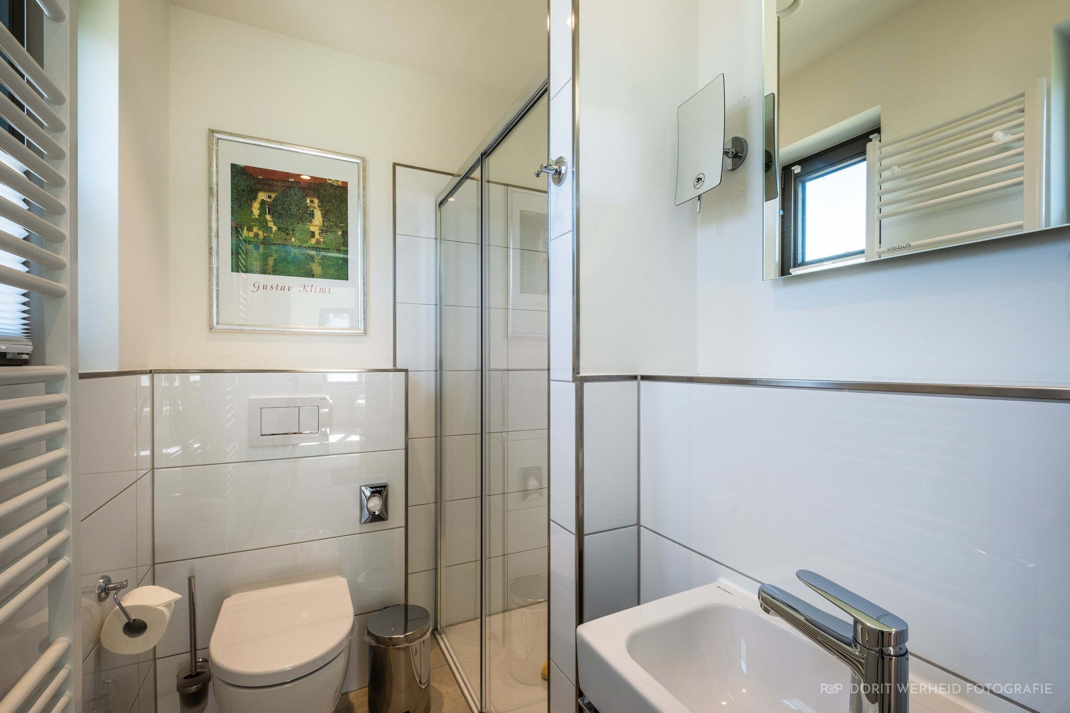 Zwei moderne Badezimmer mit WC und ebenerdiger Dusche sorgen für Komfort. In einem Badezimmer steht außerdem ein Wasch-Trockner zur Verfügung.