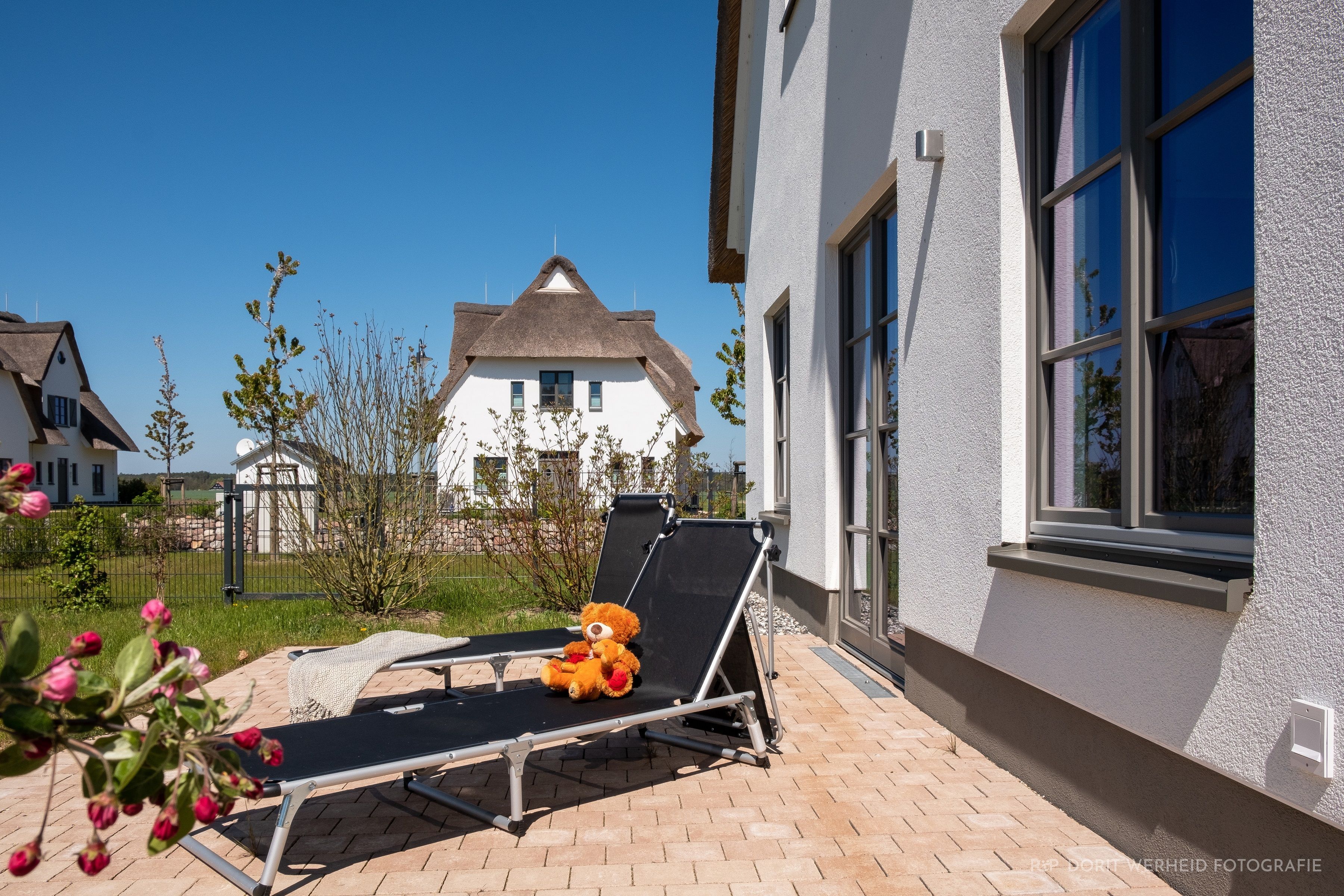 Zwei möblierte Terrassen in südwestlicher Ausrichtung bieten Platz zum Sonnenbaden und Relaxen. Das voll eingezäunte Grundstück sorgt für Privatsphäre und Sicherheit für Ihre Kinder und Vierbeiner.