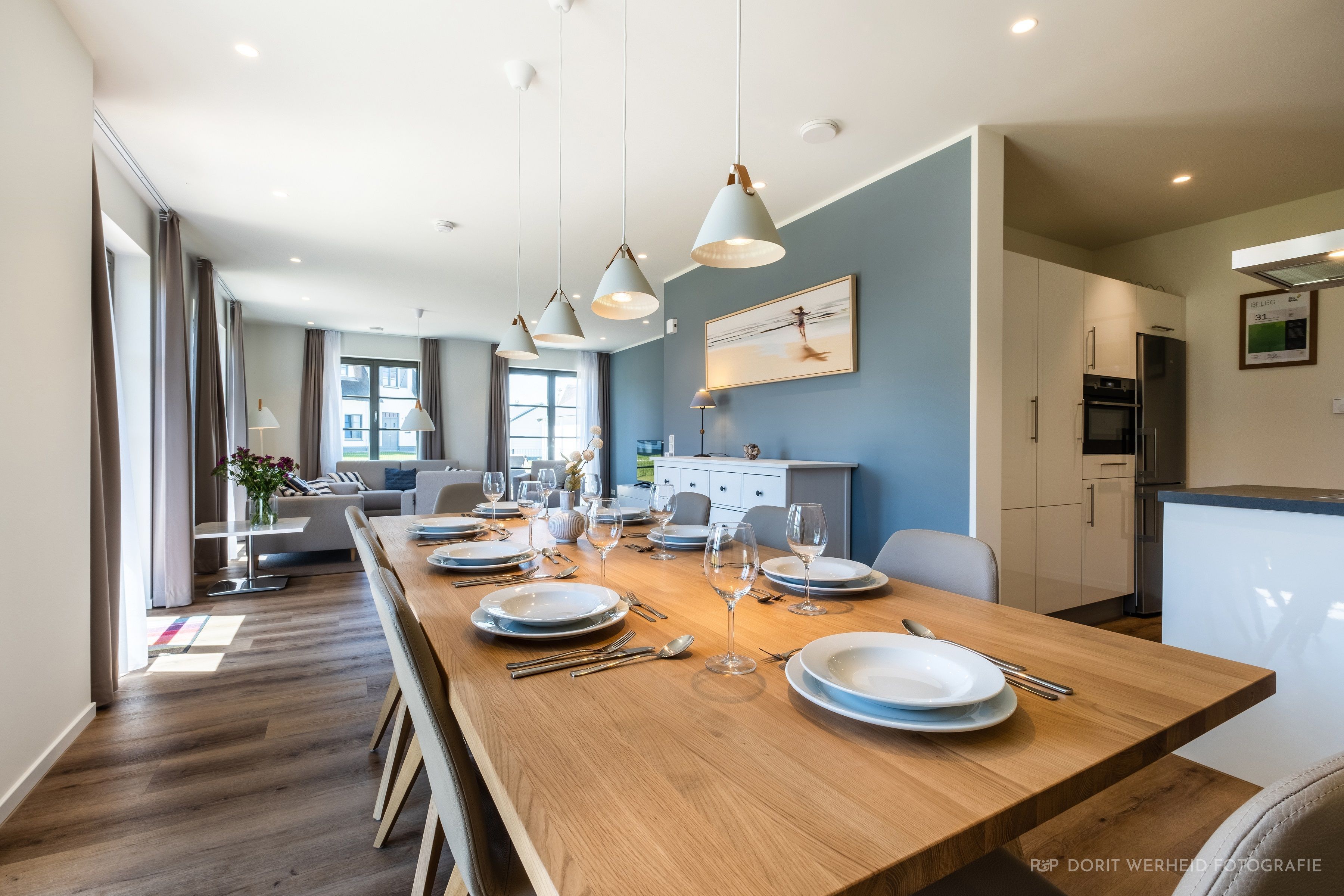 Die moderne Küche ist offen gestaltet und verfügt über ein Cerankochfeld, Backofen, einen Kombi-Gefrierschrank, eine Spülmaschine, eine Kapsel-Kaffeemaschine, Mikrowelle, Wasserkocher, Toaster und vieles mehr.