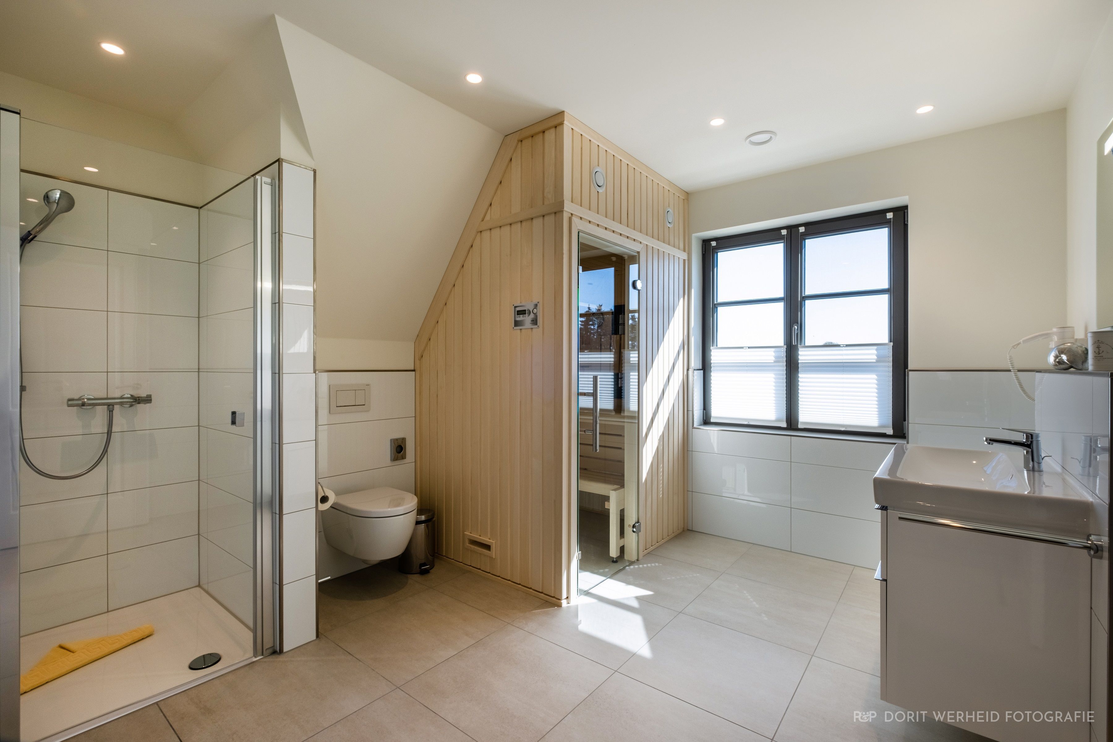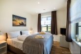Alle Schlafzimmer verfügen über ein Doppelbett (Boxspringbett 1x 1,80m & 1x 1,60m) und Flachbild TV. Das Master- Schlafzimmer verfügt über ein Badezimmer en Suite mit Waschbecken, WC, bodentiefer Dusche und Badewanne. Das andere Badezimmer verfügt ebenfalls über ein Waschbecken, WC, bodentiefe Dusche und zusätzlich über die Kombisauna (Ofen und Infrarot). Ein Fön steht Ihnen ebenfalls zur Verfügung. Die Schlafzimmer sind zudem verdunkelbar.